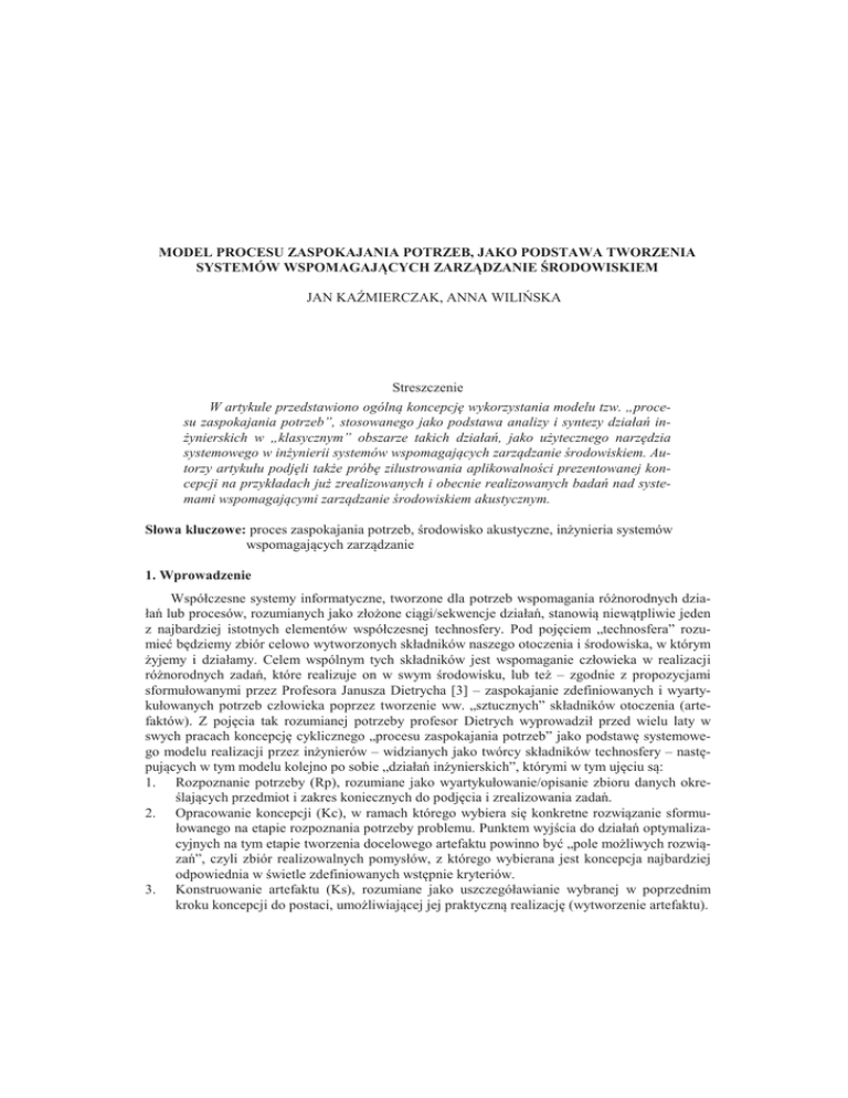 MODEL PROCESU ZASPOKAJANIA POTRZEB, JAKO PODSTAWA TWORZENIA SYSTEMÓW WSPOMAGAJCYCH ZARZDZANIE RODOWISKIEM JAN KAŹMIERCZAK, ANNA WILIŃSKA Streszczenie W artykule przedstawiono ogóln koncepcj wykorzystania modelu tzw. „procesu zaspokajania potrzeb”, stosowanego jako podstawa analizy i syntezy działa inynierskich w „klasycznym” obszarze takich działa, jako uytecznego narzdzia systemowego w inynierii systemów wspomagajcych zarzdzanie rodowiskiem. Autorzy artykułu podjli take prób zilustrowania aplikowalnoci prezentowanej koncepcji na przykładach ju zrealizowanych i obecnie realizowanych bada nad systemami wspomagajcymi zarzdzanie rodowiskiem akustycznym. Słowa kluczowe: proces zaspokajania potrzeb, rodowisko akustyczne, inynieria systemów wspomagajcych zarzdzanie 1. Wprowadzenie Współczesne systemy informatyczne, tworzone dla potrzeb wspomagania rónorodnych działa lub procesów, rozumianych jako złoone cigi/sekwencje działa, stanowi niewtpliwie jeden z najbardziej istotnych elementów współczesnej technosfery. Pod pojciem „technosfera” rozumie bdziemy zbiór celowo wytworzonych składników naszego otoczenia i rodowiska, w którym yjemy i działamy. Celem wspólnym tych składników jest wspomaganie człowieka w realizacji rónorodnych zada, które realizuje on w swym rodowisku, lub te – zgodnie z propozycjami sformułowanymi przez Profesora Janusza Dietrycha [3] – zaspokajanie zdefiniowanych i wyartykułowanych potrzeb człowieka poprzez tworzenie ww. „sztucznych” składników otoczenia (artefaktów). Z pojcia tak rozumianej potrzeby profesor Dietrych wyprowadził przed wielu laty w swych pracach koncepcj cyklicznego „procesu zaspokajania potrzeb” jako podstaw systemowego modelu realizacji przez inynierów – widzianych jako twórcy składników technosfery – nastpujcych w tym modelu kolejno po sobie „działa inynierskich”, którymi w tym ujciu s: 1. Rozpoznanie potrzeby (Rp), rozumiane jako wyartykułowanie/opisanie zbioru danych okrelajcych przedmiot i zakres koniecznych do podjcia i zrealizowania zada. 2. Opracowanie koncepcji (Kc), w ramach którego wybiera si konkretne rozwizanie sformułowanego na etapie rozpoznania potrzeby problemu. Punktem wyjcia do działa optymalizacyjnych na tym etapie tworzenia docelowego artefaktu powinno by „pole moliwych rozwiza”, czyli zbiór realizowalnych pomysłów, z którego wybierana jest koncepcja najbardziej odpowiednia w wietle zdefiniowanych wstpnie kryteriów. 3. Konstruowanie artefaktu (Ks), rozumiane jako uszczegóławianie wybranej w poprzednim kroku koncepcji do postaci, umoliwiajcej jej praktyczn realizacj (wytworzenie artefaktu). 122 Jan Kamierczak, Anna Wiliska Model procesu zaspokajania potrzeb, jako podstawa tworzenia systemów wspomagajcych zarzdzanie rodowiskiem 4. Wytwarzanie artefaktu (Wt), obejmujce zbiór czynnoci w wyniku których powstaje gotowy do uycia wytwór (materialny) lub utwór (w tej kategorii mieci si moe np. narzdzie informatyczne). 5. Eksploatacja artefaktu (Ep), czyli etap procesu zaspokajania potrzeb, w którym wytworzony artefakt jest uytkowany zgodnie z przeznaczeniem. Ten etap procesu zaspokajania potrzeby „domyka” cykl: obserwacje, zebrane w toku uytkowania mog (powinny?) by podstaw do przedefiniowania (uzupełnienia, zmiany) pierwotnego opisu potrzeby lub okrelenia nowej potrzeby/potrzeb. To z kolei umoliwia „wejcie” w kolejny cykl objtej omawianym modelem sekwencji działa. W pierwotnym załoeniu, koncepcja cyklicznego procesu zaspokajania potrzeb dotyczyła „klasycznych” zada inynierskich, ukierunkowanych na projektowanie, konstruowanie, wytwarzanie i uytkowanie „klasycznych” artefaktów, tzn. maszyn, urzdze, budowli itp. Jednake dowiadczenia, zebrane w toku bada prowadzonych od wielu lat na Wydziale Organizacji i Zarzdzania Politechniki lskiej – pocztkowo w Katedrze Podstaw Systemów Technicznych, obecnie w Instytucie Inynierii Produkcji – daj silne przesłanki do twierdzenia, i model ten moe by skutecznie wykorzystany, jako podstawa metodologiczna dla prac w obszarze inynierii systemów informatycznych, tworzonych dla potrzeb wspomagania rónorodnych zada i procesów. Podejcie takie zastosowano ju w toku realizacji projektu badawczego, zorientowanego na opracowanie metodologii wspomagania projektowania i konstruowania rodków biernej redukcji hałasu. Badania takie zostały przeprowadzone w latach 1995–1998 i były finansowane ze rodków KBN w ramach celowego projektu badawczego (nr 707B00408) [7]. Jako punkt wyjcia w badaniach przeprowadzono analiz algorytmów projektowania i konstruowania typowych rodków biernej redukcji hałasu. Na podstawie uzyskanych wyników analizy moliwe stało si opracowanie tzw. „algorytmu ogólnego”, jako podstawy identyfikacji podatnoci na wspomaganie komputerowe zada projektowo-konstrukcyjnych mieszczcych si w ramach algorytmu. Natomiast w niniejszym opracowaniu autorzy podejmuj prób zilustrowania tezy o przydatnoci modelu procesu zaspokajania potrzeb, jako metodologicznej podstawy tworzenia informatycznych systemów wspomagajcych na przykładzie bada, rozpocztych w latach 1999–2000. W kolejnej czci artykułu omówiono w duym skrócie załoenia oraz realizacj celowego projektu badawczego Nr 6T07 2002/C.05779 “Opracowanie krajowego systemu tworzenia i eksploatacji cyfrowych map akustycznych duych i rednich miast dla potrzeb profesjonalnego planowania przestrzennego i celów szkoleniowych”, realizowanego (jako wspólne przedsiwzicie czterech jednostek naukowo-badawczych) przy współfinansowaniu ze rodków Komitetu Bada Naukowych oraz budetów władz samorzdowych. Opis tego projektu został przedstawiony w sposób, nawizujcy do modelu procesu cyklu zaspokajania potrzeb, a podsumowanie tego opisu przedstawia mechanizm przejcia do kolejnego cyklu działa, którego podstaw jest informacja pozyskana w cyklu pierwotnym. Taka włanie informacja była podstaw przygotowania koncepcyjnego dla nowego p