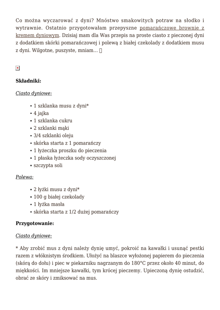 Co można wyczarować z dyni? Mnóstwo smakowitych potraw na słodko i wytrawnie. Ostatnio przygotowałam przepyszne pomarańczowe brownie z kremem dyniowym. Dzisiaj mam dla Was przepis na proste ciasto z pieczonej dyni z dodatkiem skórki pomarańczowej i polewą z białej czekolady z dodatkiem musu z dyni. Wilgotne, puszyste, mniam… Składniki: Ciasto dyniowe: 1 szklanka musu z dyni* 4 jajka 1 szklanka cukru 2 szklanki mąki 3/4 szklanki oleju skórka starta z 1 pomarańczy 1 łyżeczka proszku do pieczenia 1 płaska łyżeczka sody oczyszczonej szczypta soli Polewa: 2 łyżki musu z dyni* 100 g białej czekolady 1 łyżka masła skórka starta z 1/2 dużej pomarańczy Przygotowanie: Ciasto dyniowe: * Aby zrobić mus z dyni należy dynię umyć, pokroić na kawałki i usunąć pestki razem z włóknistym środkiem. Ułożyć na blaszce wyłożonej papierem do pieczenia (skórą do dołu) i piec w piekarniku nagrzanym do 180°C przez około 40 minut, do miękkości. Im mniejsze kawałki, tym krócej pieczemy. Upieczoną dynię ostudzić, obrać ze skóry i zmiksować na mus. Do miski wsypać przesianą mąkę, cukier, proszek do pieczenia, sodę oczyszczoną, szczyptę soli i wymieszać. Wbić jajka, dodać olej, mus z dyni i startą skórkę z pomarańczy. Wszystko razem mieszać, ale nie za długo, tylko do połączenia składników. Dno tortownicy o średnicy 24-25 cm wyłożyć papierem do pieczenia, boki delikatnie wysmarować masłem lub olejem. Wlać ciasto i wyrównać. Piec w piekarniku nagrzanym do 175°C przez około 40 minut (do tzw. suchego patyczka). Polewa: Masło i czekoladę roztopić w kąpieli wodnej. Dodać startą skórkę pomarańczową i mus z dyni. Dokładnie wymieszać, ostudzić i wstawić do lodówki, aby lekko zgęstniała. Następnie polać ciasto, schłodzić. Smacznego Knedle z pieczonej dyni nadziewane wyjątkowo zdrowym amarantusem, który jest bogatym źródłem białka i żelaza. Warto spożywać go jak najczęściej i włączyć go do codziennej diety. Do tego przygotowałam równie zdrowego, pieczonego halibuta o wyjątkowo delikatnym i pysznym mięsie oraz purée z pieczonej papryki. Danie ładnie się prezentuje i smakuje wybornie. Polecam Składniki: Knedle dyniowe: 3/4 szklanki musu z dyni* + 1 łyżka 500 g ziemniaków 1 jajko 1 i 1/2 szklanki mąki pszennej 1 łyżka mąki ziemniaczanej 1 szklanka ziaren amarantusa 1 mała cebula 1 i 1/2 szklanki bulionu 1 łyżka oliwy z oliwek sól pieprz Purée z papryki: 2 papryki czerwone 1 łyżeczka oliwy z oliwek sól pieprz lub szczypta chilli Halibut: 500 g filetu z halibuta (bez skóry) 1 łyżka oliwy z oliwek 1 łyżeczka soku z cytryny sól pieprz Przygotowanie: Knedle dyniowe: Na patelni rozgrzać oliwę z oliwek i wrzucić drobno posiekaną cebulkę. Zrumienić. Wsypać amarantus i wlać bulion. Dusić pod przykryciem około 25 minut, pamiętając aby co jakiś czas mieszać. W razie potrzeby dolać odrobinę bulionu. Zdjąć pokrywkę, dodać odłożoną łyżkę musu z dyni i chwilę gotować aby pozbyć się nadmiaru płynu. * Aby zrobić mus z dyni należy dynię umyć, pokroić na kawałki i usunąć pestki razem z włóknistym środkiem. Ułożyć na blaszce wyłożonej papierem do pieczenia (skórą do dołu) i piec w piekarniku nagrzanym do 180°C przez około 40 minut, do miękkości. Im mniejsze kawałki, tym krócej pieczemy. Upieczoną dynię ostudzić, obrać ze skóry i zmiksować na mus. Ziemniaki obrać i ugotować w osolonej wodzie. Odcedzić i przecisnąć przez praskę do ziemniaków. Ostudzić. Następnie dodać mus z dyni, jajko, mąkę pszenną, mąkę ziemniaczaną i szczyptę soli. Zagniatać ciasto aż składniki się połączą (im krócej tym lepiej!). Gdyby ciasto było za rzadkie dodać trochę więcej mąki, ale nie za dużo bo knedle wyjdą za twarde. Następnie oderwać trochę ciasta, spłaszczyć dłonią i nałożyć farsz. Dokładnie skleić tworząc kulki. Wkładać do gotującej się, osolonej wody i gotować na mniejszym ogniu przez około 4 minuty (od czasu wypłynięcia na powierzchnię). W międzyczasie przemieszać. Wyjąć łyżką cedzakową. Purée z papryki: Papryki przekroić na pół i usunąć gniazda nasienne. Delikatnie natrzeć oliwą z oliwek, układać na blaszce wyłożonej papierem do pieczenia i wstawić do piekarnika rozgrzanego do 170’C na 25 minut. Następnie zdjąć skórkę i zmiksować z oliwą z oliwek na gładkie purée. Doprawić solą i pieprzem. Halibut: Filet z halibuta pokroić na porcje, delikatnie natrzeć oliwą z oliwek, skropić sokiem z cytryny i doprawić solą i pieprzem. Przełożyć na blaszkę wyłożoną papierem do pieczenia. Wstawić do piekarnika nagrzanego do 195°C i piec przez około 15 minut. Smacznego #Ambition Rydze to jedne z moich ulubionych grzybów, za którymi z utęsknieniem czekam przez cały rok. Wyśmienite! Aby cieszyć się ich wyjątkowym smakiem wystarczy usmażyć je na maśle i podać np. ze świeżym pieczywem. Dzisiejsza wersja jest z kopytkami i szczyptą świeżego rozmarynu dla podkreślenia smaku. Do smażenia rydzów zamiast masła z olejem można użyć masła klarowanego. Polecam Składniki: Kopytka: 600 g ziemniaków 1 szklanka mąki pszennej 1 pełna łyżka mąki ziemniaczanej 1 jajko szczypta soli Smażone rydze: 500 g rydzów 1 pełna łyżka masła 2 łyżki oleju sól mała szczypta pieprzu Dodatkowo: szczypta posiekanych listków rozmarynu Przygotowanie: Kopytka: Ziemniaki obrać i ugotować w osolonej wodzie. Odcedzić i przecisnąć przez praskę do ziemniaków. Ostudzić. Następnie dodać jajko, mąkę pszenną, mąkę ziemniaczaną i szczyptę soli. Zagniatać ciasto aż składniki się połączą (im krócej tym lepiej!). Formować wałeczki grubości kciuka (podsypując mąką) i pod skosem odcinać „kopytka” o szerokości około 1,5 cm. Gotować na mniejszym ogniu w osolonym wrzątku przez około 3 minuty (od czasu wypłynięcia na powierzchnię). W międzyc