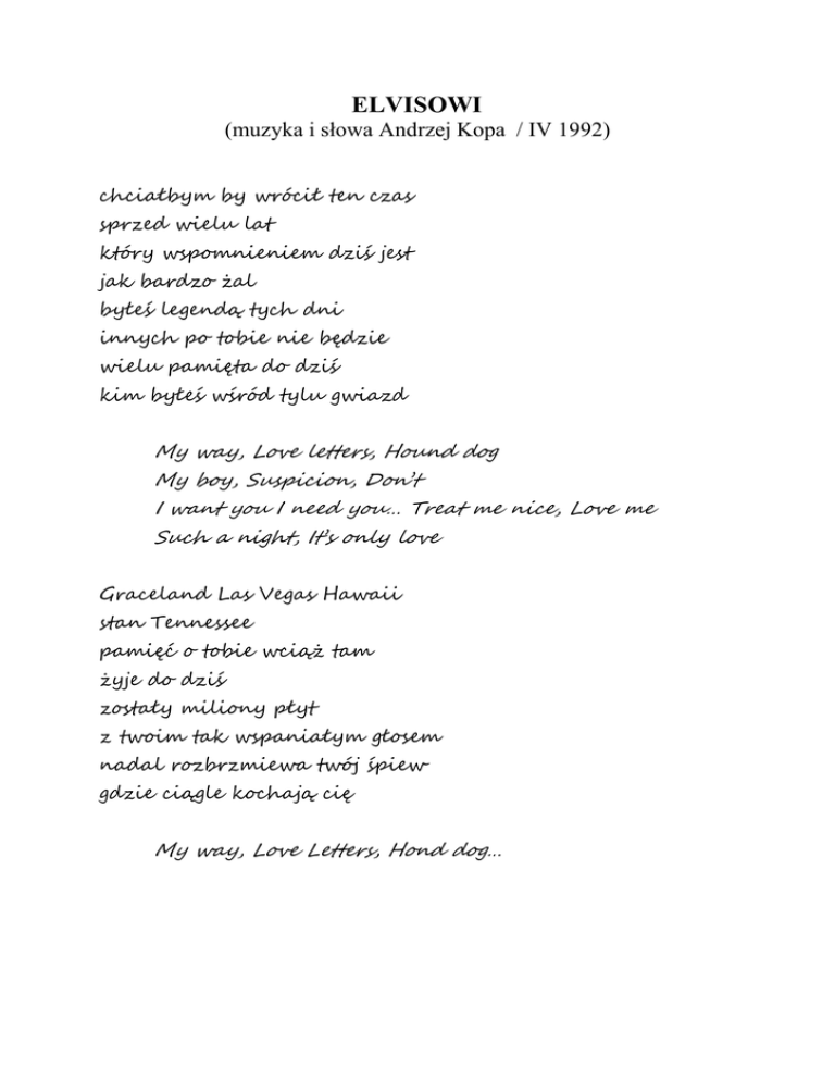 ELVISOWI (muzyka i słowa Andrzej Kopa / IV 1992) chciałbym by wrócił ten czas sprzed wielu lat który wspomnieniem dziś jest jak bardzo żal byłeś legendą tych dni innych po tobie nie będzie wielu pamięta do dziś kim byłeś wśród tylu gwiazd My way, Love letters, Hound dog My boy, Suspicion, Don’t I want you I need you… Treat me nice, Love me Such a night, It’s only love Graceland Las Vegas Hawaii stan Tennessee pamięć o tobie wciąż tam żyje do dziś zostały miliony płyt z twoim tak wspaniałym głosem nadal rozbrzmiewa twój śpiew gdzie ciągle kochają cię My way, Love Letters, Hond dog…