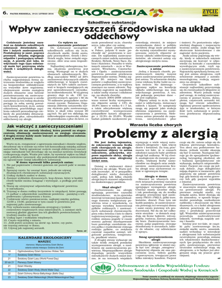 6. PIĄTEK-NIEDZIELA, 19-21 LUTEGO 2016 Szkodliwe substancje Wpływ zanieczyszczeń środowiska na układ oddechowy Codziennie jesteśmy narażeni na działanie szkodliwych substancji: dwutlenków, pyłów i innych zanieczyszczeń. Produkujemy je sami, poprzez przemysł, kiepską segregację odpadów i postępującą urbanizację. A prawda jest taka, że wdychanie tego typu substancji może być przyczyną wielu chorób i uciążliwych dolegliwości. Zanieczyszczenie powietrza to chyba najgroźniejsza forma zatruwania środowiska ze względu na bezpośrednie oddziaływanie na wszystkie żywe organizmy, obejmowanie swoim zasięgiem dużych obszarów oraz łatwość przemieszczania się zanieczyszczeń. Stałe przebywanie w strefie narażonej na ten rodzaj skażenia pociąga za sobą szereg poważnych konsekwencji, m.in. astmy oskrzelowej, przewlekłego zapalenia oskrzeli prowadzącego niekiedy do przewlekłej obturacyjnej choroby płuc, niewydolności oddechowej czy alergii. Co wpływa na zanieczyszczenie powietrza? Do substancji szczególnie szkodliwych zalicza się m.in. dwutlenek siarki, tlenki azotu, pyły przemysłowe, tlenek i dwutlenek węgla, lotne związki organiczne, ołów oraz ozon troposferyczny. Najbardziej niebezpieczną formą skażenia powietrza jest smog. Występuje on w dużych obszarach zabudowanych. Według szacunków WHO od 20% zachorowań dotyczących układu oddechowego w krajach rozwiniętych do 42% takich zachorowań w krajach rozwijających się jest spowodowanych czynnikami środowiskowymi. W tej górnej granicy daje to ok. 130 tys. przedwczesnych zgonów i 50 do 70 milionów przypadków zachorowań rocznie. Światowa Organizacja Zdrowia ustanowiła normę stężenia pyłu zawieszonego, która w skali roku wynosi 20 μg/m3. Na pył ten składają się mikroskopijne cząsteczki, zdolne do przenikania z płuc do krwi, co Jak walczyć z zanieczyszczeniami Niestety nie ma metody idealnej, która pozwoli na stuprocentową eliminację zanieczyszczeń ze swojego otoczenia. Z drugiej strony każdy może walczyć ze szkodliwymi substancjami w swoim domu. Warto m.in. rezygnować z ogrzewania mieszkań i domów węglem, decydować się w sezonie na rower lub komunikację miejską zamiast samochodu. Należy ograniczać zużycie energii elektrycznej uszczelniając mieszkanie lub decydując się na montaż systemu wentylacji z rekuperacją ciepła. Ważne jest także, by wywierać wpływ na lokalnych polityków i przemysł, aby podejmowali działania zorientowane na ograniczanie emisji szkodliwych substancji. W domu wprowadź kilka prostych zmian: 1. Nie pal papierosów i również gościom nie pozwól palić w swoim domu. 2. Sprzątaj często, by usunąć kurz, jednak nie używaj drażniących chemicznych substancji czyszczących. 3. Unikaj ciężkich zasłon w domu. 4. Zamiast wykładzin dywanowych, kup dywan, który w każdej chwili będzie można ściągnąć i wytrzepać, a podłogę pod nim umyć. 5. Staraj się utrzymywać odpowiednią wilgotność powietrza w mieszkaniu. 6. Trzymaj w domu rośliny (oczywiście te niepylące), które pomogą Ci zadbać o odpowiednie nawilżenie powietrza - pamiętaj o ich podlewaniu i przemywaniu z kurzu. 7. Codziennie wietrz pomieszczenia, najlepiej między godziną 12:00 a 15:00, ponieważ w tym czasie w powietrzu jest najmniej pyłu zawieszonego. 8. Przy wykańczaniu mieszkania zrezygnuj z tynków cementowo-wapiennych oraz mineralnych, a zamiast nich zastosuj gładzie gipsowe (na ich gładkich powierzchniach trudniej osadza się kurz). 9. Unikaj tapet i wykładzin winylowych. 10. Często wyjeżdżaj z miasta. 11. Jeśli jesteś uczulony na sierść np. kotów, czy psów, nie trzymaj zwierząt w domu. 12. Używaj jak najmniej aerozoli. Oprac. ad KALENDARZ EKOLOGICZNY MARZEC równonoc: Międzynarodowy Dzień Słońca ostania sobota miesiąca: Godzina dla Ziemi 14 Ogólnoświatowy Dzień Sprzeciwu Wobec Tam 17 Światowy Dzień Morza 21 Światowy Dzień Lasu (World Forest Day) 20 lub 21 może powodować m.in. choroby serca, raka płuc czy astmę. Z 65 miast przebadanych w Polsce, jedynie 6 może „pochwalić się” powietrzem w normie. Do najbardziej zanieczyszczonych miast należą natomiast: Kraków, Rybnik, Nowy Sącz, Zabrze i Katowice. Ponadto w wielu innych miastach – m.in w Warszawie, Wrocławiu, Częstochowie i Opolu – zanieczyszczenie powietrza poważnie przekracza dopuszczalne normy. Polska zajmuje 20. miejsce na liście państw z najbardziej zanieczyszczonym powietrzem, a to wpływa znacząco na nasze zdrowie. Najbardziej zagrożeni są najmłodsi, a także osoby starsze i osłabione np. na skutek choroby. W latach 2004-2008 odnotowano wzrost liczby występowania objawów astmy z 13% do 18,8% dzieci w wieku 6 i 7 lat, a także zdecydowanie większą częstotliwość występowania przypadków kataru alergicznego: z 12,5% do 23,6%. Wyniki badań polskich naukowców po- twierdzają również, że miejsce zamieszkania dzieci w pobliżu ruchliwej drogi może prowadzić do wyższej częstotliwości występowania ostrych objawów ze strony układu oddechowego np. świstów, ale również astmy czy alergicznego nieżytu nosa. Zanieczyszczenie powietrza a astma Jedną z licznych chorób, powodowanych między innymi przez zanieczyszczone powietrze, jest astma. To schorzenie dotyka coraz większą liczbę ludzi na całym świecie. Nic dziwnego – ogromny wpływ na kondycję układu oddechowego ma stan wdychanego powietrza. A ten, jak pokazują powyższe dane – nie jest najlepszy. Objawy astmy to m.in. trudności w oddychaniu, świszczący oddech i kaszel. Te symptomy mogą się pojawić jako reakcja obronna organizmu na zanieczyszczenia z powietrza. Nieleczona astma prowadzi do zapalenia, niewydolności płuc i śmierci. Po postawieniu odpowiedniej diagnozy i rozpoczęciu leczenia astmy, ataki mogą być skutecznie kontrolowane i nie zagrażać życiu pacjenta. Ataki astmy pojawiają się wtedy, kiedy w oskrzelach mięśnie za