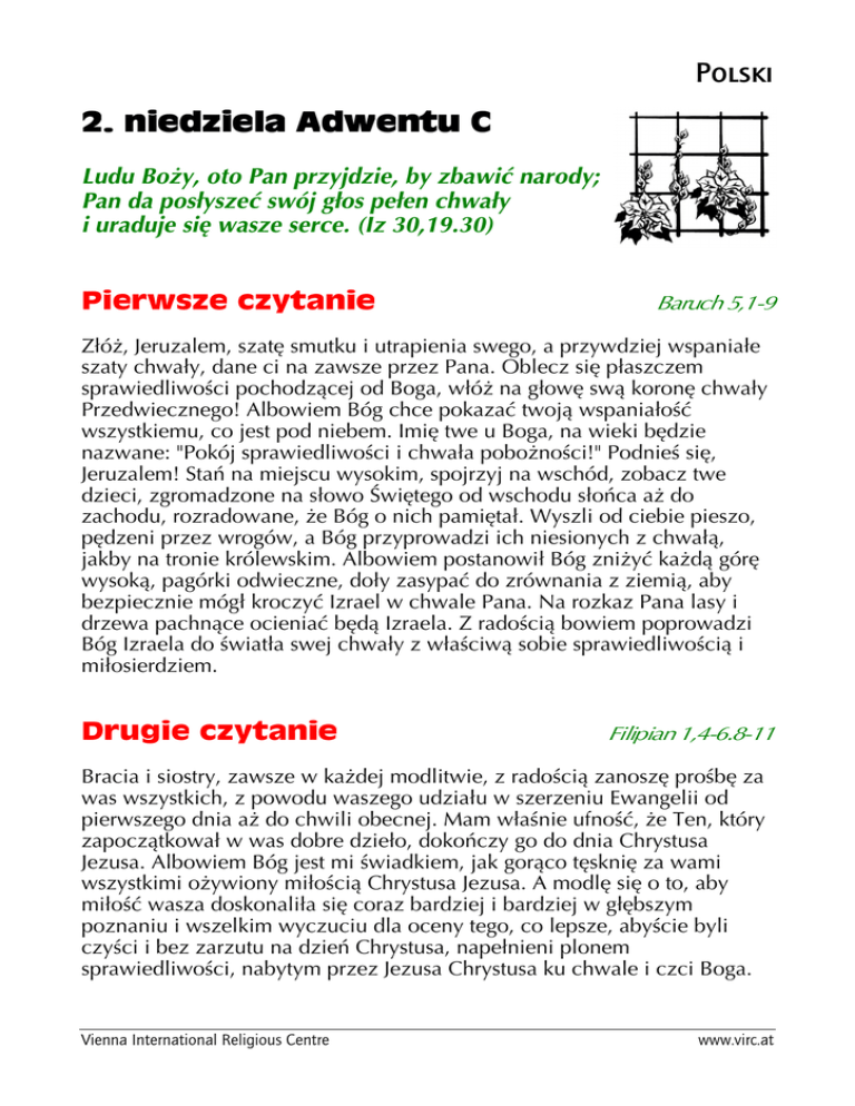 Polski Ludu Boży, oto Pan przyjdzie, by zbawić narody; Pan da posłyszeć swój głos pełen chwały i uraduje się wasze serce. (Iz 30,19.30) Złóż, Jeruzalem, szatę smutku i utrapienia swego, a przywdziej wspaniałe szaty chwały, dane ci na zawsze przez Pana. Oblecz się płaszczem sprawiedliwości pochodzącej od Boga, włóż na głowę swą koronę chwały Przedwiecznego! Albowiem Bóg chce pokazać twoją wspaniałość wszystkiemu, co jest pod niebem. Imię twe u Boga, na wieki będzie nazwane: "Pokój sprawiedliwości i chwała pobożności!" Podnieś się, Jeruzalem! Stań na miejscu wysokim, spojrzyj na wschód, zobacz twe dzieci, zgromadzone na słowo Świętego od wschodu słońca aż do zachodu, rozradowane, że Bóg o nich pamiętał. Wyszli od ciebie pieszo, pędzeni przez wrogów, a Bóg przyprowadzi ich niesionych z chwałą, jakby na tronie królewskim. Albowiem postanowił Bóg zniżyć każdą górę wysoką, pagórki odwieczne, doły zasypać do zrównania z ziemią, aby bezpiecznie mógł kroczyć Izrael w chwale Pana. Na rozkaz Pana lasy i drzewa pachnące ocieniać będą Izraela. Z radością bowiem poprowadzi Bóg Izraela do światła swej chwały z właściwą sobie sprawiedliwością i miłosierdziem. Bracia i siostry, zawsze w każdej modlitwie, z radością zanoszę prośbę za was wszystkich, z powodu waszego udziału w szerzeniu Ewangelii od pierwszego dnia aż do chwili obecnej. Mam właśnie ufność, że Ten, który zapoczątkował w was dobre dzieło, dokończy go do dnia Chrystusa Jezusa. Albowiem Bóg jest mi świadkiem, jak gorąco tęsknię za wami wszystkimi ożywiony miłością Chrystusa Jezusa. A modlę się o to, aby miłość wasza doskonaliła się coraz bardziej i bardziej w głębszym poznaniu i wszelkim wyczuciu dla oceny tego, co lepsze, abyście byli czyści i bez zarzutu na dzień Chrystusa, napełnieni plonem sprawiedliwości, nabytym przez Jezusa Chrystusa ku chwale i czci Boga. Vienna International Religious Centre www.virc.at Było to w piętnastym roku rządów Tyberiusza Cezara. Gdy Poncjusz Piłat był namiestnikiem Judei, Herod tetrarchą Galilei, brat jego Filip tetrarchą Iturei i kraju Trachonu, Lizaniasz tetrarchą Abileny; za najwyższych kapłanów Annasza i Kajfasza skierowane zostało słowo Boże do Jana, syna Zachariasza, na pustyni. Obchodził więc całą okolicę nad Jordanem i głosił chrzest nawrócenia na odpuszczenie grzechów, jak jest napisane w księdze mów proroka Izajasza: "Głos wołającego na pustyni: Przygotujcie drogę Panu, prostujcie ścieżki dla Niego; każda dolina niech będzie wypełniona, każda góra i pagórek zrównane, drogi kręte niech staną się prostymi, a wyboiste drogami gładkimi. I wszyscy ludzie ujrzą zbawienie Boże". Ciągle chodzi o prawidłowe spotkanie z Bogiem, z innymi, z sobą samym. W spotkaniu z Bogiem decydującą rolę odgrywa miłosierdzie, zaufanie i nawrócenie. Miłosierdzie jest decydującą siłą każdego spotkania i każdej relacji. Ono jest najpierw udzielane nam przez Boga – nie mylmy tego z litością. Gdy Bóg okazuje nam miłosierdzie, oznacza to, że On kocha nas bezwarunkowo i przyjmuje pomimo wszelkich zastrzeżeń, które według nas czynią nas niegodnymi miłości, i z naszego punktu widzenia orzekają przeciwko nam. Bóg kocha nas pomimo naszej ułomności i niegodności, nawet pomimo naszego sprzeciwu, aby otworzyć się całkowicie na Niego. Jesteśmy zaproszeni do takiej formy miłosierdzia, do nawrócenia i do takiego zwrócenia się całym sercem do miłosiernego Pana, abyśmy, czerpiąc z takiego punktu widzenia, byli zdolnymi do spotkania z Bogiem. Wówczas możemy być miłosiernymi względem nas samych i bliźnich oraz mamy szansę przebaczać. Nawrócenie oznacza przede wszystkim ponowne uczenie się słuchania słowa Bożego (duchem, ciałem i duszą). Kilka małych kroków może nam w tym dopomóc: – kilka razy w ciągu dnia skupić się wewnętrznie i niczego nie robić; – każdego dnia przeznaczyć określony czas na modlitwę; – przed pójściem spać prześledzić dzień wspólnie z Bogiem. To czyni nas wrażliwymi na Bożą obecność w ciągu dnia w doświadczeniach pozytywnych i negatywnych; – budzić się ze świadomością, że Bóg daje każdy dzień, a zasypiać ze świadomością oddawania dnia miłosiernemu Bogu ze wszystkim co pozytywne i negatywne. Małe kroki, które powinny nam pomóc, uczynić przestrzeń dla Bożej drogi do nas. Tylko wówczas, gdy z zaufaniem przyjmiemy to, co On do nas mówi, możliwe jest głębokie spotkanie z Nim. Czas Adwentu chce nam dopomóc w podjęciu stałej rozmowy i spotkania z Panem. Vienna International Religious Centre [email protected]
