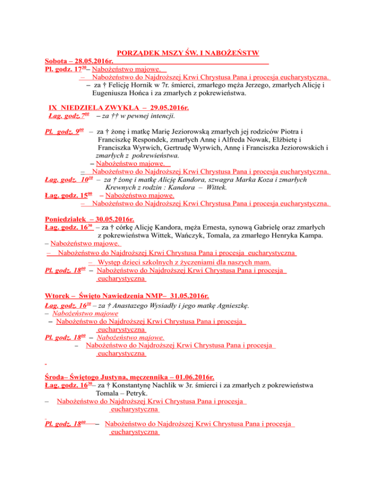 PORZĄDEK MSZY ŚW. I NABOŻEŃSTW Sobota – 28.05.2016r. Pl. godz. 1730– Nabożeństwo majowe. – Nabożeństwo do Najdroższej Krwi Chrystusa Pana i procesja eucharystyczna. – za † Felicję Hornik w 7r. śmierci, zmarłego męża Jerzego, zmarłych Alicję i Eugeniusza Hońca i za zmarłych z pokrewieństwa. IX NIEDZIELA ZWYKŁA – 29.05.2016r. Łag. godz.700 – za †† w pewnej intencji. Pl. godz. 900 – za † żonę i matkę Marię Jeziorowską zmarłych jej rodziców Piotra i Franciszkę Respondek, zmarłych Annę i Alfreda Nowak, Elżbietę i Franciszka Wyrwich, Gertrudę Wyrwich, Annę i Franciszka Jeziorowskich i zmarłych z pokrewieństwa. – Nabożeństwo majowe. – Nabożeństwo do Najdroższej Krwi Chrystusa Pana i procesja eucharystyczna. Łag. godz. 1030 – za † żonę i matkę Alicję Kandora, szwagra Marka Koza i zmarłych Krewnych z rodzin : Kandora – Wittek. Łag. godz. 1500 – Nabożeństwo majowe. – Nabożeństwo do Najdroższej Krwi Chrystusa Pana i procesja eucharystyczna. Poniedziałek – 30.05.2016r. Łag. godz. 1630 – za † córkę Alicję Kandora, męża Ernesta, synową Gabrielę oraz zmarłych z pokrewieństwa Wittek, Wańczyk, Tomala, za zmarłego Henryka Kampa. – Nabożeństwo majowe. – Nabożeństwo do Najdroższej Krwi Chrystusa Pana i procesja eucharystyczna – Występ dzieci szkolnych z życzeniami dla naszych mam. Pl. godz. 1800 – Nabożeństwo do Najdroższej Krwi Chrystusa Pana i procesja eucharystyczna Wtorek – Święto Nawiedzenia NMP– 31.05.2016r. Łag. godz. 1630 – za † Anastazego Wysiadły i jego matkę Agnieszkę. – Nabożeństwo majowe – Nabożeństwo do Najdroższej Krwi Chrystusa Pana i procesja eucharystyczna Pl. godz. 1800 – Nabożeństwo majowe. – Nabożeństwo do Najdroższej Krwi Chrystusa Pana i procesja eucharystyczna Środa– Świętogo Justyna, męczennika – 01.06.2016r. Łag. godz. 1630– za † Konstantynę Nachlik w 3r. śmierci i za zmarłych z pokrewieństwa Tomala – Petryk. – Nabożeństwo do Najdroższej Krwi Chrystusa Pana i procesja eucharystyczna Pl. godz. 1800 – Nabożeństwo do Najdroższej Krwi Chrystusa Pana i procesja eucharystyczna Czwartek – 02.06.2016r. Łag. godz. 1630 – O powołania kapłańskie i zakonne. – Nabożeństwo do Najdroższej Krwi Chrystusa Pana i procesja eucharystyczna Pl. godz.1800 – Msza św. Szkolna. – za † Krystynę Ulfik w 1r. śmieci – Nabożeństwo do Najdroższej Krwi Chrystusa Pana i procesja eucharystyczna Piątek– UROCZYSTOŚĆ NAJŚWIETSZEGO SERCA PANA JEZUSA – 03.06.2016r. Łag. godz. 1630 – Msza św. Szkolna i Młodzieżowa. – W intencji czcicieli Boskiego Serca Jezusowego. Pl., godz. 1800 – Msza św. Młodzieżowa. – W intencji czcicieli Boskiego Serca Jezusowego. – za zmarłą matkę Annę Młynek, ojca Emila, rodzinę Budzyńskich, Gertrudę Brommer, siostrę zakonną Hildeburgis, zmarłych dziadków i dusze w czyśćcu cierpiące. Sobota – Niepokalanego Serca NMP – 04.06.2016r. Łag. godz. 1200 Rzymski ślub : Kandora Justyna – Brodacki Łukasz Łag. godz. 1600 – za †† rodziców Gertrudę i Piotra Zemela, dwóch synów, synową Helenę z synem Stanisławem, zmarłych rodziców Małek, pokrewieństwo Zemela – Seifert – Chrzest dziecka Emilii Patrycji Koza. 00 Pl. godz. 18 – za † męża Eryka Bonk, rodziców Jana i Marię Piekatz, Augustyna i Paulinę Bonk, brata Ewalda Piekatz, Krystynę Szarwaryn i za zmarłych krewnych. – W intencji Anety Lehmann z okazji 18r.urodzin z podziękowaniem za odebrane łaski z prośbą o dalsze oraz o dary Ducha Świętego i dobre rozeznanie drogi życiowej. X NIEDZIELA ZWYKŁA – 05.06.2016r. Łag. godz.700 – za † matkę Krystynę Strzelczyk w 4r. śmierci, za zmarłego ojca Pawła, Gertrudę i Franciszka Respondek z córką Elżbietą z mężem Rainoldem i synową Stefanią, Albinę i Dominika Strzelczyk z córkami Hildegardą i Anną a także za dusze w czyśćcu cierpiące. Pl. godz. 900 – za † ojca Antoniego Kandora w rocznicę urodzin oraz za zmarłego Ireneusza Magnes, zmarłych z pokrewieństwa Kala, Symala, Majksner, Wańczyk i Kandora. Łag. godz. 1030 – Roczki : Do Anioła Stróża w intencji rocznego dziecka Nikodema Paruzel, a także za rodziców i chrzestnych. 00 Łag. godz. 15 – Nabożeństwo do Serca Pana Jezusa. OGŁOSZENIA PARAFIALNE. W przyszłą niedzielę kolekta specjalna na remonty kościołów i plebani, także w przyszłą niedzielę zbiórka do puszek przed kościołem na Świątynię Opatrzności Bożej. W tym tygodniu w Uroczystość Najświętszego Serca Pana Jezusa ( Światowy Dzień Modlitw o Uświęcenie Kapłanów i święto patronalne Diecezjalnego Dzieła Modlitwy w Intencji Kapłanów „ Oremus ‘. W tym tygodniu przypada I czwartek, piątek i sobota miesiąca. W piątek o godz. 830 odwiedzenie chorych. W przyszłą niedzielę - 5 czerwca na Górze Św. Anny pielgrzymka Mniejszości Narodowych. Okazja do spowiedzi świętej w Pludrach w środę po nabożeństwie eucharystycznym, a w Łagiewnikach Małych w piątek o godz. 1530. Próba dla młodzieży klas III gimnazjalnych przed przyjęciem Sakramentu Bierzmowania w poniedziałek 30 maja o godz. 1845 w Kolonowskiem, a uroczyste przyjęcie tego Sakramentu we wtorek 31 maja o godz.1630 w tejże parafii. W czwartek na zakończenie oktawy Bożego Ciała – poświęcenie wianków i ziół. Dziękuję za zbudowanie czterech ołtarzy eucharystycznych na Uroczystość Bożego Ciała i za przyozdobienie domów religijnymi obrazami i symbolami wzdłuż trasy procesji.