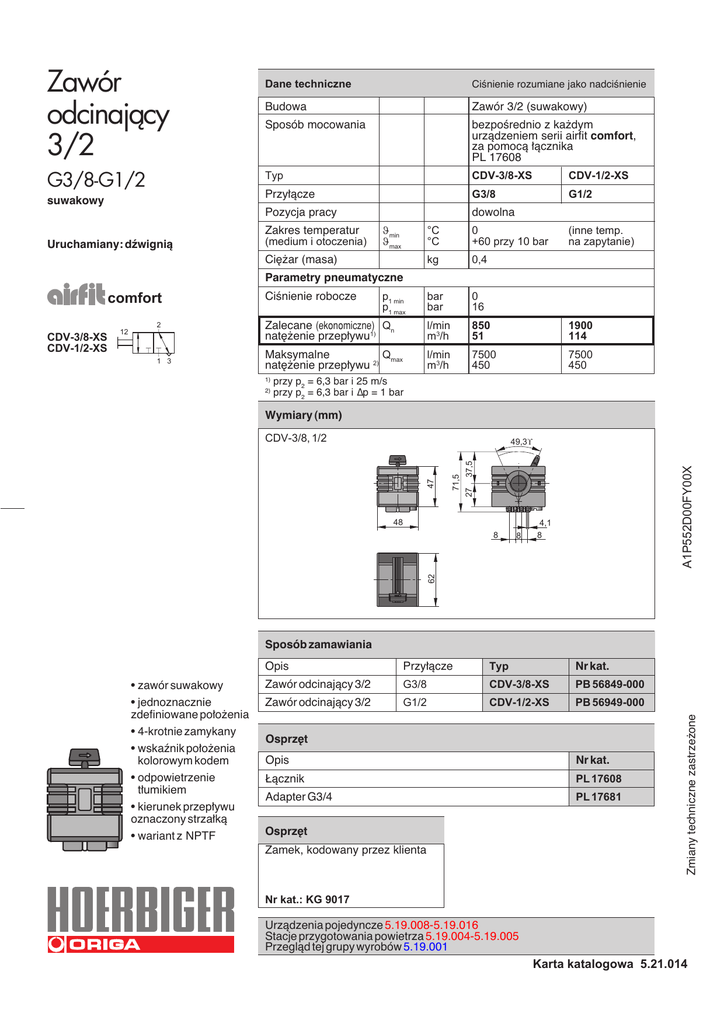 Zawór odcinajàcy 3/2 G3/8-G1/2 suwakowy Uruchamiany: dêwignià Dane techniczne CiÊnienie rozumiane jako nadciÊnienie Budowa Zawór 3/2 (suwakowy) Sposób mocowania bezpoÊrednio z ka˝dym urzàdzeniem serii airfit comfort, za pomocà ∏àcznika PL 17608 Typ CDV-3/8-XS CDV-1/2-XS Przy∏àcze G3/8 G1/2 Pozycja pracy dowolna Zakres temperatur (medium i otoczenia) ϑmin ϑmax °C °C 0 +60 przy 10 bar kg 0,4 bar bar 0 16 Zalecane (ekonomiczne) Qn nat´˝enie przep∏ywu1) l/min m3/h 850 51 1900 114 Maksymalne Qmax nat´˝enie przep∏ywu 2) l/min m3/h 7500 450 7500 450 Ci´˝ar (masa) (inne temp. na zapytanie) Parametry pneumatyczne comfort 2 12 1 3 1) 2) p1 min p1 max przy p2 = 6,3 bar i 25 m/s przy p2 = 6,3 bar i ∆p = 1 bar Wymiary (mm) CDV-3/8, 1/2 A1P552D00FY00X 37,5 71,5 27 47 49,3° 48 8 8 4,1 8 62 Sposób zamawiania Opis Przy∏àcze Typ Nr kat. • zawór suwakowy Zawór odcinajàcy 3/2 G3/8 CDV-3/8-XS PB 56849-000 • jednoznacznie zdefiniowane po∏o˝enia Zawór odcinajàcy 3/2 G1/2 CDV-1/2-XS PB 56949-000 • 4-krotnie zamykany • wskaênik po∏o˝enia kolorowym kodem • odpowietrzenie t∏umikiem • kierunek przep∏ywu oznaczony strza∏kà • wariant z NPTF Osprz´t Opis Nr kat. ¸àcznik PL 17608 Adapter G3/4 PL 17681 Osprz´t Zamek, kodowany przez klienta Zmiany techniczne zastrze˝one CDV-3/8-XS CDV-1/2-XS CiÊnienie robocze Nr kat.: KG 9017 Urzàdzenia pojedyncze 5.19.008-5.19.016 Stacje przygotowania powietrza 5.19.004-5.19.005 Przeglàd tej grupy wyrobów 5.19.001 Karta katalogowa 5.21.014
