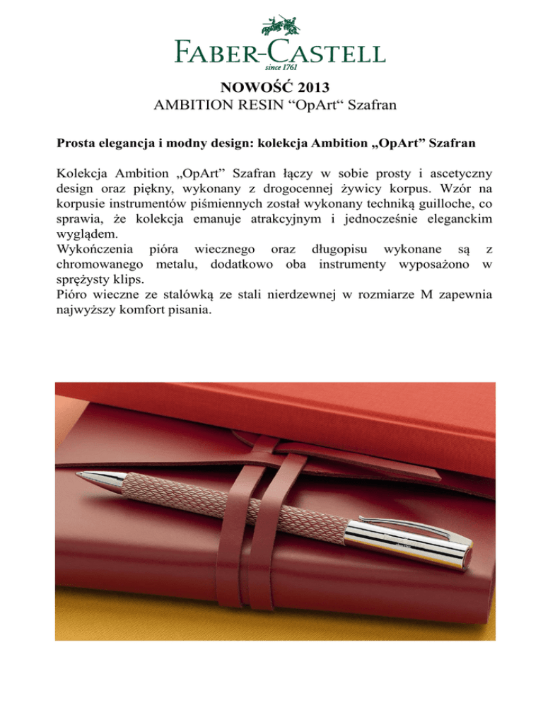 NOWOŚĆ 2013 AMBITION RESIN “OpArt“ Szafran Prosta elegancja i modny design: kolekcja Ambition „OpArt” Szafran Kolekcja Ambition „OpArt” Szafran łączy w sobie prosty i ascetyczny design oraz piękny, wykonany z drogocennej żywicy korpus. Wzór na korpusie instrumentów piśmiennych został wykonany techniką guilloche, co sprawia, że kolekcja emanuje atrakcyjnym i jednocześnie eleganckim wyglądem. Wykończenia pióra wiecznego oraz długopisu wykonane są z chromowanego metalu, dodatkowo oba instrumenty wyposażono w sprężysty klips. Pióro wieczne ze stalówką ze stali nierdzewnej w rozmiarze M zapewnia najwyższy komfort pisania. NOWOŚĆ 2013 AMBITION RESIN “OpArt“ Szafran DŁUGOPIS PIÓRO WIECZNE 14 70 70 14 70 60 Chromowane i polerowane wykończenia z metalu Sprężysty, metalowy klips Wygrawerowany wzór techniką guilloche, korpus wykonany z drogocennej żywicy w stylowym kolorze szafranu Wkład czarny, M Nr art. Produkt Wysokiej jakości stalówka ze stali nierdzewnej, M Cena det. netto Cena det. brutto 147060 Pióro wieczne AMBITION OpArt Szafran M 203,25 zł 250,00 zł 147070 Długopis AMBITION OpArt Szafran 170,73 zł 210,00 zł Primo Polska S.A.ul. Studencka 31 lok. 2 02-735 Warszawatel. 22 8524510 E-mail: [email protected] www.primo-polska.pl