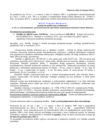 Manowo, dnia 24 sierpnia 2015 r. Na podstawie art. 35 ust. 1 i 2 ustawy z dnia 21 sierpnia 1997 r. o gospodarce nieruchomościami (j.t. Dz.U. z 2015 r. poz. 782 ) w związku z zarządzeniem Wójta Gminy Manowo Nr 73/2015 z dnia 20 sierpnia 2015 r. w sprawie ogłoszenia wykazu nieruchomości przeznaczonej do sprzedaży Wójt Gminy Manowo podaje do publicznej wiadomości w y k a z nieruchomości przeznaczonej do sprzedaży, stanowiącej własność Gminy Manowo Przedmiotem sprzedaży jest: ➢ Działka nr 208/19 o pow. 4,0798 ha, cena wywoławcza 264.100 zł. Księga wieczysta nr KO1K/00052723/7. Wadium w wysokości 10 % ceny wywoławczej należy wpłacić najpóźniej 4 dni przed ustalonym terminem przetargu. Sprzedaż w/w działki nastąpi w drodze przetargu nieograniczonego i podlega opodatkowaniu podatkiem VAT w wysokości 23 %. Oszacowana działka położona jest w układzie wschód – zachód na skraju miejscowości Cewlino. Otoczenie stanowią grunty niezabudowane częściowo z małymi zbiornikami wodnymi oraz pojedyncza zabudowa mieszkalno-rekreacyjna. Odległość działki: do drogi asfaltowej 100 m i dalej 200 m do drogi powiatowej. Działka o ogólnej pow. 40.798 m2 w tym: grunt pod wodą 30.672 m2 , 350 m2 grunt pod zabudowę, pozostały teren zakrzaczony i grunt rolny. Działka jest nie formena, płaska o wystawie korzystnej. Warunki gruntowe dobre, z dojazdem drogą gruntową utwardzoną szutrem, niezabudowana. Posiada możliwość zasilenia w sieć elektryczną. Miejscami porośnięta od strony północnej i zachodniej samosiewem brzozy 25 letniej – 70 szt., sosny 2- letniej – 8 szt., lipy 35 letniej – 6 szt. i topoli-osiki 35 letniej – 6 szt. Na plaży rośnie 11 sztuk brzozy 25 letniej o pierścienicy 30 cm i wysokości ca 12 m. Aktualnie działka wykorzystywana jest w formie niezorganizowanej, jako doraźna plaża i miejsce wypoczynku. Na terenie zbiornika wodnego znajdują się dwa pomosty o złym stanie technicznym. Zbiornik wodny jest hydrologicznie zamknięty o maksymalnej wgłębokości 3 m. Dno zbiornika zamulone. Zbiornik otacza wąski pas trzcin i zakrzaczeń od strony wschodniej i północnej oraz częściowo zachodniej. Zgodnie z decyzją o warunkach zabudowy nr GPB. 6730.27.2015.ZC wydanej przez Wójta Gminy w dniu 1.07.2015 r. zbywaną działkę przeznacza się pod budowę budynku mieszkalnego jednorodzinnego z niezbędną infrastrukturą techniczną oraz oraz zjazdu na drogę gminną. Powierzchnia zabudowy powinna zajmować maksymalnie 350 m2. Ustala się maksymalnie dwie kondygnacje nadziemne, w tym poddasze użytkowe. Termin wniesienia opłat za zakupioną działkę: 3 dni przed podpisaniem aktu notarialnego Stosownie do art. 34 ust. 1 pkt 1 i 2 ustawy z dnia 21 sierpnia 1997 roku o gospodarce nieruchomościami (j.t. Dz.U. z 2015 poz. 782) w z y w a się poprzednich właścicieli pozbawionych praw własnościowych tej nieruchomości albo ich spadkobierców przed dniem 5 grudnia 1990 r. oraz osoby, którym przysługuje roszczenie z mocy niniejszej ustawy do złożenia wniosków o nabycie nieruchomości w terminie 6 tygodni, licząc od dnia wywieszenia wykazu tj. do dnia 05 października 2015 r. W przypadku stwierdzenia braku wpływu oświadczeń w podanym terminie w/w działka zostanie sprzedana. Wywieszenie wykazu nieruchomości nastąpi od dnia 24 sierpnia 2015 r. do 14 września 2015 r. na tablicy ogłoszeń w siedzibie Urzędu Gminy Manowo. Informację o wywieszeniu wykazu podaje się do publicznej wiadomości w prasie internetowej MonitorUrzedowy.pl na tablicy ogłoszeń przy Urzędzie Gminy oraz na stronach internetowych Urzędu Gminy Manowo. Dodatkowych informacji o przedmiotowej nieruchomości można uzyskać w Urzędzie Gminy p. nr 17 – I piętro, tel. kontaktowy (94) 318 32 70. Do wiadomości : 1. Tablica ogłoszeń U.Gm. 2. Tablica ogłoszeń w sołectwie Cewlino 3. a/akta