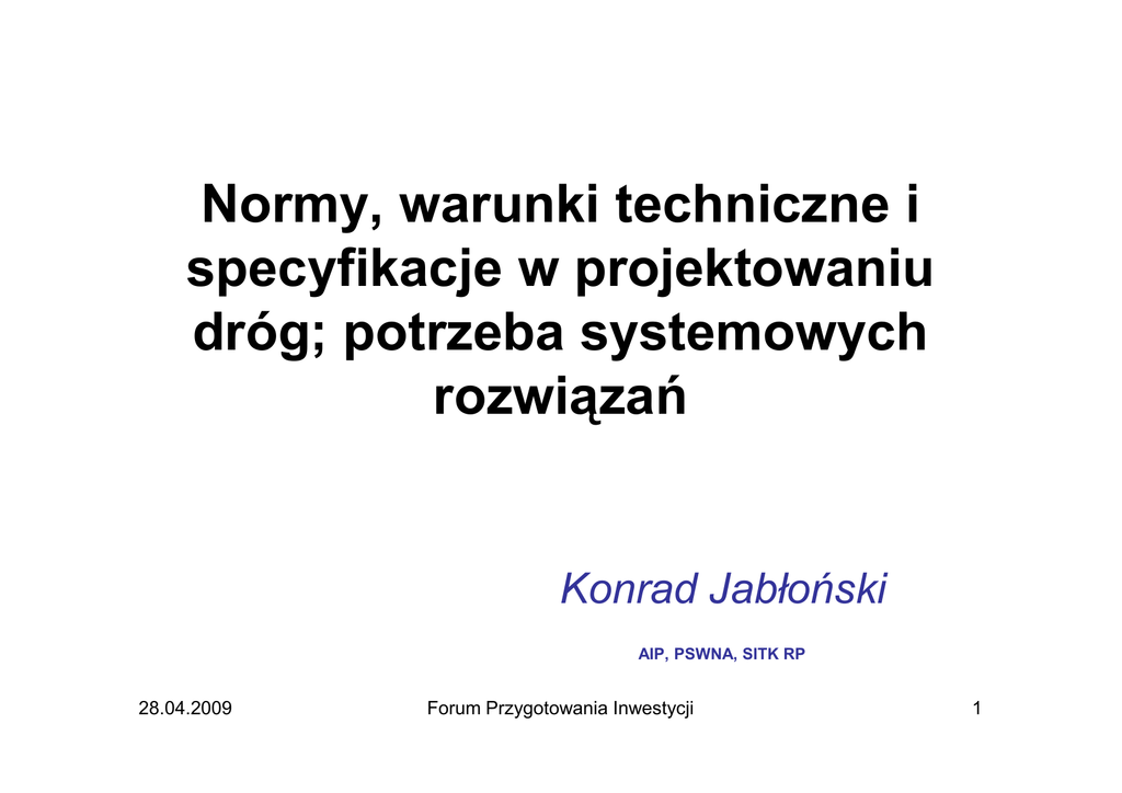Normy, warunki techniczne i specyfikacje w projektowaniu dróg; potrzeba systemowych rozwiązań Konrad Jabłoński AIP, PSWNA, SITK RP 28.04.2009 Forum Przygotowania Inwestycji 1 Geneza Norm Europejskich Podstawowe 4 filary jednolitego rynku Unii Europejskiej, to swobodny przepływ : towarów, kapitału, usług, osób. Parlament Europejski i Rada ustanawiając prawo UE (rozporządzenia i dyrektywy) zapewniają realizację ww. 4 wolności, a Komisja Europejska nadzoruje realizacje tego prawa wydając m. inn. decyzje. 28.04.2009 Forum Przygotowania Inwestycji 2 Geneza Norm Europejskich Dyrektywy zmierzające do usunięcia barier w swobodnym przepływie (obrocie) wyrobów w budownictwie, to: Dyrektywa Rady z dnia 21 grudnia 1988 r. w sprawie zbliżenia przepisów ustawowych, wykonawczych i administracyjnych Państw Członkowskich odnoszących się do wyrobów budowlanych (89/106/EWG), Dyrektywa Parlamentu Europejskiego i Rady z dnia 22 czerwca 1998 r., (rozszerzona z dnia 20 lipca 1998 r.) ustanawiająca procedurę udzielania informacji w dziedzinie norm i przepisów technicznych oraz zasad dotyczących usług społeczeństwa informacyjnego (98/34/WE). 28.04.2009 Forum Przygotowania Inwestycji 3 Geneza Norm Europejskich Zidentyfikowane bariery w swobodnym przepływie towarów: 1. róŜne sposoby formułowania przepisów krajowych, 2. stosowanie w przepisach krajów odniesień do norm krajowych, 3. stosowanie róŜnorodnych krajowych klasyfikacji wyrobów, 4. stosowanie wymagań, aby wyrobom towarzyszyły róŜne krajowe certyfikaty i znaki. 28.04.2009 Forum Przygotowania Inwestycji 4 Geneza Norm Europejskich Działania słuŜące usuwaniu barier technicznych w obszarze swobodnego przepływu wyrobów budowlanych na obszarze UE: harmonizacja techniczna, której celem jest zbliŜenie sposobu formułowania przepisów technicznych przez państwa członkowskie (> dyrektywa 89/106/EWG) wprowadzenie obowiązku powiadamiania o wszelkich projektowanych zmianach przepisów (>dyrektywa 98/34/WE) 28.04.2009 Forum Przygotowania Inwestycji 5 Geneza Norm Europejskich Dyrektywa 89/106/EWG (nowego podejścia) określa: wymagania zasadnicze, odnoszące się do tych cech wyrobów, które mają istotne znaczenie w odniesieniu do bezpieczeństwa obiektów i są przedmiotem róŜnorodnych przepisów krajowych, zasady domniemania zgodności z dyrektywą poprzez wskazanie spełnienia wymagań zharmonizowanych specyfikacji technicznych, zasady obowiązkowej oceny zgodności, 28.04.2009 Forum Przygotowania Inwestycji 6 Geneza Norm Europejskich udział jednostek notyfikowanych w ocenie zgodności, obowiązkowe oznakowanie CE wyrobu, nadzór państwa nad przestrzeganiem zasad dyrektywy na rynku. 28.04.2009 Forum Przygotowania Inwestycji 7 Geneza Norm Europejskich Stanowienie przepisów technicznych naleŜy do wyłącznych kompetencji państw członkowskich UE, a ich zróŜnicowanie uznaje się za w pełni uzasadnione, ze względu na odmienne warunki klimatyczne, przyjęty poziom ochrony lub np,. tradycje itp. Celem harmonizacji technicznej nie jest ujednolicenie przepisów w skali całej UE, lecz usunięcie barier technicznych polegających na róŜnorodnych sposobach formułowania wymagań stawianych wyrobom w przepisach krajowych. 28.04.2009 Forum Przygotowania Inwestycji 8 Geneza Norm Europejskich • Dyrektywa Rady (89/106/EWG) w preambule zawiera m. inn. zapis: • Zharmonizowane normy powinny zawierać klasyfikację, na podstawie której będzie moŜliwe wprowadzenie na rynek wyrobów budowlanych, które spełniają podstawowe wymagania, są zgodne z przepisami prawnymi oraz które są produkowane i stosowane zgodnie z prawem, zgodnie z tradycją techniczną uzasadnioną warunkami klimatycznymi lub innymi warunkami lokalnymi. 28.04.2009 Forum Przygotowania Inwestycji 9 Geneza Norm Europejskich Tak więc, jednym ze środków słuŜących osiągnięciu harmonizacji technicznej jest opracowanie zharmonizowanych specyfikacji technicznych (EN lub EAT), w których: klasy/kategorie wymagań pozwalają na uwzględnienie uzasadnionych róŜnic krajowych przepisów, właściwości techniczne wyrobów wyraŜone są w jednolity sposób, na podstawie ujednoliconych, wspólnych europejskich badań. 28.04.2009 Forum Przygotowania Inwestycji 10 Geneza Norm Europejskich Harmonizację techniczną moŜna więc postrzegać jako zmianę sposobu wyraŜania wymagań technicznych w przepisach poszczególnych państw członkowskich. Przepisy te po harmonizacji mogą stawiać róŜne wymagania, wyraŜone jednak w ten sam sposób. 28.04.2009 Forum Przygotowania Inwestycji 11 Geneza Norm Europejskich Zarówno przewidziane do harmonizacji normy wyrobów, ustalające poziomy klasy/kategorie wymagań uŜytkowych, jak i niezbędne narzędzia w postaci norm ustalających wspólne metody badań opracowywane są na podstawie tzw. Mandatów (zleceń), udzielanych przez Komisję Europejską. 28.04.2009 Forum Przygotowania Inwestycji 12 Geneza Norm Europejskich DYREKTYWA Wytyczne do Europejskich Dokumenty interpretacyjne Aprobat Technicznych do wymagań podstawowych Specyfikacje techniczne 89/106/EWG Wymagania podstawowe Obiekty 28.04.2009 X Mandat Komisji na opracowanie zharmonizowanej specyfikacji technicznej Forum Przygotowania Inwestycji ENh ETA Wymagania wobec wyrobów wyroby 13 Geneza Norm Europejskich Standardowe elementy harmonizacji technicznej w odniesieniu do wyrobów budowlanych (dyrektywa 89/106/EWG) oparte są na następujących załoŜeniach: wyroby budowlane wprowadzane na rynek UE muszą „nadawać się do zamierzonego stosowania” tj. mieć takie cechy (właściwości), Ŝeby obiekty, do budowy których zostaną uŜyte, spełniały wymagania podstawowe dyrektywy, 28.04.2009 Forum Przygotowania Inwestycji 14 Geneza Norm Europejskich cechy (właściwości) wyrobów, zapewniające spełnienie wymagań podstawowych przez obiekty budowlane muszą być zgodne ze zharmonizowanymi europejskimi specyfikacjami technicznymi (EN lub ETA), zg