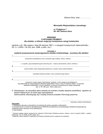 Zielona Góra, dnia ……………… Marszałek Województwa Lubuskiego ul. Podgórna 7 65- 067 Zielona Góra WNIOSEK O WYDANIE PROMESY dla obiektu, w którym mają być świadczone usługi hotelarskie zgodnie z art. 39a ustawy z dnia 29 sierpnia 1997 r. o usługach turystycznych (tekst jednolity – Dz. U. z 2004 r. Nr 223, poz. 2268, z późn. zm.) wnoszę o wydanie przyrzeczenia zaszeregowania obiektu hotelarskiego - promesy dla obiektu: 1. ................................................................................................................................................... (oznaczenie przedsiębiorcy wraz z podaniem jego siedziby, adresu i telefonu ....................................................................................................................................................... w wypadku, gdy przedsiębiorcą jest osoba fizyczna – miejsca zamieszkania, adresu i telefonu) 2. ................................................................................................................................................... (nazwa obiektu, jeŜeli usługi będą świadczone z uŜyciem nazwy własnej obiektu) 3. ................................................................................................................................................... (określenie połoŜenia obiektu, wraz z podaniem jego adresu) ............................................................................................................................................. 4. .................................................................................................................................................... (wskazanie rodzaju obiektu hotelarskiego i kategorii, o które ubiega się przedsiębiorca) wg załącznika do rozporządzenia Ministra Gospodarki i Pracy z dnia 19 sierpnia 2004 r. w sprawie obiektów hotelarskich i innych obiektów, w których są świadczone usługi hotelarskie (Dz. U. Nr 188, poz. 1945 z późn.zm.) 5. Oświadczam, Ŝe wszystkie dane zawarte we wniosku zostały wpisane prawidłowo, zgodnie ze stanem faktycznym na dzień jego sporządzenia. Jednocześnie zobowiązuję się o kaŜdej zmianie przesłać informację pisemną. ......................................................... (pieczątka i podpis wnioskodawcy) Załączniki: 1) Ostateczna decyzja o pozwoleniu na budowę lub zmianę sposobu uŜytkowania. 2) Zaświadczenia o numerze identyfikacyjnym REGON przedsiębiorcy prowadzącego działalność gospodarczą, wydanego przez właściwy urząd statystyczny. 3) Opis obiektu. ¹ Wniosek podlega opłacie skarbowej 5zł; załącznik 0,50zł kaŜdy (Podstawa prawna: Ustawa z dnia 9 września 2000r. o opłacie skarbowej – Dz. U. Nr 86, poz.96 z późn. zm.). ² Załączniki naleŜy składać w oryginałach lub kopiach poświadczonych urzędowo lub notarialnie. zał. 3 OPIS OBIEKTU 1. .................................................................................................................................................. .................................................................................................................................................. (nazwa własna obiektu, adres) 2. Telefony kontaktowe: - ..................................................................................................................................................... (telefon, faks - kierownictwo obiektu) - ..................................................................................................................................................... (telefon, faks, e-mail, WWW - recepcja) 3. PołoŜenie obiektu: zawarta zabudowa miejska (tak-nie) ......................................................................................... komunikacja: PKP........................... odl. w m. ................, PKS .................... m. ............. (nazwa dworca) NajbliŜsze jeziora, lasy, obiekty godne zwiedzania ............................................................................................................................................ ............................................................................................................................................ ............................................................................................................................................ 4. Pokoje i miejsca noclegowe: Pokoje /ilość/ Miejsca noclegowe /ilość/ Wyszczególnienie Ogółem Ogółem: w tym pok. 1-os w tym pok. 2-os w tym pok. 3-os w tym pok. większe niŜ 4-os apartamenty Z własną łazienką i wc ogółem całoroczne sezon 5. WyposaŜenie w urządzenia sportowo-rekreacyjne: Rodzaj urządzeń tak/nie Rodzaj urządzeń Basen Kryty/otwarty Sauna Solarium Siłownia Mini-golf Korty tenisowe WypoŜyczalnia sprzętu pływającego WypoŜyczalnia sprzętu sportowego Boiska/kosz, siatka, inne Bilard tak/nie Rodzaj urządzeń tak/nie PlaŜa i kąpielisko Ogródek zabaw ŚcieŜka zdrowia Jazda konna Inne Oświadczam, Ŝe wszystkie dane w załączniku zostały wpisane prawidłowo, zgodnie ze stanem faktycznym na dzień jego sporządzenia. Jednocześnie zobowiązuję się o kaŜdej zmianie przesłać informację pisemną. ............................... (miejscowość i data) ............................................................. (podpis i pieczątka imienna) Zielona Góra, dnia ……………… ............................................ (imię i nazwisko) ………………………………. (adres zamieszkania) ............................................. OŚWIADCZENIE Niniejszym oświadczam, Ŝe termin zakończenia budowy obiektu hotelarskiego planowany jest na dzień .................................................................................................................. (promesa wydawana jest na okres nie dłuŜszy niŜ dwa lata wg art.39a ust.3 ustawy z dnia 29 sierpnia 1997r. o usługach turystycznych). W okresie waŜności promesy nie będę świad