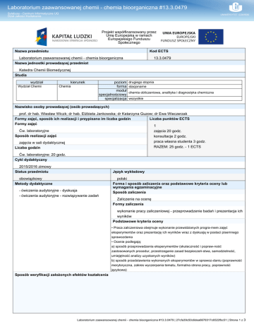 Laboratorium zaawansowanej chemii - chemia bioorganiczna #13.3.0479 Sylabusy - Centrum Informatyczne UG Dział Jakości Kształcenia Projekt współfinansowany przez Unię Europejską w ramach Europejskiego Funduszu Społecznego Nazwa przedmiotu Kod ECTS Laboratorium zaawansowanej chemii - chemia bioorganiczna Nazwa jednostki prowadzącej przedmiot 13.3.0479 Katedra Chemii Biomedycznej Studia wydział Wydział Chemii kierunek Chemia poziom forma moduł specjalnościowy specjalizacja drugiego stopnia stacjonarne chemia obliczeniowa, analityka i diagnostyka chemiczna wszystkie Nazwisko osoby prowadzącej (osób prowadzących) prof. dr hab. Wiesław Wiczk; dr hab. Elżbieta Jankowska; dr Katarzyna Guzow; dr Ewa Wieczerzak Formy zajęć, sposób ich realizacji i przypisana im liczba godzin Liczba punktów ECTS Formy zajęć 1 Ćw. laboratoryjne Sposób realizacji zajęć zajęcia 20 godz. konsultacje 2 godz. praca własna studenta 3 godz. RAZEM: 25 godz. - 1 ECTS zajęcia w sali dydaktycznej Liczba godzin Ćw. laboratoryjne: 20 godz. Cykl dydaktyczny 2015/2016 zimowy Status przedmiotu Język wykładowy obowiązkowy Metody dydaktyczne - ćwiczenia audytoryjne - dyskusja - ćwiczenia audytoryjne - rozwiązywanie zadań polski Forma i sposób zaliczenia oraz podstawowe kryteria oceny lub wymagania egzaminacyjne Sposób zaliczenia Zaliczenie na ocenę Formy zaliczenia wykonanie pracy zaliczeniowej - przeprowadzenie badań i prezentacja ich wyników Podstawowe kryteria oceny • Praca zaliczeniowa obejmuje wykonanie przewidzianych progra-mem zajęć eksperymentów oraz prezentację ich wyników wraz z dyskusją w postaci pisemnego sprawozdania • Ocenie podlegają: a) sposób przeprowadzenia eksperymentów (skuteczność i popraw-ność zastosowanych procedur, przestrzeganie zasad bezpieczeń-stwa, samodzielność, umiejętność analizy uzyskanych wyników) b) sposób przedstawienia wykonanych eksperymentów w sprawoz-daniu (poprawność merytoryczna, zakres wyczerpania tematu, formalna strona pracy, poprawność językowa) Sposób weryfikacji założonych efektów kształcenia Laboratorium zaawansowanej chemii - chemia bioorganiczna #13.3.0479 | 27cfa39c50c6dea6678317c6522fbc51 | Strona 1 z 3 Laboratorium zaawansowanej chemii - chemia bioorganiczna #13.3.0479 Sylabusy - Centrum Informatyczne UG Dział Jakości Kształcenia Sposoby weryfikacji przyswojenia wiedzy: Student rozwiązuje problemy w formie pisemnej (sprawdziany) lub ustnej (odpowiedź ustana) z zakresu chemii bioorganicznej, a także zastosowania technik eksperymentalnych (K_W01, K_W02, K_W03, K_W04, K_W07, K_W10). Prowadzący obserwuję pracę studenta zwracając uwagę na przestrzegania przez studenta zasad bezpieczeństwa i higieny pracy (K_W12). Sposoby weryfikacji nabycia umiejętności: Prowadzący ocenia sposób wykorzystania przez studenta aparatury naukowo-badawczej do rozwiązywania stawianych mu problemów (K_U02, K_U04). Prowadzący zajęcia ocenia sposób prowadzenia obliczeń, analizę wyników pomiarów oraz wnioski z przeprowadzonych doświadczeń na podstawie raportu przygotowanego przez studenta (K_U08). Sposoby weryfikacji nabrania kompetencji społecznych: Stawianie problemów naukowo-badawczych Studentowi, a następnie analiza jego zdolności do ich rozwiązywania w zespole (K_K01, K_K02). Student rozwiązuje problemy stawiane przez prowadzącego zajęcia dotyczące wykorzystania zdobytej wiedzy chemicznej i umiejętności do ochrony zdrowia oraz życia człowieka oraz środowiska naturalnego (K_K04). Określenie przedmiotów wprowadzających wraz z wymogami wstępnymi A. Wymagania formalne Ukończone kursy: Chemia organiczna, Chemia fizyczna, Spektroskopia chemiczna, Biochemia B. Wymagania wstępne Znajomość chemii organicznej i fizycznej oraz biochemii na poziomie studiów I stopnia, znajomość podstawowych zasad bezpieczeństwa i higieny pracy w laboratorium chemicznym, znajomość podstawowych aspektów budowy i działania aparatury spektralnej poznanej w ramach kursu „Chemii fizycznej”, umiejętność przeprowadzenia syntezy prostych związków organicznych w oparciu o procedury w języku polskim, umiejętność wykonywania podstawowych obliczeń chemicznych Cele kształcenia • Zapoznanie studentów z nowoczesnymi technikami stosowanymi w chemii bioorganicznej obejmującymi modyfikacje chemiczne związków biologicznie czynnych oraz badania oddziaływań międzycząsteczkowych • Przygotowanie studentów do przeprowadzania eksperymentów z zakresu chemii bioorganicznej oraz analizy uzyskanych wyników Treści programowe • przeprowadzanie syntezy aminokwasu niebiałkowego będącego znacznikiem fluorescencyjnym i jego zastosowanie w syntezie peptydów na nośniku stałym • chemiczna modyfikacja białka prowadzona w różnych warunkach (pH, czas reakcji, obecność denaturanta) i określenie stopnia wyznakowania białka metodami spektroskopowymi (absorpcja UV-Vis, fluorymetria) • badanie oddziaływań międzycząsteczkowych pomiędzy ligandem (fluoryzujący aminokwas lub peptyd) a cyklodekstryną (przewoźnik leków lub modelowy układ wnęki wiążącej receptora) metodami spektrofluorymetrycznymi Wykaz literatury A. Literatura wymagana do ostatecznego zaliczenia zajęć (zdania egzaminu): A.1. wykorzystywana podczas zajęć Instrukcje do ćwiczeń w języku polskim opracowane przez prowadzących ćwiczenia A.2. studiowana samodzielnie przez studenta • J. McMurry “Chemia Organiczna”, PWN Warszawa, 2000 • L. Stryer „Biochemia” PWN, Warszawa, 1997 • J. A. Baltrop, J. D. Coyle, Fotochemia, podstawy, PWN, Warszawa 1987 • P. W. Atkins, Chemia Fizyczna, PWN, Warszawa, 2001 B. Literatura uzupełniająca P. Kafarski, B. Lejczak „Chemia Bioorganiczna” PWN, Warszawa, 1994 Efekty kształcenia (obszarowe i kierunkowe) Wiedza K_W02: operuje rozszerzoną i pogłębioną wiedzą w zakresie podstawowych działów chemii; K_W03: wykazuje się rozszerzoną wiedzą w zakresie nowoczesnych te