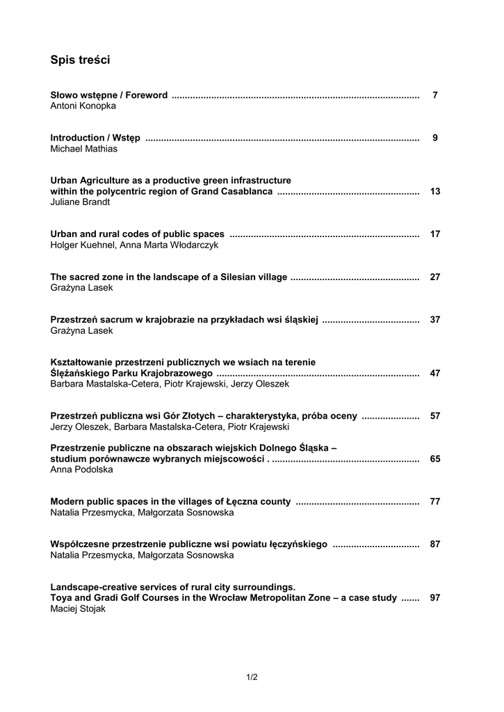 Spis treści Słowo wstępne / Foreword .............................................................................................. Antoni Konopka 7 Introduction / Wstęp ........................................................................................................ Michael Mathias 9 Urban Agriculture as a productive green infrastructure within the polycentric region of Grand Casablanca ...................................................... Juliane Brandt 13 Urban and rural codes of public spaces ........................................................................ Holger Kuehnel, Anna Marta Włodarczyk 17 The sacred zone in the landscape of a Silesian village ................................................. Grażyna Lasek 27 Przestrzeń sacrum w krajobrazie na przykładach wsi śląskiej ..................................... Grażyna Lasek 37 Kształtowanie przestrzeni publicznych we wsiach na terenie Ślężańskiego Parku Krajobrazowego ............................................................................. Barbara Mastalska-Cetera, Piotr Krajewski, Jerzy Oleszek Przestrzeń publiczna wsi Gór Złotych – charakterystyka, próba oceny ...................... Jerzy Oleszek, Barbara Mastalska-Cetera, Piotr Krajewski Przestrzenie publiczne na obszarach wiejskich Dolnego Śląska – studium porównawcze wybranych miejscowości . ........................................................ Anna Podolska 47 57 65 Modern public spaces in the villages of Łęczna county ............................................... Natalia Przesmycka, Małgorzata Sosnowska 77 Współczesne przestrzenie publiczne wsi powiatu łęczyńskiego ................................. Natalia Przesmycka, Małgorzata Sosnowska 87 Landscape-creative services of rural city surroundings. Toya and Gradi Golf Courses in the Wrocław Metropolitan Zone – a case study ....... Maciej Stojak 1/2 97 Usługi krajobrazotwórcze wiejskich okolic miasta na przykładzie pól golfowych w obszarze funkcjonalnym Wrocławia . .......................................................................... 107 Maciej Stojak Tradycyjne i nowe przestrzenie publiczne w planowaniu miejscowym ....................... 117 Wiesława Strabel Contemporary public spaces in the suburban area of the city of Wroclaw, Poland ... 135 Marta Szkaradkiewicz, Jan Kazak, Szymon Szewrański Współczesne przestrzenie publiczne w strefie suburbialnej miasta Wrocławia ......... 145 Marta Szkaradkiewicz, Jan Kazak, Szymon Szewrański The barn as the object adapted to new functions in the public country space ........... 155 Bogusław Szuba Public spaces vs. healthy places .................................................................................... 165 Ana Lídia Virtudes Przestrzeń publiczna nowych osiedli mieszkaniowych w strefie podmiejskiej Wrocławia ................................................................................... 175 Beata Warczewska, Witold Warczewski New public spaces in rural areas in the process of revitalization. Case study: Opole region in Poland ............................................................................... 187 Anna Marta Włodarczyk Tworzenie przestrzeni publicznej przy wykorzystaniu translokacji obiektów zabytkowych . ................................................................................................... 201 Michał Włodarczyk 2/2
