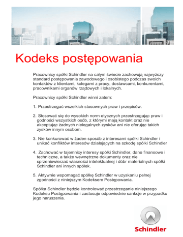Kodeks postępowania Pracownicy spółki Schindler na całym świecie zachowują najwyższy standard postępowania zawodowego i osobistego podczas swoich kontaktów z klientami, kolegami z pracy, dostawcami, konkurentami, pracownikami organów rządowych i lokalnych. Pracownicy spółki Schindler winni zatem: 1. Przestrzegać wszelkich stosownych praw i przepisów. 2. Stosować się do wysokich norm etycznych przestrzegając praw i godności wszystkich osób, z którymi mają kontakt oraz nie akceptując żadnych nielegalnych zysków ani nie oferując takich zysków innym osobom. 3. Nie konkurować w żaden sposób z interesami spółki Schindler i unikać konfliktów interesów działających na szkodę spółki Schindler 4. Zachować w tajemnicy interesy spółki Schindler, dane finansowe i techniczne, a także wewnętrzne dokumenty oraz nie sprzeniewierzać własności intelektualnej i dóbr materialnych spółki Schindler ani innych spółek. 5. Aktywnie wspomagać spółkę Schindler w uzyskaniu pełnej zgodności z niniejszym Kodeksem Postępowania. Spółka Schindler będzie kontrolować przestrzeganie niniejszego Kodeksu Postępowania i zastosuje odpowiednie sankcje w przypadku jego naruszenia.