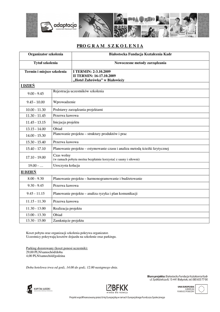PRO G R A M S Z K O L E N I A Organizator szkolenia Białostocka Fundacja Kształcenia Kadr Tytuł szkolenia Nowoczesne metody zarządzania Termin i miejsce szkolenia I TERMIN: 2-3.10.2009 II TERMIN: 16-17.10.2009 „Hotel Żubrówka” w Białowieży I DZIEŃ 9.00 - 9.45 Rejestracja uczestników szkolenia 9.45 - 10.00 Wprowadzenie 10.00 - 11.30 Podstawy zarządzania projektami 11.30 - 11.45 Przerwa kawowa 11.45 - 13.15 Inicjacja projektu 13.15 - 14.00 14.00 - 15.30 Obiad Planowanie projektu – struktury produktów i prac 15.30 - 15.40 Przerwa kawowa 15.40 - 17.10 Planowanie projektu – estymowanie czasu i analiza metodą ścieżki krytycznej 17.10 - 19.00 Czas wolny 19.00 - … (w ramach pobytu można bezpłatnie korzystać z sauny i siłowni) Uroczysta kolacja II DZIEŃ 8.00 - 9.30 Planowanie projektu – harmonogramowanie i budżetowanie 9.30 - 9.45 Przerwa kawowa 9.45 - 11.15 Planowanie projektu – analiza ryzyka i plan komunikacji 11.15 - 11.30 Przerwa kawowa 11.30 - 13.00 Realizacja projektu 13.00 - 13.30 Obiad 13.30 - 15.00 Zamknięcie projektu Koszt pobytu oraz organizacji szkolenia pokrywa organizator. Uczestnicy pokrywają kosztów dojazdu na szkolenie oraz parkingu. Parking dozorowany (koszt ponosi uczestnik): 29,00 PLN/samochód/doba 4,00 PLN/samochód/godzina Doba hotelowa trwa od godz. 14.00 do godz. 12.00 następnego dnia.