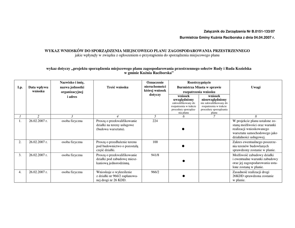 Załącznik do Zarządzenia Nr B.0151-133/07 Burmistrza Gminy Kuźnia Raciborska z dnia 04.04.2007 r. WYKAZ WNIOSKÓW DO SPORZĄDZENIA MIEJSCOWEGO PLANU ZAGOSPODAROWANIA PRZESTRZENNEGO jakie wpłynęły w związku z ogłoszeniem o przystąpieniu do sporządzenia miejscowego planu wykaz dotyczy „projektu sporządzenia miejscowego planu zagospodarowania przestrzennego sołectw Rudy i Ruda Kozielska w gminie Kuźnia Raciborska” Lp. 1 1. 2. 3. 4. Data wpływu wniosku 2 26.02.2007 r. 26.02.2007 r. 26.02.2007 r. 26.02.2007 r. Nazwisko i imię, nazwa jednostki organizacyjnej i adres 3 osoba fizyczna osoba fizyczna osoba fizyczna osoba fizyczna Treść wniosku Oznaczenie nieruchomości której wniosek dotyczy 4 Proszą o przekwalifikowanie działki na tereny usługowe (budowa warsztatu). 5 224 Proszą o przedłużenie terenu pod budownictwo o pozostałą część działki. Proszą o przekwalifikowanie działki pod zabudowę mieszkaniową jednorodzinną. 100 Wnioskuje o wykreślenie z działki nr 966/2 zaplanowanej drogi nr 26 KDD. Rozstrzygnięcie Burmistrza Miasta w sprawie rozpatrzenia wniosku wniosek wniosek uwzględniony nieuwzględniony zakwalifikowany do rozpatrzenia w trakcie procedury sporządzania planu nie zakwalifikowany do rozpatrzenia w trakcie procedury sporządzania planu 6 7 941/8 966/2 Uwagi 8 W projekcie planu ustalone zostaną możliwości oraz warunki realizacji wnioskowanego warsztatu samochodowego jako działalności usługowej. Zakres ewentualnego poszerzenia terenów budowlanych sprawdzony zostanie w planie. Możliwość zabudowy działki i ewentualne warunki zabudowy oraz jej zagospodarowania ustalone zostaną w planie. Zasadność realizacji drogi 26KDD sprawdzona zostanie w planie. Lp. 1 5. 6. 7. Data wpływu wniosku 2 05.03.2007 r. 07.03.2007 r. 07.03.2007 r. Nazwisko i imię, nazwa jednostki organizacyjnej i adres 3 osoba fizyczna osoba fizyczna osoba fizyczna Treść wniosku 4 Prosi o przekwalifikowanie działek pod zabudowę mieszkaniową jednorodzinną. Prosi o przekwalifikowanie terenu oznaczonego w planie symbolem 16 UT, UG, UH, US, ZN, IS, KSP, ZW, UG, ZI w całości pod możliwość zabudowy obiektami kubaturowymi (usługowymi) w zakresie określonym we wniosku. Prosi o przeznaczenie terenu oznaczonego w planie symbolem 12 ZN, 12 Kspa, 12 MJ, 12 UG.UT, 12 UH, 12 KSp, 12 KSn, KS, 12 ZN w całości pod wyżej wymienione funkcje jednakże z możliwością swobodnego zagospodarowania terenu. Oznaczenie nieruchomości której wniosek dotyczy 5 439/2, 495, 490/1, 326/3, 326/1, 572, 532, 239, 408 Rozstrzygnięcie Burmistrza Miasta w sprawie rozpatrzenia wniosku wniosek wniosek uwzględniony nieuwzględniony zakwalifikowany do rozpatrzenia w trakcie procedury sporządzania planu nie zakwalifikowany do rozpatrzenia w trakcie procedury sporządzania planu 6 7 Uwagi 8 Możliwości i sposoby ewentualnej zabudowy wnioskowanych działek sprawdzone zostaną w planie. 191/3, 170 168 Możliwość zmiany ustaleń obowiązującego planu sprawdzona zostanie w procedurze sporządzania w/w planu, przy czym jako niezbędne sygnalizuje się przeprowadzenie drogi publicznej przez wschodni obszar terenu. Warunki i możliwości zagospodarowania terenu ustalone zostaną w planie bez szczegółowego podziału terenu, z zachowaniem możliwości realizacji ciągu pieszego łączącego Rudy z Kolonią Renerowską. Lp. 1 8. 9. 10. 11. 12. 13. Data wpływu wniosku 2 08.03.2007 r. 13.03.2007 r. 14.03.2007 r. 14.03.2007 r. 14.03.2007 r. 14.03.2007 r. Nazwisko i imię, nazwa jednostki organizacyjnej i adres 3 osoba fizyczna osoba fizyczna osoba fizyczna osoba fizyczna osoba fizyczna osoba fizyczna Treść wniosku 4 Wnioskuje się o ujęcie całej nieruchomości pod zabudowę mieszkaniowa jednorodzinna w dwóch wariantach zaproponowanych przez wnioskującego we wniosku. Prosi o zmianę z terenów rolniczych na tereny przeznaczone pod zabudowę mieszkaniową jednorodzinną. Prosi o przekształcenie działki pod zabudowę. Oznaczenie nieruchomości której wniosek dotyczy 5 451/4 Rozstrzygnięcie Burmistrza Miasta w sprawie rozpatrzenia wniosku wniosek wniosek uwzględniony nieuwzględniony zakwalifikowany do rozpatrzenia w trakcie procedury sporządzania planu nie zakwalifikowany do rozpatrzenia w trakcie procedury sporządzania planu 6 7 21/4 187 Wnioskuje się o zmianę przeznaczenia działek pod zabudowę mieszkaniową. 168/15, 168/23, 168/25 Wnioskuje się o zmianę przeznaczenia działek pod zabudowę mieszkaniową. 94, 492, 496 Prosi o zmianę terenów rolniczych na tereny przeznaczone pod zabudowę mieszkaniową jednorodzinną. 951 Uwagi 8 Możliwość zabudowy działki i ewentualne warunki jej zabudowy i zagospodarowania ustalone zostaną w planie. Możliwość zabudowy działki i ewentualne warunki jej zabudowy i zagospodarowania ustalone zostaną w planie. Możliwość zabudowy działki i ewentualne warunki jej zabudowy i zagospodarowania ustalone zostaną w planie. Możliwość zabudowy działek i ewentualne warunki jej zabudowy i zagospodarowania ustalone zostaną w planie. Możliwość zabudowy działek i ewentualne warunki jej zabudowy i zagospodarowania ustalone zostaną w planie. Możliwość zabudowy działki i ewentualne warunki jej zabudowy i zagospodarowania ustalone zostaną w planie. Lp. 1 14. 15.a 15.b 15.c 15.d 15.e Data wpływu wniosku 2 14.03.2007 r. 14.03.2007 r. 14.03.2007 r. 14.03.2007 r. 14.03.2007 r. 14.03.2007 r. Nazwisko i imię, nazwa jednostki organizacyjnej i adres 3 osoba fizyczna Treść wniosku 4 Protest wobec zakładanych zmian dotyczących przebiegu planowanej obwodnicy/drogi wojewódzkiej. Oznaczenie nieruchomości której wniosek dotyczy 5 654 Rozstrzygnięcie Burmistrza Miasta w sprawie rozpatrzenia wniosku wniosek wniosek uwzględniony nieuwzględniony zakwalifikowany do rozpatrzenia w trakcie procedury sporządzania planu nie zakwalifikowany do rozpatrzenia w trakcie procedury sporządzania planu 6 7 Referat Gospodarki Nieruchomościami Rolnictwa i 