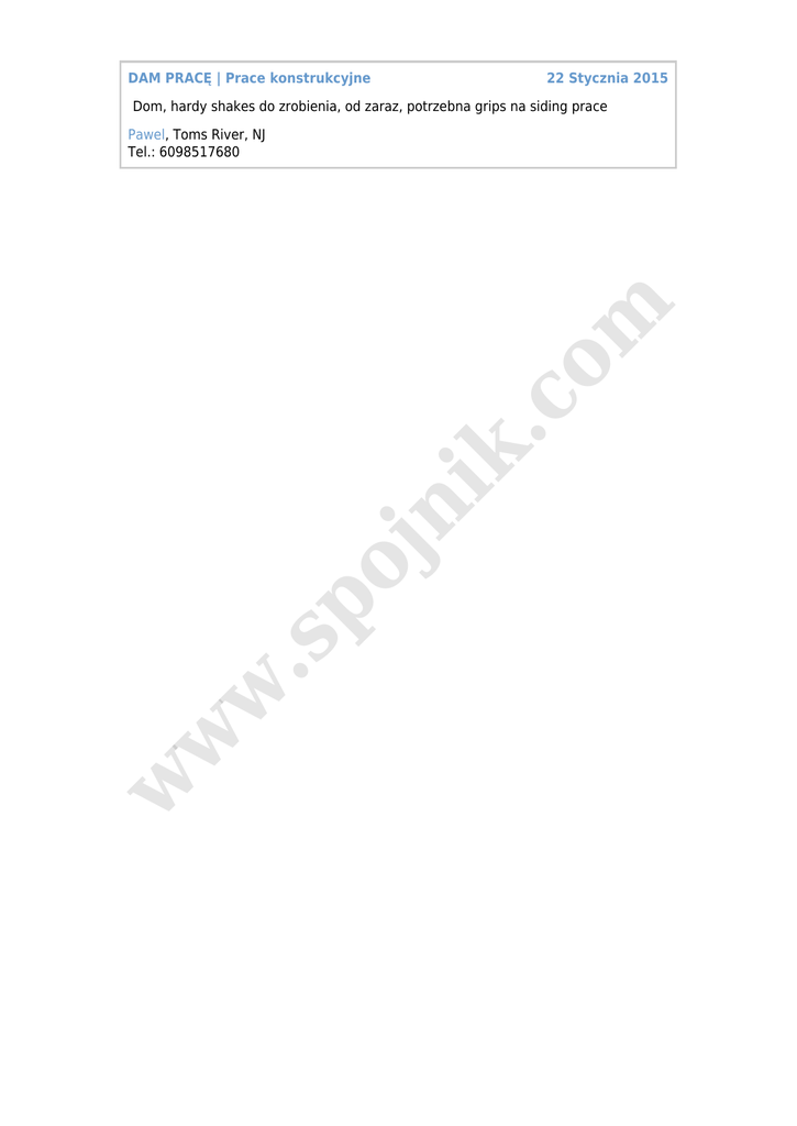 DAM PRACĘ | Prace konstrukcyjne 22 Stycznia 2015 Dom, hardy shakes do zrobienia, od zaraz, potrzebna grips na siding prace w w w .s po jn ik .c o m Pawel, Toms River, NJ Tel.: 6098517680