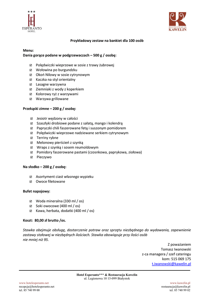 Przykładowy zestaw na bankiet dla 100 osób Menu: Dania gorące podane w podgrzewaczach – 500 g / osobę: Polędwiczki wieprzowe w sosie z trawy żubrowej Wołowina po burgundzku Okoń Nilowy w sosie cytrynowym Kaczka na styl orientalny Lasagne warzywna Ziemniaki z wody z koperkiem Kolorowy ryż z warzywami Warzywa grillowane Przekąski zimne – 200 g / osobę: Jesiotr wędzony w całości Szaszłyki drobiowe podane z sałatą, mango i kolendrą Papryczki chili faszerowane fetą i suszonym pomidorem Polędwiczki wieprzowe nadziewane serkiem cytrynowym Terriny rybne Melonowy pierścień z szynką Wraps z szynką i sosem reumoldowym Pomidory faszerowane pastami (czosnkowa, paprykowa, ziołowa) Pieczywo Na słodko – 200 g / osobę: Asortyment ciast własnego wypieku Owoce filetowane Bufet napojowy: Woda mineralna (330 ml / os) Soki owocowe (400 ml / os) Kawa, herbata, dodatki (400 ml / os) Koszt: 80,00 zł brutto /os. Stawka obejmuje obsługę, dostarczenie potraw oraz sprzętu niezbędnego do wydawania, zapewnienie zastawy stołowej w niezbędnych ilościach. Stawka obowiązuje przy ilości osób nie mniej niż 95. Z poważaniem Tomasz Iwanowski z-ca managera / szef cateringu kom: 515 069 175 [email protected] Hotel Esperanto*** & Restauracja Kawelin ul. Legionowa 10 15-099 Białystok www.hotelesperanto.net [email protected] tel. 85 740 99 00 www.kawelin.pl [email protected] tel. 85 740 99 02
