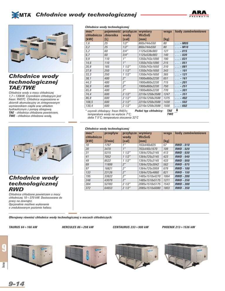 Chłodnice wody technologicznej Chłodnice wody technologicznej Chłodnice wody technologicznej TAE/TWE Chłodnice wody o mocy chłodniczej 1,7÷130kW. Czynnikiem chłodzącym jest freon: R407C. Chłodnica wyposażona w zbiornik akumulacyjny ze zintegrowanym wymiennikiem ciepła oraz układem hydraulicznym z pompą obiegową. TAE - chłodnica chłodzona powietrzem, TWE - chłodnica chłodzona wodą, moc* pojemność przyłącze wymiary chłodnicza zbiornika wody WxSxG [kW] [L] [cal] [mm] [kg] 1,6 3,2 5,2 6,7 9,9 14,6 20,8 27,8 33,3 38,1 44,3 56,9 65,8 74,4 86,8 108,5 130,4 80 80 127 140 190 215 310 343 365 651 715 750 770 1247 1375 1430 1500 25 25 60 60 110 110 165 250 250 400 400 400 400 600 600 600 600 1/2” 1/2” 3/4” 3/4” 1” 1” 1 1/2” 1 1/2” 1 1/2” 2” 2” 2” 2” 2 1/2” 2 1/2” 2 1/2” 2 1/2” waga 860x744x550 860x744x550 1125x538x983 1125x538x983 1350x743x1090 1350x743x1090 1350x743x1650 1350x743x1650 1350x743x1650 1900x860x2230 1900x860x2230 1900x860x2230 1900x860x2230 2210x1258x3588 2210x1258x3588 2210x1258x3588 2210x1258x3588 Podać typ chłodnicy: * czynnik chłodzący: freon R407c; temperatura wody na wylocie 7°C; delta T 5°C; temperatura otoczenia 32°C kody zamówieniowe . . . - M05 . . . - M10 . . . - 015 . . . - 020 . . . - 031 . . . - 051 . . . - 081 . . . - 101 . . . - 121 . . . - 161 . . . - 201 . . . - 251 . . . - 301 . . . - 351 . . . - 402 . . . - 502 . . . - 602 TAE TWE Chłodnice wody technologicznej Chłodnice wody technologicznej RWD moc* przepływ chłodnicza [kW] [l/min] przyłącze wymiary wody WxSxG [cal] [mm] [kg] 10 20 31 41 49 69 97 133 195 248 304 372 1” 1” 1 1/2” 1 1/2” 1 1/2” 2” 2” 2” 2” 2” 2 1/2” 2 1/2” 57 109 413 423 433 562 679 821 1064 1271 1543 1803 1797 3470 5315 7052 8522 11899 16821 23126 33822 43079 52783 64653 163x440x825 763x440x1670 1364x725x2145 1364x725x2145 1364x725x2145 1364x725x3042 1364x725x3959 1364x725x4860 1485x1510x4270 1485x1510x5175 2085x1510x5175 2085x1510x6080 waga kody zamówieniowe RWD - 010 RWD - 020 RWD - 030 RWD - 040 RWD - 050 RWD - 075 RWD - 100 RWD - 150 RWD - 200 RWD - 250 RWD - 300 RWD - 350 Chłodnice chłodzone powietrzem o mocy chłodniczej 10÷370 kW. Dostosowane do pracy na zewnątrz. Opcjonalnie możliwe wykonanie o zredukowanym poziomie hałasu. Oferujemy również chłodnice wody technologicznej o mocach chłodniczych: TAURUS 64÷166 kW Inne 9 9-14 HERCULES 86÷298 kW CENTAURUS 233÷900 kW PHOENIX 213÷1536 kW