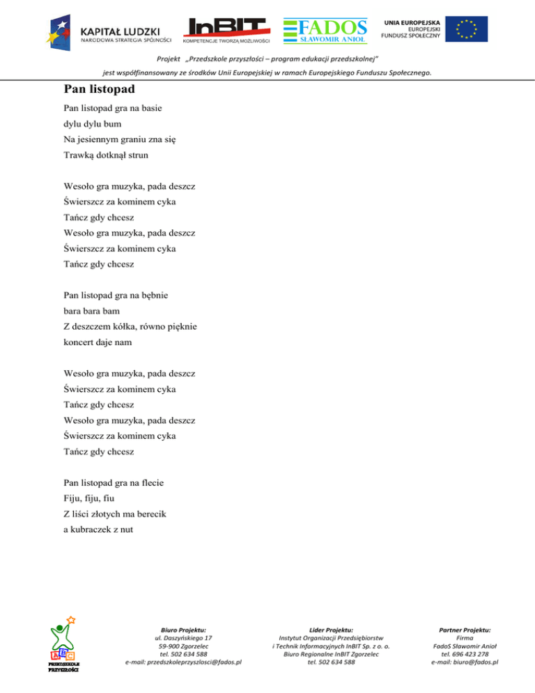 Projekt „Przedszkole przyszłości – program edukacji przedszkolnej” jest współfinansowany ze środków Unii Europejskiej w ramach Europejskiego Funduszu Społecznego. Pan listopad Pan listopad gra na basie dylu dylu bum Na jesiennym graniu zna się Trawką dotknął strun Wesoło gra muzyka, pada deszcz Świerszcz za kominem cyka Tańcz gdy chcesz Wesoło gra muzyka, pada deszcz Świerszcz za kominem cyka Tańcz gdy chcesz Pan listopad gra na bębnie bara bara bam Z deszczem kółka, równo pięknie koncert daje nam Wesoło gra muzyka, pada deszcz Świerszcz za kominem cyka Tańcz gdy chcesz Wesoło gra muzyka, pada deszcz Świerszcz za kominem cyka Tańcz gdy chcesz Pan listopad gra na flecie Fiju, fiju, fiu Z liści złotych ma berecik a kubraczek z nut Biuro Projektu: ul. Daszyńskiego 17 59-900 Zgorzelec tel. 502 634 588 e-mail: [email protected] Lider Projektu: Instytut Organizacji Przedsiębiorstw i Technik Informacyjnych InBIT Sp. z o. o. Biuro Regionalne InBIT Zgorzelec tel. 502 634 588 Partner Projektu: Firma FadoS Sławomir Anioł tel. 696 423 278 e-mail: [email protected] Projekt „Przedszkole przyszłości – program edukacji przedszkolnej” jest współfinansowany ze środków Unii Europejskiej w ramach Europejskiego Funduszu Społecznego. Wesoło gra muzyka, pada deszcz Świerszcz za kominem cyka Tańcz gdy chcesz Wesoło gra muzyka, pada deszcz Świerszcz za kominem cyka Tańcz gdy chcesz Biuro Projektu: ul. Daszyńskiego 17 59-900 Zgorzelec tel. 502 634 588 e-mail: [email protected] Lider Projektu: Instytut Organizacji Przedsiębiorstw i Technik Informacyjnych InBIT Sp. z o. o. Biuro Regionalne InBIT Zgorzelec tel. 502 634 588 Partner Projektu: Firma FadoS Sławomir Anioł tel. 696 423 278 e-mail: [email protected]