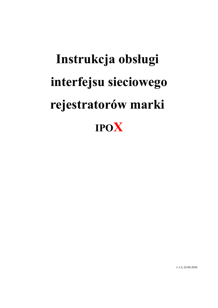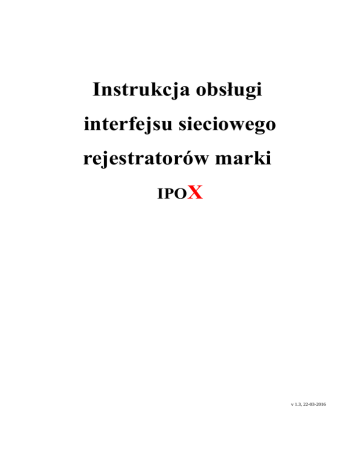 Instrukcja obsługi interfejsu sieciowego rejestratorów marki IPOX v 1.3, 22-03-2016 Spis treści 1. Interfejs sieciowy rejestratora (zdalny podgląd z komputera)..........................................................3 1.1. Pierwsze uruchomienie.............................................................................................................3 1.2. Interfejs sieciowy......................................................................................................................5 1.2.1. Podgląd..............................................................................................................................5 1.2.2. Nagrania..........................................................................................................................12 1.2.3. Kopia...............................................................................................................................27 1.2.4. Konfiguracja....................................................................................................................32 1.2.4.1. Lokalna konfiguracja...............................................................................................33 1.2.4.2. Podstawowe.............................................................................................................35 1.2.4.3. Podgląd....................................................................................................................40 1.2.4.4. Nagrywanie.............................................................................................................41 1.2.4.5. Harmonogram..........................................................................................................47 1.2.4.5. Zdarzenia alarmowe................................................................................................50 1.2.4.6. Sieć..........................................................................................................................69 1.2.4.7. Kamery IP................................................................................................................86 1.2.4.8. P.T.Z.........................................................................................................................90 1.2.4.9. Użytkownicy...........................................................................................................99 1.2.4.10. Zaawansowane....................................................................................................104 1.2.5. Narzędzia......................................................................................................................107 1.2.5.1. Ręczny alarm.........................................................................................................107 1.2.5.2. Menadżer dysku....................................................................................................108 1.2.5.3. Aktualizuj..............................................................................................................110 1.2.6. Informacje.....................................................................................................................112 1.2.6.1. System...................................................................................................................112 1.2.6.2. Zdarzenie...............................................................................................................112 1.2.6.3. Log.........................................................................................................................116 1.2.6.4. Sieć........................................................................................................................119 1.2.6.5. Użytkownicy on-line.............................................................................................120 2. Podstawowe ustawienia fabryczne rejestratora............................................................................121 3. Zasoby sieciowe...........................................................................................................................122 4. Pomoc techniczna.........................................................................................................................123 2 1. Interfejs sieciowy rejestratora (zdalny podgląd z komputera) Interfejs sieciowy rejestratora umożliwia podgląd oraz zarządzanie rejestratorem z poziomu komputera przy użyciu przeglądarki internetowej. Interfejs jest dostępny pod adresem sieciowym rejestratora. Aby uzyskać dostęp do interfejsu sieciowego rejestratora podłącz urządzenie do swojej sieci lokalnej. Następnie na swoim komputerze uruchom przeglądarkę internetową (np. Microsoft Internet Explorer, Mozilla Firefox). W pasku adresu przeglądarki wprowadź adres sieciowy rejestratora, np. http://192.168.1.100 . Pamiętaj że jeżeli port HTTP w rejestratorze został zmieniony należy go również podać w tym miejscu, np. jeżeli port HTTP ma przypisaną wartość 88 to w pasku adresu należy wprowadzić adres IP rejestratora wraz z numerem portu HTTP poprzedzonym znakiem „:”np.: http://192.168.1.100:88 1.1. Pierwsze uruchomienie Podczas pierwszego uruchomienia systemu z poziomu przeglądarki zostanie wyświetlony komunikat z prośbą o przeprowadzenie instalacji oprogramowania. Zezwól na jego instalację. Po chwili na ekranie pojawi się okno: Rys. 1: Okno powitalne instalatora 3 Naciśnij przycisk zainstaluj aby rozpocząć proces instalacji. Po kilku sekundach oprogramowanie zostanie zainstalowane a system wyświetli odpowiedni komunikat. Naciśnij przycisk Zamknij aby zakończyć proces instalacji. W oknie przeglądarki zostanie wyświetlony ekran logowania: Rys. 2: Okno logowania Wprowadź swoją nazwę użytkownika oraz hasło aby zalogować się do systemu. Następnie naciśnij przycisk ZALOGUJ aby rozpocząć proces logowania. Po zalogowaniu zostanie wyświetlony interfejs sieciowy. Domyślnie wyświetlana jest stron