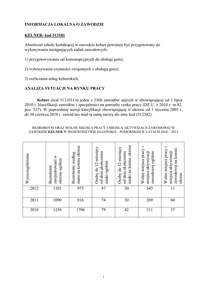 INFORMACJA LOKALNA O ZAWODZIE KELNER- kod 513101 Absolwent szkoły kształcącej w zawodzie kelner powinien być przygotowany do wykonywania następujących zadań zawodowych: 1) przygotowywania sal konsumpcyjnych do obsługi gości; 2) wykonywania czynności związanych z obsługą gości; 3) rozliczania usług kelnerskich. ANALIZA SYTUACJI NA RYNKU PRACY Kelner (kod 513101) to jeden z 2360 zawodów ujętych w obowiązującej od 1 lipca 2010 r. klasyfikacji zawodów i specjalności na potrzeby rynku pracy (DZ.U. z 2010 r. nr 82, poz. 537). W poprzedniej wersji klasyfikacji obowiązującej w okresie od 1 stycznia 2005 r. do 30 czerwca 2010 r. zawód ten miał tą samą nazwę ale inny kod (512302). Wolne miejsca pracy i miejsca aktywizacji zawodowej na koniec okresu Wolne miejsca pracy i miejsca aktywizacji zawodowej ogółem Osoby do 12 miesięcy od dnia ukończenia nauki na koniec okresu Osoby do 12 miesięcy od dnia ukończenia nauki ogółem Bezrobotni według stanu na koniec okresu Bezrobotni zarejestrowani w okresie ogółem Wyszczególnienie BEZROBOTNI ORAZ WOLNE MIEJSCA PRACY I MIEJSCA AKTYWIZACJI ZAWODOWEJ W ZAWODZIE KELNER W WOJEWÓDZTWIE KUJAWSKO – POMORSKIM W LATACH 2010 – 2012 2012 1101 975 87 30 345 11 2011 1090 916 74 30 269 60 2010 1258 1706 79 42 211 37 1 Większa liczba nowych rejestracji bezrobotnych niż zgłoszonych wolnych miejsc pracy lub aktywizacji zawodowej spowodowała, że w 2011 r. zawód ten został, podobnie jak w latach wcześniejszych, sklasyfikowany jako zawód nadwyżkowy1, tzn. taki na który na rynku pracy istnieje mniejsze zapotrzebowanie niż liczba osób poszukujących pracy w tym zawodzie. WYNIKI BADAŃ PRACODAWCÓW2 ANALIZA KSZTAŁCENIA W ZAWODZIE, OFERTA KSZTAŁCENIA – SYSTEM OŚWIATY SZKOLNEJ I POZASZKOLNEJ3 Rozporządzenie Ministra Edukacji Narodowej z dnia 23 grudnia 2011 roku w sprawie klasyfikacji zawodów szkolnictwa zawodowego określa, że zawód dietetyk od 1 września 2012 roku można zdobyć po ukończeniu Technikum w czteroletnim cyklu kształcenia. Dopuszcza się również możliwość kształcenia na kwalifikacyjnych kursach zawodowych. Dla zawodu kelner wyodrębniono dwie kwalifikacje: 1 Podziału na zawody deficytowe, zrównoważone i nadwyżkowe dokonuje się na podstawie wskaźnika intensywności nadwyżki (deficytu) wyrażonego jako iloraz liczby zgłoszonych wolnych miejsc pracy i miejsc aktywizacji zawodowej w badanym okresie, w danym zawodzie i liczby zarejestrowanych bezrobotnych w badanym okresie, w danym zawodzie. Zawody deficytowe to takie, dla których wskaźnik przekracza wartość 1,1; zawody zrównoważone to te, dla których wartość wskaźnika mieści się w przedziale od 0,9 do 1,1; natomiast zawody nadwyżkowe to te, w których przypadku wskaźnik wynosi poniżej 0,9. W 2011 r. 77,9% wszystkich zawodów, którymi legitymowali się bezrobotni lub zgłoszono w nich wolne miejsca pracy i miejsca aktywizacji zawodowej zostały sklasyfikowane jako nadwyżkowe. Zawody deficytowe stanowiły 17,9% zawodów a zrównoważone 4,2%. 2 Badanie 2000 pracodawców jest realizowane w ramach projektu WUP Rynek Pracy pod Lupą. Raport z badania pracodawców w 2010 r. znajduje się na stronie internetowej WUP, a za 2011 r. dodatkowo na stronie www.podlupa.wup.torun.pl 3 Źródło informacji: rozporządzenie Ministra Edukacji Narodowej z dnia 23 grudnia 2011 r. w sprawie klasyfikacji zawodów szkolnictwa zawodowego, serwis internetowy Ministerstwa Edukacji Narodowej www.men.gov.pl oraz System Informacji Oświatowej www.cie.men.gov.pl 2 K1 Wykonywanie usług kelnerskich K2 Organizacja usług gastronomicznych Kwalifikacyjny kurs zawodowy to kurs prowadzony według programu nauczania uwzględniającego podstawę programową kształcenia w zawodach w zakresie jednej kwalifikacji. Minimalna liczba godzin kształcenia na tym kursie jest równa minimalnej liczbie godzin kształcenia zawodowego określonej w podstawie programowej kształcenia w zawodach dla danej kwalifikacji. W ramach różnych zawodów wyodrębniono poszczególne kwalifikacje, z których każda obejmuje określony zasób wiedzy, umiejętności zawodowych oraz kompetencji personalnych i społecznych, opisanych w podstawie programowej kształcenia w zawodach. Podmiot prowadzący kwalifikacyjny kurs zawodowy jest obowiązany uwzględnić w realizowanym na kursie programie nauczania wszystkie wskazane w podstawie programowej kształcenia w zawodach komponenty właściwe dla danej kwalifikacji. Ukończenie tego kursu umożliwia przystąpienie do egzaminu potwierdzającego kwalifikacje w zawodzie, w zakresie danej kwalifikacji, przeprowadzanego przez okręgową komisję egzaminacyjną. Osoba, która ukończy kwalifikacyjny kurs zawodowy i zda egzamin potwierdzający kwalifikacje w zawodzie w zakresie danej kwalifikacji, otrzymuje świadectwo potwierdzające kwalifikacje w zawodzie. Dyplom potwierdzający kwalifikacje zawodowe w określonym zawodzie będzie mogła otrzymać osoba, która posiada poziom wykształcenia wymagany dla danego zawodu (odpowiednio wykształcenie zasadnicze zawodowe lub średnie) oraz zda egzaminy z zakresu wszystkich kwalifikacji wyodrębnionych w danym zawodzie, czyli posiada świadectwa potwierdzające uzyskanie kwalifikacji wyodrębnionych w danym zawodzie. Kwalifikacyjne kursy zawodowe mogą prowadzić: • • • • • publiczne szkoły prowadzące kształcenie zawodowe w zakresie zawodów, w których kształcą; niepubliczne szkoły posiadające uprawnienia szkół publicznych, prowadzące kształcenie zawodowe w zakresie zawodów, w których kształcą; placówki kształcenia ustawicznego, placówki kształcenia praktycznego, ośrodki dokształcania i doskonalenia zawodowego; instytucje rynku pracy, o których mowa w art. 6 ustawy z dnia 20 kwietnia 2004 r. o promocji zatrudnienia i instytucjach rynku pracy (Dz. U. z 2008 r. Nr 69, poz. 415, z późn. zm.), prowadzące działalność edukacyjno-szkoleniową; podmioty prowadzące działa