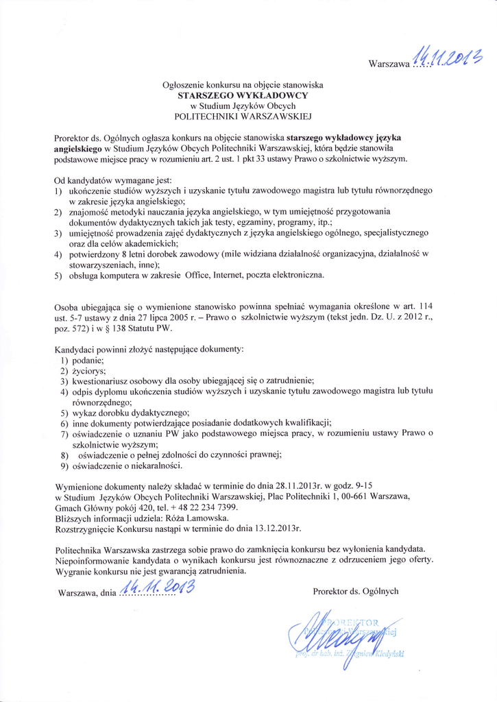 Prorektor ds. ogólnych ogjasza konkurs na objęcie stanowiska starszego wykładowcy jęryka