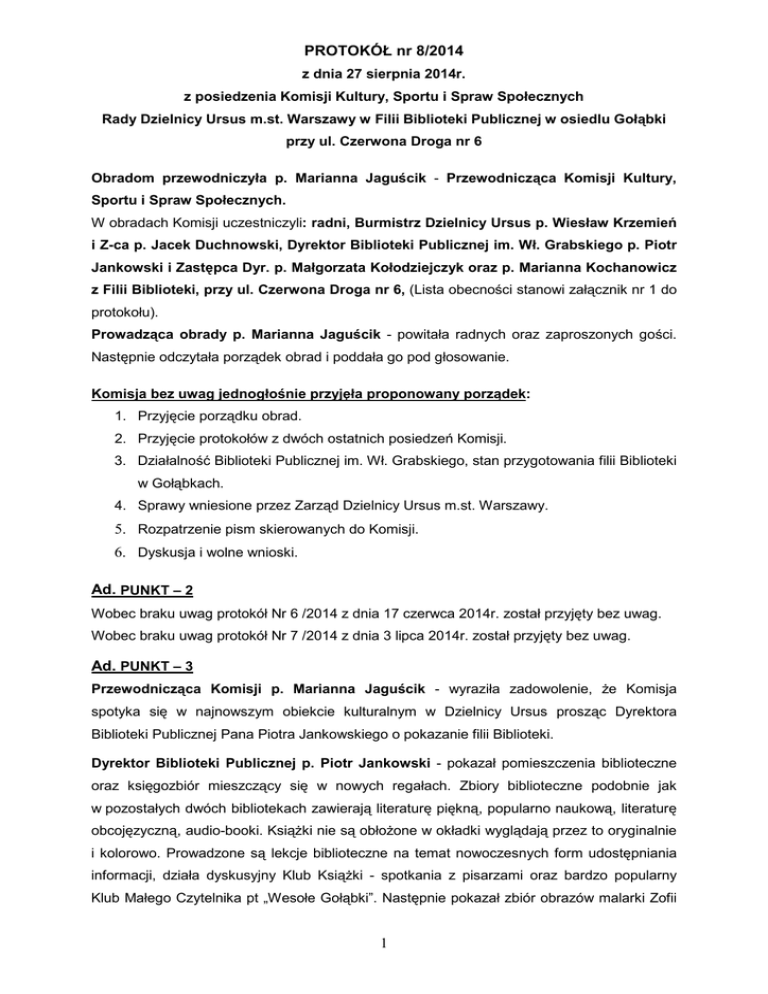 PROTOKÓŁ nr 8/2014 z dnia 27 sierpnia 2014r. z posiedzenia Komisji Kultury, Sportu i Spraw Społecznych Rady Dzielnicy Ursus m.st. Warszawy w Filii Biblioteki Publicznej w osiedlu Gołąbki przy ul. Czerwona Droga nr 6 Obradom przewodniczyła p. Marianna Jaguścik - Przewodnicząca Komisji Kultury, Sportu i Spraw Społecznych. W obradach Komisji uczestniczyli: radni, Burmistrz Dzielnicy Ursus p. Wiesław Krzemień i Z-ca p. Jacek Duchnowski, Dyrektor Biblioteki Publicznej im. Wł. Grabskiego p. Piotr Jankowski i Zastępca Dyr. p. Małgorzata Kołodziejczyk oraz p. Marianna Kochanowicz z Filii Biblioteki, przy ul. Czerwona Droga nr 6, (Lista obecności stanowi załącznik nr 1 do protokołu). Prowadząca obrady p. Marianna Jaguścik - powitała radnych oraz zaproszonych gości. Następnie odczytała porządek obrad i poddała go pod głosowanie. Komisja bez uwag jednogłośnie przyjęła proponowany porządek: 1. Przyjęcie porządku obrad. 2. Przyjęcie protokołów z dwóch ostatnich posiedzeń Komisji. 3. Działalność Biblioteki Publicznej im. Wł. Grabskiego, stan przygotowania filii Biblioteki w Gołąbkach. 4. Sprawy wniesione przez Zarząd Dzielnicy Ursus m.st. Warszawy. 5. Rozpatrzenie pism skierowanych do Komisji. 6. Dyskusja i wolne wnioski. Ad. PUNKT – 2 Wobec braku uwag protokół Nr 6 /2014 z dnia 17 czerwca 2014r. został przyjęty bez uwag. Wobec braku uwag protokół Nr 7 /2014 z dnia 3 lipca 2014r. został przyjęty bez uwag. Ad. PUNKT – 3 Przewodnicząca Komisji p. Marianna Jaguścik - wyraziła zadowolenie, że Komisja spotyka się w najnowszym obiekcie kulturalnym w Dzielnicy Ursus prosząc Dyrektora Biblioteki Publicznej Pana Piotra Jankowskiego o pokazanie filii Biblioteki. Dyrektor Biblioteki Publicznej p. Piotr Jankowski - pokazał pomieszczenia biblioteczne oraz księgozbiór mieszczący się w nowych regałach. Zbiory biblioteczne podobnie jak w pozostałych dwóch bibliotekach zawierają literaturę piękną, popularno naukową, literaturę obcojęzyczną, audio-booki. Książki nie są obłożone w okładki wyglądają przez to oryginalnie i kolorowo. Prowadzone są lekcje biblioteczne na temat nowoczesnych form udostępniania informacji, działa dyskusyjny Klub Książki - spotkania z pisarzami oraz bardzo popularny Klub Małego Czytelnika pt „Wesołe Gołąbki”. Następnie pokazał zbiór obrazów malarki Zofii 1 Grabskiej (żony pisarza Władysława Jana Grabskiego) min. piękny Tryptyk Matki Bożej z Dzieciątkiem wypożyczony od Księdza Proboszcza Witolda Łozowskiego z parafii Świętego Jana Ewangelisty i inne obrazy Świętych „Galeria” ubogaca filię biblioteki. Zaznaczył, że zakup nowego księgozbioru podnosi rangę biblioteki. Poprosił Zarząd Dzielnicy o zabezpieczenie środków na minimum nowego księgozbioru na 2015r. Przewodniczący Rady p. Henryk Linowski - przypomniał, że przed wojną Gołąbki stanowiły osiedle ogród, Zakłady Mechaniczne Ursus zajmowały małą powierzchnię, wówczas również funkcjonowała tu biblioteka – dom spotkań. Parafia również ma bibliotekę o bogatym księgozbiorze. Także filia biblioteki w osiedlu Gołąbki to kultywowanie tradycji. W dyskusji na ten temat głos zabrali p.p. Marianna Jaguścik, Jolanta Dąbek, Henryk Linowski, Wanda Kopcińska, Joanna Jerzyńska, Urszula Bodych, Wiesław Krzemień, Jacek Duchnowski, Piotr Jankowski, Małgorzata Kołodziejczyk. Prowadząca obrady p. Marianna Jaguścik - zapytała Dyrektora czy są problemy. Pan Dyrektor - odpowiedział, że ten rok jest dobry dla biblioteki. Zgłosił potrzebę budowy parkingu. Jeśli chodzi o budynek to niepokój może budzić zawilgocenie ściany. Przewodniczący Rady p. Henryk Linowski - zwilgocenie ściany może powodować problem z izolacją – trzeba koniecznie sprawdzić. Przewodnicząca Komisji p. Marianna Jaguścik - podziękowała Dyrektorowi za pokazanie filii Biblioteki i zabranie głosu życząc owocnej pracy. Ad. PUNKT – 4-6 Przewodnicząca Komisji p. Marianna Jaguścik - odczytała pisma, które Komisja przyjęła informacyjnie: Pismo z dnia 16 lipca 2014r. Rodziców dzieci stanowiące odwołanie od decyzji o nieutworzeniu klasy sportowej w Gimnazjum nr 131 im. K.K. Baczyńskiego w Warszawie w roku szkolnym 2014/2015 podkreślając, że sprawa ta została szczegółowo omówiona na posiedzeniu Komisji Oświaty w dniu 25 sierpnia br. z udziałem Dyrektora Gimnazjum Nr 131. Załącznik nr 3 do protokołu. Dwa pisma Wydziału Oświaty i Wychowania nr UD-XI-WOW.4424.PP.11.2014.SDO z dnia 9 lipca 2014r. stanowiące odpowiedź na pismo rodziców w sprawie negatywnego wyniku rekrutacji dziecka do przedszkola publicznego. Załącznik nr 4 do protokołu oraz pismo UDXI- WOW.4424.PP.12. 2014.SDO z dnia 10 lipca 2014r. stanowiące odpowiedź na petycję rodziców w sprawie braku miejsc w przedszkolu publicznym dla dzieci 3 i 4 letnich. Załącznik nr 6 Pisma Samodzielnego Zespołu Publicznych Zakładów lecznictwa Otwartego Warszawa – Ochota nr DS.-0600-1-85/2014 z dnia 15 lipca 2014r. stanowiącego odpowiedź na pismo 2 Burmistrza z dnia 8.07.2014r. w sprawie zabezpieczenia świadczeń zdrowotnych w zakresie stomatologii. Pisma mieszkańca p. PM z dnia 6.08.2014r. (oryginał skierowany do Generalnej Dyrekcji Dróg Krajowych i Autostrad dot. Nadmiernego hałasu powodowanego przez wadliwie zaprojektowane i wykonane ekrany akustyczne przy Południowej Obwodnicy Warszawy na odcinku położonym w Dzielnicy Ursus. Pismo nr DSP-4244-04522/2014L.Dz.1357 z dnia 3 lipca 2014r. stanowiące odpowiedź na skargę mieszkanki na nieprawidłowości w działaniach OPS. W tej sprawie Pani Przewodnicząca zaproponowała zorganizowanie posiedzenia Komisji z udziałem Dyrektora Ośrodka Pomocy Społecznej. Stanowisko Rady Dzielnicy Ursus w sprawie rozwiązania przez Prezydenta m.st. Warszawy Panią Hannę Gronkiewicz-Waltz umowy o prac z dyrektorem szpitala Świętej Rodziny w Warszawie prof. B Ch. W dyskusji na ten temat głos z
