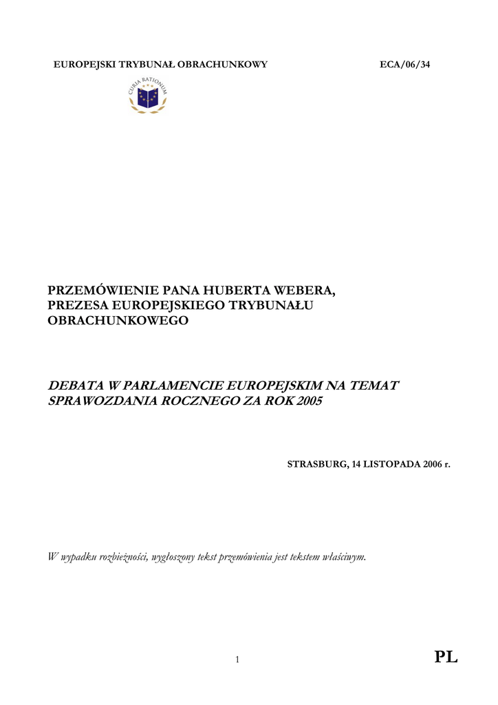 EUROPEJSKI TRYBUNAŁ OBRACHUNKOWY ECA/06/34 PRZEMÓWIENIE PANA HUBERTA WEBERA, PREZESA EUROPEJSKIEGO TRYBUNAŁU OBRACHUNKOWEGO DEBATA W PARLAMENCIE EUROPEJSKIM NA TEMAT SPRAWOZDANIA ROCZNEGO ZA ROK 2005 STRASBURG, 14 LISTOPADA 2006 r. W wypadku rozbieżności, wygłoszony tekst przemówienia jest tekstem właściwym. 1 PL Szanowny Panie Przewodniczący, Panie Posłanki, Panowie Posłowie, Szanowny Panie Wiceprzewodniczący, Szanowni Państwo, To dla mnie zaszczyt być tu dzisiaj podczas debaty na sesji plenarnej Parlamentu Europejskiego, poświęconej dwudziestemu dziewiątemu sprawozdaniu rocznemu Trybunału za rok budżetowy 2005. Sprawozdanie to przedstawiłem już 23 października 2006 r. przed Komisją Kontroli Budżetowej w Strasburgu oraz 7 listopada przed Radą ECOFIN w Brukseli. Każde sprawozdanie roczne Trybunału jest wynikiem skomplikowanych i szczegółowych prac kontrolnych na miejscu przeprowadzanych na wszystkich poziomach zarządzania funduszami UE przez kontrolerów Trybunału w ciągu 12 miesięcy poprzedzających opublikowanie sprawozdania. Zgodnie z zasadami międzynarodowych standardów kontroli i jak potwierdzają to eksperci zewnętrzni, uzyskane przez Trybunał dowody kontroli stanowią wynik szczegółowych badań prób transakcji z każdej z dziedzin budżetu. Są one wsparte oceną funkcjonowania systemów kontroli wewnętrznej w zakresie wydatków. Jedynie poważne błędy formalne oraz błędy mające skutki finansowe, np. zawyżanie danych we wnioskach, nieuprawnieni beneficjenci i niekwalifikowalne wydatki, stanowią podstawę dla wydawanego przez Trybunał poświadczenia wiarygodności. Na podstawie uprawnień nadanych na mocy Traktatu ustanawiającego Wspólnotę Europejską, Trybunał, od momentu swego powstania, konsekwentnie realizuje kontrole wykonania zadań, a wyniki tych kontroli są publikowane w jego sprawozdaniach specjalnych. Ponadto, dokonywana przez Trybunał ocena funkcjonowania systemów kontroli wewnętrznej, konieczna w celu sporządzenia corocznego poświadczenia wiarygodności, stanowi istotną podstawę dla kontroli wykonania zadań. Pozwolę sobie teraz przejść do głównych ustaleń kontroli przeprowadzonych przez Trybunał, dotyczących roku 2005: Wiarygodność rozliczeń Odnośnie do obszarów, w których odnotowano znaczącą poprawę, Trybunał docenia sukcesy, jakie Komisja odniosła w kierowaniu przejściem z rachunkowości kasowej na rachunkowość memoriałową oraz we wdrażaniu tej zmiany. Trybunał stwierdza, że skonsolidowane sprawozdanie finansowe za rok 2005 w zakresie budżetu ogólnego UE, wynoszącego 105 mld euro, jest wiarygodne. Opinia ta jednak opatrzona jest zastrzeżeniem, ze względu na zawyżenie aktywów netto oraz niekonsekwentne stosowanie procedur zaliczania transakcji do odpowiedniego okresu sprawozdawczego. Legalność i prawidłowość transakcji leżących u podstaw rozliczeń W odniesieniu do legalności i prawidłowości transakcji leżących u podstaw rozliczeń, Trybunał po raz kolejny wydaje opinię bez zastrzeżeń w zakresie: • • • • dochodów; zobowiązań; wydatków administracyjnych instytucji i organów UE oraz strategii przedakcesyjnej, z wyłączeniem programu Sapard. Dalsze pozytywne spostrzeżenia dotyczą skutecznego funkcjonowania Zintegrowanego Systemu Zarządzania i Kontroli (IACS), który obejmuje 56% wydatków w ramach Wspólnej Polityki Rolnej. Podobnie jak w roku 2004 Trybunał stwierdza, że system IACS, tam gdzie był on należycie stosowany, skutecznie ograniczył występowanie nieprawidłowości w wydatkach na rolnictwo. W praktyce, 2 PL konstatacja ta odnosi się do państw UE-15, z wyjątkiem Grecji. W nowych państwach członkowskich wdrażanie systemu IACS postępuje dobrze, chociaż systemy te nie są jeszcze w pełni skuteczne. Jak wskazują szczegółowe dowody kontroli uzyskane przez Trybunał, pozostałe dziedziny wydatków, stanowiące w ujęciu wartościowym większą część budżetu UE, wciąż w istotnym stopniu obciążone są błędami w zakresie legalności i prawidłowości transakcji leżących u podstaw rozliczeń. Innymi słowy, Trybunał ponownie wydaje opinię z zastrzeżeniem, zwłaszcza w odniesieniu do: • • • • rolnictwa jako całości; działań strukturalnych; polityk wewnętrznych oraz działań zewnętrznych, z powodu odnotowanego wysokiego poziomu nieprawidłowości takich jak: zawyżanie danych we wnioskach, podwójne naliczanie kosztów, niekwalifikowalność beneficjentów i/lub projektów, deklarowanie kosztów nieponiesionych, a także naruszanie zasad udzielania zamówień publicznych. Nieodpowiednie kontrole wewnętrzne Nieprawidłowości te występują, ponieważ stosowane obecnie mechanizmy kontroli wewnętrznej wydatków UE funkcjonują słabo. Zgodnie z postanowieniami Traktatu ustanawiającego Wspólnotę Europejską, obowiązkiem Komisji jest zapewnienie wdrożenia systemów kontroli wewnętrznej i ich skutecznego funkcjonowania w praktyce, na wszystkich szczeblach administracji UE. Trybunał nie tylko znalazł dowody świadczące o nieodpowiednim przeprowadzeniu kontroli płatności w ramach zarządzania dzielonego (wydatki na rolnictwo i działania strukturalne), ale stwierdził też, że Komisja nie działała w sposób wzorcowy w zakresie wydatków UE realizowanych przez nią w ramach zarządzania bezpośredniego (polityki wewnętrzne, działania zewnętrzne). Jako przykład można podać obszar badań, gdzie liczba przeprowadzonych przez Komisję kontroli deklaracji wydatków znacznie zmalała w roku 2005, pomimo utrzymującego się wysokiego poziomu błędów i nieodłącznego ryzyka związanego z tym rodzajem wydatków. Wieloletnie korekty Komisja podnosi argument, że błędy wykrywane i zgłaszane przez Trybunał są nieistotne, ponieważ rozmaite mechanizmy wieloletniej korekty pozwalają na wykrycie i korektę błędów oraz nieprawidłowości w momencie finalizowania programów. Prace Trybunału 