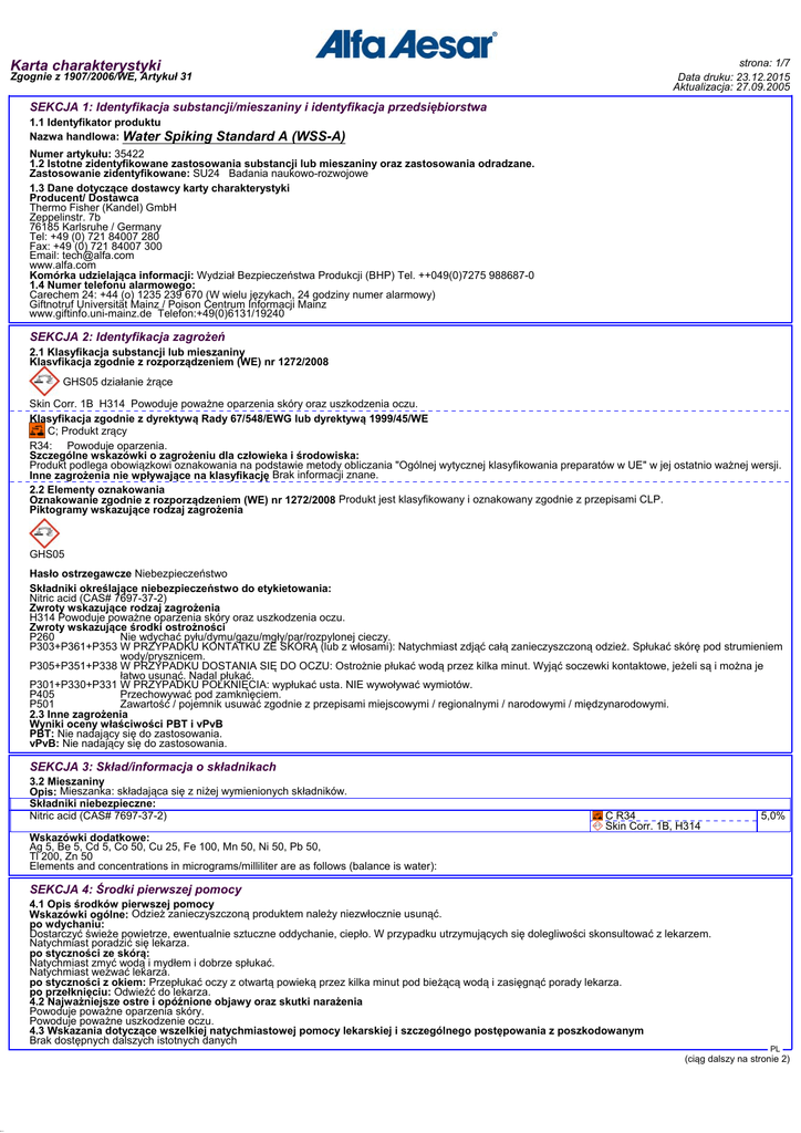 38.0.2 Karta charakterystyki strona: 1/7 Data druku: 23.12.2015 Aktualizacja: 27.09.2005 Zgognie z 1907/2006/WE, Artykuł 31 SEKCJA 1: Identyfikacja substancji/mieszaniny i identyfikacja przedsiębiorstwa 1.1 Identyfikator produktu Nazwa handlowa: Water Spiking Standard A (WSS-A) Numer artykułu: 35422 1.2 Istotne zidentyfikowane zastosowania substancji lub mieszaniny oraz zastosowania odradzane. Zastosowanie zidentyfikowane: SU24 Badania naukowo-rozwojowe 1.3 Dane dotyczące dostawcy karty charakterystyki Producent/ Dostawca Thermo Fisher (Kandel) GmbH Zeppelinstr. 7b 76185 Karlsruhe / Germany Tel: +49 (0) 721 84007 280 Fax: +49 (0) 721 84007 300 Email: [email protected] www.alfa.com Komórka udzielająca informacji: Wydział Bezpieczeństwa Produkcji (BHP) Tel. ++049(0)7275 988687-0 1.4 Numer telefonu alarmowego: Carechem 24: +44 (o) 1235 239 670 (W wielu językach, 24 godziny numer alarmowy) Giftnotruf Universität Mainz / Poison Centrum Informacji Mainz www.giftinfo.uni-mainz.de Telefon:+49(0)6131/19240 SEKCJA 2: Identyfikacja zagrożeń 2.1 Klasyfikacja substancji lub mieszaniny Klasyfikacja zgodnie z rozporządzeniem (WE) nr 1272/2008 GHS05 działanie żrące Skin Corr. 1B H314 Powoduje poważne oparzenia skóry oraz uszkodzenia oczu. Klasyfikacja zgodnie z dyrektywą Rady 67/548/EWG lub dyrektywą 1999/45/WE C; Produkt zrący R34: Powoduje oparzenia. Szczególne wskazówki o zagrożeniu dla człowieka i środowiska: Produkt podlega obowiązkowi oznakowania na podstawie metody obliczania "Ogólnej wytycznej klasyfikowania preparatów w UE" w jej ostatnio ważnej wersji. Inne zagrożenia nie wpływające na klasyfikację Brak informacji znane. 2.2 Elementy oznakowania Oznakowanie zgodnie z rozporządzeniem (WE) nr 1272/2008 Produkt jest klasyfikowany i oznakowany zgodnie z przepisami CLP. Piktogramy wskazujące rodzaj zagrożenia GHS05 Hasło ostrzegawcze Niebezpieczeństwo Składniki określające niebezpieczeństwo do etykietowania: Nitric acid (CAS# 7697-37-2) Zwroty wskazujące rodzaj zagrożenia H314 Powoduje poważne oparzenia skóry oraz uszkodzenia oczu. Zwroty wskazujące środki ostrożności P260 Nie wdychać pyłu/dymu/gazu/mgły/par/rozpylonej cieczy. P303+P361+P353 W PRZYPADKU KONTATKU ZE SKÓRĄ (lub z włosami): Natychmiast zdjąć całą zanieczyszczoną odzież. Spłukać skórę pod strumieniem wody/prysznicem. P305+P351+P338 W PRZYPADKU DOSTANIA SIĘ DO OCZU: Ostrożnie płukać wodą przez kilka minut. Wyjąć soczewki kontaktowe, jeżeli są i można je łatwo usunąć. Nadal płukać. P301+P330+P331 W PRZYPADKU POŁKNIĘCIA: wypłukać usta. NIE wywoływać wymiotów. P405 Przechowywać pod zamknięciem. P501 Zawartość / pojemnik usuwać zgodnie z przepisami miejscowymi / regionalnymi / narodowymi / międzynarodowymi. 2.3 Inne zagrożenia Wyniki oceny właściwości PBT i vPvB PBT: Nie nadający się do zastosowania. vPvB: Nie nadający się do zastosowania. SEKCJA 3: Skład/informacja o składnikach 3.2 Mieszaniny Opis: Mieszanka: składająca się z niżej wymienionych składników. Składniki niebezpieczne: Nitric acid (CAS# 7697-37-2) Wskazówki dodatkowe: Ag 5, Be 5, Cd 5, Co 50, Cu 25, Fe 100, Mn 50, Ni 50, Pb 50, Tl 200, Zn 50 Elements and concentrations in micrograms/milliliter are as follows (balance is water): C R34 Skin Corr. 1B, H314 5,0% SEKCJA 4: Środki pierwszej pomocy 4.1 Opis środków pierwszej pomocy Wskazówki ogólne: Odzież zanieczyszczoną produktem należy niezwłocznie usunąć. po wdychaniu: Dostarczyć świeże powietrze, ewentualnie sztuczne oddychanie, ciepło. W przypadku utrzymujących się dolegliwości skonsultować z lekarzem. Natychmiast poradzić się lekarza. po styczności ze skórą: Natychmiast zmyć wodą i mydłem i dobrze spłukać. Natychmiast wezwać lekarza. po styczności z okiem: Przepłukać oczy z otwartą powieką przez kilka minut pod bieżącą wodą i zasięgnąć porady lekarza. po przełknięciu: Odwieźć do lekarza. 4.2 Najważniejsze ostre i opóźnione objawy oraz skutki narażenia Powoduje poważne oparzenia skóry. Powoduje poważne uszkodzenie oczu. 4.3 Wskazania dotyczące wszelkiej natychmiastowej pomocy lekarskiej i szczególnego postępowania z poszkodowanym Brak dostępnych dalszych istotnych danych PL (ciąg dalszy na stronie 2) 38.0.2 Karta charakterystyki Zgognie z 1907/2006/WE, Artykuł 31 Nazwa handlowa: Water strona: 2/7 Data druku: 23.12.2015 Aktualizacja: 27.09.2005 Spiking Standard A (WSS-A) (ciąg dalszy od strony 1) SEKCJA 5: Postępowanie w przypadku pożaru 5.1 Środki gaśnicze Przydatne środki gaśnicze: Zabiegi gaszenia ognia dostosować do otoczenia. 5.2 Szczególne zagrożenia związane z substancją lub mieszaniną Jeśli niniejszy produkt jest zaangażowany w pożarze, mogą uwolnić się: Tlenki azotu (NOx) 5.3 Informacje dla straży pożarnej Specjalne wyposażenie ochronne: Nosić urządzenie ochrony dróg oddechowych niezależnie od powietrza otoczenia. Nosić pełne ubranie ochronne. SEKCJA 6: Postępowanie w przypadku niezamierzonego uwolnienia do środowiska 6.1 Indywidualne środki ostrożności, wyposażenie ochronne i procedury w sytuacjach awaryjnych Nosić ubranie ochronne. Osoby nie zabezpieczone przenieść w bezpieczne miejsce. Zadbać o wystarczające wietrzenie. 6.2 Środki ostrożności w zakresie ochrony środowiska: Nie dopuszczac, aby substancja przedostala sie do srodowiska bez uzyskania odpowiednich zezwolen od wladz. 6.3 Metody i materiały zapobiegające rozprzestrzenianiu się skażenia i służące do usuwania skażenia: Zebrać za pomocą materiału wiążącego ciecze (piasek, ziemia okrzemkowa, materiał wiążący kwasy, materiał wiążący uniwersalny, trociny). Zastosować środek neutralizujący. Materiał skażony usunąć jako odpad wg punktu 13. Zadbać o wystarczające przewietrzenie. Zapobieganie wtórnych zagrożeń: Środki specjalne nie są konieczne. 6.4 Odniesienia do innych sekcji Informacje na temat bezpiecznej obsługi pa