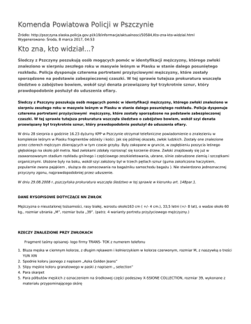 Komenda Powiatowa Policji w Pszczynie Źródło: http://pszczyna.slaska.policja.gov.pl/k19/informacje/aktualnosci/50584,Kto-zna-kto-widzial.html Wygenerowano: Środa, 8 marca 2017, 04:53 Kto zna, kto widział...? Śledczy z Pszczyny poszukują osób mogących pomóc w identyfikacji mężczyzny, którego zwłoki znaleziono w sierpniu zeszłego roku w masywie leśnym w Piasku w stanie dalego posuniętego rozkładu. Policja dysponuje czterema portretami przyżyciowymi mężczyzny, które zostały sporządzone na podstawie zabezpieczonej czaszki. W tej sprawie tutejsza prokuratura wszczęła śledztwo o zabójstwo bowiem, wokół szyi denata przewiązany był trzykrotnie sznur, który prawdopodobnie posłużył do uduszenia ofiary. Śledczy z Pszczyny poszukują osób mogących pomóc w identyfikacji mężczyzny, którego zwłoki znaleziono w sierpniu zeszłego roku w masywie leśnym w Piasku w stanie dalego posuniętego rozkładu. Policja dysponuje czterema portretami przyżyciowymi mężczyzny, które zostały sporządzone na podstawie zabezpieczonej czaszki. W tej sprawie tutejsza prokuratura wszczęła śledztwo o zabójstwo bowiem, wokół szyi denata przewiązany był trzykrotnie sznur, który prawdopodobnie posłużył do uduszenia ofiary. W dniu 28 sierpnia o godzinie 16.23 dyżurny KPP w Pszczynie otrzymał telefoniczne powiadomienie o znalezieniu w kompleksie leśnym w Piasku fragmentów odzieży i kości. Jak się później okazało, zwłok ludzkich. Zostały one znalezione przez czterech mężczyzn zbierających w tym czasie grzyby. Były zakopane w gruncie, w zagłębieniu poszycia leśnego głębokiego na około pół metra. Nad zwłokami zdołały rozrosnąć się korzenie drzew. Zwłoki znajdowały się już w zaawansowanym stadium rozkładu gnilnego i częściowego zeszkieletowania, ubrane, silnie zabrudzone ziemią i szczątkami organicznymi. Ułożone były na boku, wokół szyi założony był w trzech pętlach sznur (guma zakończona haczykiem, popularnie zwana pająkiem , służąca do zamocowania na bagażniku samochodu bagażu ). Nie stwierdzono jednoznacznej przyczyny zgonu, najprawdopodobniej przez uduszenie. W dniu 29.08.2008 r..pszczyńska prokuratura wszczęła śledztwo w tej sprawie w kierunku art. 148par.1. DANE RYSOPISOWE DOTYCZĄCE NN ZWŁOK Mężczyzna o nieustalonej tożsamości, rasy białej, wzrostu około163 cm ( +/- 4 cm.), 33,5 letni (+/- 8 lat), o wadze około 60 kg., rozmiar ubrania „M”, rozmiar buta „39”. (patrz. 4 warianty portretu przyżyciowego mężczyzny.) RZECZY ZNALEZIONE PRZY ZWŁOKACH Fragment taśmy opisanej- logo firmy TRANS- TOK z numerem telefonu 1. Bluza męska w ciemnym kolorze, z długim rękawem i kołnierzykiem w kolorze czerwonym, rozmiar M, z naszywką o treści YUN XIN 2. Spodnie koloru jasnego z napisem „Aska Golden Jeans” 3. Slipy męskie koloru granatowego w paski z napisem „ selection” 4. Para skarpet 5. Para półbutów męskich z oznaczeniem na środkowej części podeszwy X-SSIONE COLLECTION, rozmiar 39, wykonane z materiału przypominającego skórę Proszone są wszystkie osoby mogące wnieść coś do sprawy lub pomóc w identyfikacji nn mężczyzny o kontakt osobisty lub telefoniczny z tutejszą jednostką policji. KONTAKT Komenda Powiatowa Policji w Pszczynie ul. Bogedaina 18, tel. (0-32) 4493280 lub alarmowy 997 Ocena: 0/5 (0) Tweetnij