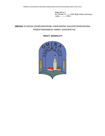 Studium Uwarunkowa i Kierunków Zagospodarowania Przestrzennego Gminy Gaworzyce Zał cznik nr 1 do Uchwały Nr …/.../2014 Rady Gminy Gaworzyce z dnia … ……. 2014r. ZMIANA STUDIUM UWARUNKOWA I KIERUNKÓW ZAGOSPODAROWANIA PRZESTRZENNEGO GMINY GAWORZYCE TEKST JEDNOLITY G G MINA Studium Uwarunkowa i Kierunków Zagospodarowania Przestrzennego Gminy Gaworzyce SPIS TRE CI: .............................................................................................................. CZ I. A. UWARUNKOWANIA WST P ................................................................................................................ 7 PODSTAWY PRAWNE .............................................................................................. 7 MATERIAŁY WYJ CIOWE ........................................................................................ 8 INFORMACJA PORZ DKOWA ................................................................................ 9 PRZEDMIOT OPRACOWANIA .................................................................................. 9 II. UWARUNKOWANIA ROZWOJU ....................................................................... 10 1 DOTYCHCZASOWE PRZEZNACZENIE, ZAGOSPODAROWANIE I UZBROJENIE TERENU ................................................................................... 10 2 STAN ŁADU PRZESTRZENNEGO I WYMOGI JEGO OCHRONY.................... 11 3 STAN RODOWISKA, W TYM STAN ROLNICZEJ I LE NEJ PRZESTRZENI PRODUKCYJNEJ, WIELKO I JAKO ZASOBÓW WODNYCH ORAZ WYMOGI OCHRONY RODOWISKA, PRZYRODY I KRAJOBRAZU KULTUROWEGO ............................................................................................... 12 3.1 STAN RODOWISKA NATURALNEGO........................................................ 12 3.1.1 3.1.2 3.1.3 3.1.4 3.1.5 3.1.6 3.1.7 Poło enie fizyczno – geograficzne.................................................................................... 12 Rze ba terenu i budowa geologiczna ............................................................................... 12 Surowce naturalne ............................................................................................................ 13 Wody powierzchniowe i podziemne .................................................................................. 13 Warunki klimatyczne ......................................................................................................... 14 Gleby ................................................................................................................................. 14 Lasy ................................................................................................................................... 15 3.2 OCHRONA PRZYRODY ................................................................................ 15 3.3 STAN ROLNICZEJ PRZESTRZENI PRODUKCYJNEJ .............................. 17 3.3.1 Warunki naturalne rolnictwa .............................................................................................. 17 3.3.2 Struktura agrarna i liczba gospodarstw............................................................................. 18 1 Studium Uwarunkowa i Kierunków Zagospodarowania Przestrzennego Gminy Gaworzyce 3.3.3 Produkcja ro linna............................................................................................................. 20 3.3.4 Produkcja zwierz ca ......................................................................................................... 20 3.4 STAN LE NEJ PRZESTRZENI PRODUKCYJNE ....................................... 21 3.5 PODSUMOWANIE ......................................................................................... 22 4 STAN DZIEDZICTWA KULTUROWEGO I ZABYTKÓW ORAZ DÓBR KULTURY WSPÓŁCZESNEJ .............................................................................................. 22 4.1 Warto rodowiska kulturowego obj tego ochron prawn ......................... 22 4.2 Obiekty wpisane do rejestru zabytków ........................................................... 24 5 WARUNKI I JAKO YCIA MIESZKA CÓW, W TYM OCHRONY ICH ZDROWIA .......................................................................................................... 26 5.1 DEMOGRAFIA I ZATRUDNIENIE.................................................................. 26 5.1.1 Sie osadnicza i demografia ............................................................................................. 26 5.1.2 Ruch naturalny ludno ci .................................................................................................... 28 5.1.3 Zatrudnienie ...................................................................................................................... 28 5.2 WARUNKI ZAMIESZKIWANIA ...................................................................... 30 5.3 OCHRONA ZDROWIA ................................................................................... 31 5.4 POMOC SPOŁECZNA ................................................................................... 31 5.5 EDUKACJA .................................................................................................... 32 5.5.1 Wychowanie przedszkolne ............................................................................................... 33 5.5.2 Szkoły podstawowe, gimnazjalne i ponadgimnazjalne ..................................................... 33 5.6 KULTURA, SPORT, REKREACJA................................................................. 35 5.7 TURYSTYKA ................................................................................................. 36 5.8 POZAROLNICZA DZIAŁALNO GOSPODARCZA..................................... 38 6 ZAGRO ENIE BEZPIECZE STWA LUDNO CI I JEJ MIENIA ........................ 38 7 POTRZEBY I MO LIWO CI ROZWOJU GMINY .............................................. 39 8 STAN PRAWNY GRUNTÓW ............................................................................ 39 9 WYST POWANIE OBIEKTÓW I TERENÓW CHRO
