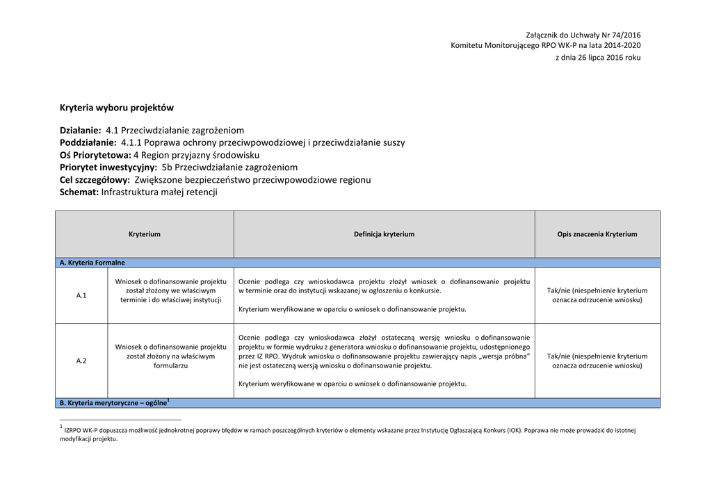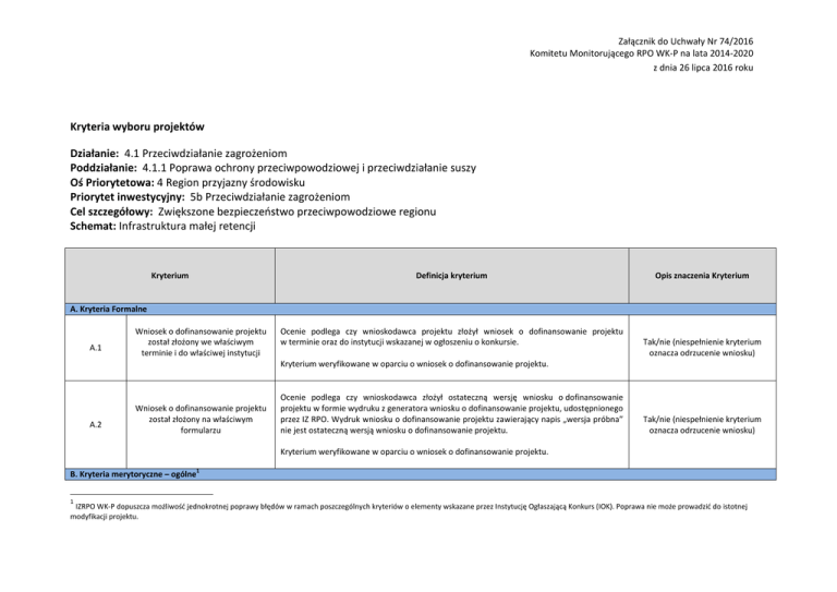 Załącznik do Uchwały Nr 74/2016 Komitetu Monitorującego RPO WK-P na lata 2014-2020 z dnia 26 lipca 2016 roku Kryteria wyboru projektów Działanie: 4.1 Przeciwdziałanie zagrożeniom Poddziałanie: 4.1.1 Poprawa ochrony przeciwpowodziowej i przeciwdziałanie suszy Oś Priorytetowa: 4 Region przyjazny środowisku Priorytet inwestycyjny: 5b Przeciwdziałanie zagrożeniom Cel szczegółowy: Zwiększone bezpieczeństwo przeciwpowodziowe regionu Schemat: Infrastruktura małej retencji Kryterium Definicja kryterium Opis znaczenia Kryterium A. Kryteria Formalne A.1 Wniosek o dofinansowanie projektu został złożony we właściwym terminie i do właściwej instytucji Ocenie podlega czy wnioskodawca projektu złożył wniosek o dofinansowanie projektu w terminie oraz do instytucji wskazanej w ogłoszeniu o konkursie. Tak/nie (niespełnienie kryterium oznacza odrzucenie wniosku) Kryterium weryfikowane w oparciu o wniosek o dofinansowanie projektu. A.2 Wniosek o dofinansowanie projektu został złożony na właściwym formularzu Ocenie podlega czy wnioskodawca złożył ostateczną wersję wniosku o dofinansowanie projektu w formie wydruku z generatora wniosku o dofinansowanie projektu, udostępnionego przez IZ RPO. Wydruk wniosku o dofinansowanie projektu zawierający napis „wersja próbna” nie jest ostateczną wersją wniosku o dofinansowanie projektu. Tak/nie (niespełnienie kryterium oznacza odrzucenie wniosku) Kryterium weryfikowane w oparciu o wniosek o dofinansowanie projektu. B. Kryteria merytoryczne – ogólne 1 1 IZRPO WK-P dopuszcza możliwość jednokrotnej poprawy błędów w ramach poszczególnych kryteriów o elementy wskazane przez Instytucję Ogłaszającą Konkurs (IOK). Poprawa nie może prowadzić do istotnej modyfikacji projektu. Załącznik do Uchwały Nr 74/2016 Komitetu Monitorującego RPO WK-P na lata 2014-2020 z dnia 26 lipca 2016 roku Ocenie podlega czy wniosek został złożony przez uprawnionego wnioskodawcę, tj.: B.1 Kwalifikowalność wnioskodawcy/partnerów - jednostkę samorządu terytorialnego; związek jednostek samorządu terytorialnego; stowarzyszenie jednostek samorządu terytorialnego; samorządową jednostkę organizacyjną; organ władzy, administracji rządowej; państwową jednostkę organizacyjną; inny podmiot posiadające osobowość prawną; partnera prywatnego we współpracy z podmiotami publicznymi w przypadku projektów realizowanych w formule partnerstwa publiczno-prywatnego. Tak/nie (niespełnienie kryterium oznacza odrzucenie wniosku) Kryterium weryfikowane w oparciu o wniosek o dofinansowanie projektu oraz załączniki. Wykluczenie podmiotowe (dotyczące wnioskodawcy): Ocenie podlega czy wnioskodawca oraz partnerzy (jeśli dotyczy) nie podlegają wykluczeniu z możliwości ubiegania się o dofinansowanie oraz że nie są objęci zakazem dostępu do środków funduszy europejskich na podstawie: - art. 207 ust. 4 ustawy z dnia 27 sierpnia 2009 r. o finansach publicznych (Dz. U. z 2013 r. poz. 885 ze zm.), B.2 Niepodleganie wykluczeniu z możliwości otrzymania dofinansowania ze środków Unii Europejskiej - art. 12 ust. 1 pkt 1 ustawy z dnia 15 czerwca 2012 r. o skutkach powierzania wykonywania pracy cudzoziemcom przebywającym wbrew przepisom na terytorium Rzeczypospolitej Polskiej (Dz. U. z 2012 r. poz. 769), - art. 9 ust. 1 pkt 2a ustawy z dnia 28 października 2002 r. o odpowiedzialności podmiotów zbiorowych za czyny zabronione pod groźbą kary (Dz. U. z 2015 r. poz. 1212), - przepisów zawartych w art. 37 ust. 3 ustawy z dnia 11 lipca 2014 r. o zasadach realizacji programów w zakresie polityki spójności finansowanych w perspektywie finansowej 2014– 2020 (Dz. U. 2016, poz. 217). Kryterium weryfikowane w oparciu o wniosek o dofinansowanie projektu oraz załączniki. Wykluczenia przedmiotowe (dotyczące przedmiotu projektu): Projekt nie obejmuje przedsięwzięć, które zostały objęte lub powinny zostać objęte procedurą Tak/nie (niespełnienie kryterium oznacza odrzucenie wniosku) Załącznik do Uchwały Nr 74/2016 Komitetu Monitorującego RPO WK-P na lata 2014-2020 z dnia 26 lipca 2016 roku 2 odzyskiwania (w rozumieniu art. 71 rozporządzenia nr 1303/2013 ) w następstwie przeniesienia działalności produkcyjnej poza obszar objęty programem zgodnie z art. 125 ust. 3 lit. f) rozporządzenia nr 1303/2013. Ocena kryterium nastąpi poprzez weryfikację przedmiotu projektu lub kodu PKD/EKD pod kątem czy działalność, której dotyczy projekt może być wspierana w ramach działania. Kryterium weryfikowane w oparciu o wniosek o dofinansowanie projektu oraz załączniki. B.3 Miejsce realizacji projektu Ocenie podlega czy projekt realizowany jest na terytorium województwa kujawskopomorskiego. Tak/nie (niespełnienie kryterium oznacza odrzucenie wniosku) Kryterium weryfikowane w oparciu o wniosek o dofinansowanie projektu. B.4 B.5 B.6 2 Załączniki do wniosku o dofinansowanie są kompletne, poprawne i zgodne z przepisami prawa polskiego i unijnego oraz wymogami Instytucji Zarządzającej RPO WK-P 2014-2020 Zgodność projektu z wymaganiami prawa dotyczącego ochrony środowiska Zgodność z prawem pomocy Ocenie podlega czy wnioskodawca projektu dołączył do wniosku o dofinansowanie projektu wszystkie załączniki zgodnie z listą załączników zamieszczoną w regulaminie konkursu oraz czy załączniki do wniosku o dofinansowanie projektu są zgodne z przepisami prawa polskiego i unijnego oraz z Instrukcją wypełniania załączników do wniosku o dofinansowanie projektu w ramach RPO WK-P 2014-2020 Tak/nie (niespełnienie kryterium oznacza odrzucenie wniosku) Kryterium weryfikowane w oparciu o załączniki do wniosku o dofinansowanie projektu. Ocenie podlega czy działania zaplanowane w projekcie zostały przygotowane zgodnie z wymaganiami prawa dotyczącego ochrony środowiska. Tak/nie (niespełnienie kryterium oznacza odrzucenie wniosku) Kryterium weryfikowane w oparciu o załączniki do wniosku o dofinansowanie projek
