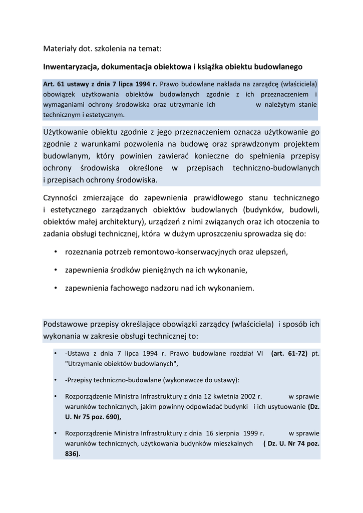 Materiały dot. szkolenia na temat: Inwentaryzacja, dokumentacja obiektowa i książka obiektu budowlanego Art. 61 ustawy z dnia 7 lipca 1994 r. Prawo budowlane nakłada na zarządcę (właściciela) obowiązek użytkowania obiektów budowlanych zgodnie z ich przeznaczeniem i wymaganiami ochrony środowiska oraz utrzymanie ich w należytym stanie technicznym i estetycznym. Użytkowanie obiektu zgodnie z jego przeznaczeniem oznacza użytkowanie go zgodnie z warunkami pozwolenia na budowę oraz sprawdzonym projektem budowlanym, który powinien zawierać konieczne do spełnienia przepisy ochrony środowiska określone w przepisach techniczno-budowlanych i przepisach ochrony środowiska. Czynności zmierzające do zapewnienia prawidłowego stanu technicznego i estetycznego zarządzanych obiektów budowlanych (budynków, budowli, obiektów małej architektury), urządzeń z nimi związanych oraz ich otoczenia to zadania obsługi technicznej, która w dużym uproszczeniu sprowadza się do: • rozeznania potrzeb remontowo-konserwacyjnych oraz ulepszeń, • zapewnienia środków pieniężnych na ich wykonanie, • zapewnienia fachowego nadzoru nad ich wykonaniem. Podstawowe przepisy określające obowiązki zarządcy (właściciela) i sposób ich wykonania w zakresie obsługi technicznej to: • -Ustawa z dnia 7 lipca 1994 r. Prawo budowlane rozdział VI "Utrzymanie obiektów budowlanych", • -Przepisy techniczno-budowlane (wykonawcze do ustawy): • Rozporządzenie Ministra Infrastruktury z dnia 12 kwietnia 2002 r. w sprawie warunków technicznych, jakim powinny odpowiadać budynki i ich usytuowanie (Dz. U. Nr 75 poz. 690), • Rozporządzenie Ministra Infrastruktury z dnia 16 sierpnia 1999 r. w sprawie warunków technicznych, użytkowania budynków mieszkalnych ( Dz. U. Nr 74 poz. 836). (art. 61-72) pt. Jednym z obowiązków zarządcy (właściciela), w zakresie obsługi technicznej, jest posiadanie i przechowywanie przez okres istnienia obiektu dokumentacji użytkowania, do której należą: • dokumentacja odbioru obiektu - dokumentacja budowy i powykonawcza • książki obiektu budowlanego, • kopie imiennych przydziałów lokali, • protokoły zdawczo-odbiorcze lokali, umowy najmu lokali, • protokół pomiaru powierzchni użytkowej lokali, • dokumentacja eksploatacyjna. • protokoły z okresowych kontroli stanu technicznego, • opinie i ekspertyzy techniczne dotyczące obiektów, • metryka urządzenia piorunochronnego, • dokumentacja dotycząca obsługi urządzeń dźwigowych (protokoły z badań i rewizji, książki bieżącej konserwacji), • plany potrzeb remontowo-konserwacyjnych i ulepszeń, • plany ich wykonania, • umowy na realizację robót, • dokumentacja powykonawcza robót budowlanych wraz z protokołami odbioru tych robót, • pozwolenia na zmianę sposobu użytkowania, • pozwolenia na budowę lub zgłoszenia zamiaru wykonania robót budowlanych. Artykuł 62 Prawa budowlanego nakłada na zarządcę lub właściciela obowiązek przeprowadzania okresowych kontroli sprawdzania stanu technicznej sprawności obiektów budowlanych Obowiązek kontroli okresowej nie dotyczy właścicieli i zarządców, budynków indywidualnego budownictwa jednorodzinnego, zagrodowego i letniskowego oraz obiektów budowlanych, na których budowę nie jest wymagane pozwolenie, (art. 62 ust. 2 pr. bud.) W razie stwierdzenia nieprawidłowego stanu technicznego obiektu budowlanego nieprawidłowości lub jego części, mogącego spowodować zagrożenie życia lub zdrowia ludzi, stanu technicznego bezpieczeństwa mienia, środowiska, właściwy organ (nadzoru budowlanego) może nakazać przeprowadzenie w każdym terminie kontrolę okresową, a także zażądać przedstawienia ekspertyzy stanu technicznego obiektu lub jego części (art. 62 ust. 3 pr. bud.). W przypadku stwierdzenia, że obiekt budowlany: • jest w nieodpowiednim stanie technicznym, • powoduje swym wyglądem oszpecenie otoczenia, • jest użytkowany niezgodnie z przeznaczeniem, bądź w sposób zagrażający życiu lub zdrowiu ludzi, środowiska lub bezpieczeństwa mienia, • właściwy organ wydaje decyzję nakazującą stwierdzonych nieprawidłowości (art. 66 pr. bud.). usunięcie DRABINA INWENTARYZACYJNA wg. Wojciecha Jana Koniecznego Drabinę inwentaryzacyjną tworzy zespół obiektów fizycznych, które mają swoją postać fizyczną, są postrzegane, mają swoją masę fizyczną, wygląd i konstrukcję. Zbiór obiektów fizycznych tworzy element pionowy drabiny inwentaryzacyjnej. Drugi element pionowy drabiny inwentaryzacyjnej tworzą zespoły empiryczne, które stanowią dokumenty i przepisy prawa dotyczące obiektów fizycznych. Pomiędzy obiektami fizycznymi, a zespołami empirycznymi zachodzi sprzężenie zwrotne, tworzące relację wzajemnej zależności, co tworzy poprzeczkę dopełniając konstrukcję drabiny inwentaryzacyjnej. Ujawnienie obiektu fizycznego i odpowiadającego jemu zespołowi empirycznemu wymusza określone działania, które są wymuszonymi punktami działania. Jeżeli przykładowym obiektem fizycznym będzie pompa w hydroforni, a w zespole empirycznym wystąpiła instrukcja określająca konieczność wykonania co rocznej kontroli serwisowej, to wymuszonym punktem działania będzie zlecenie wykonania takiej kontroli. INWENTARYZACJA OBIEKTÓW FIZYCZNYCH Inwentaryzacja obiektów fizycznych zawiera mienie organizacji, jej zasób nieruchomości i ruchomości oraz wyposażenia. Będzie to również siedziba organizacji, ta która stanowi własność jak również kiedy siedzibą pozostaje zasób będący przedmiotem najmu czy dzierżawy. Również należy do tej kategorii zaliczyć sądy, urzędy czy instytucje. Także kontrahenci organizacji, jaj partnerzy czy klienci oraz kadry pracownicze danej organizacji stanowią obiekty fizyczne, które należy uwzględnić w drabinie inwentaryzacyjnej. INWENTARYZACJA OBIEKTÓW EMPIRYCZNYCH Każda organizacja działa w oparciu o prawo, własny 