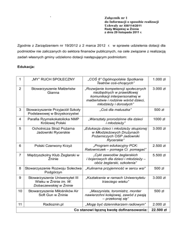` Załącznik nr 1 do Informacji o sposobie realizacji Uchwały nr XIII/114/2011 Rady Miejskiej w Żninie z dnia 29 listopada 2011 r. Zgodnie z Zarządzeniem nr 19/2012 z 2 marca 2012 r. w sprawie udzielenia dotacji dla podmiotów nie zaliczanych do sektora finansów publicznych, na cele związane z realizacją zadań własnych gminy udzielono dotacji następującym podmiotom: Edukacja: 1 „MY” RUCH SPOŁECZNY „COŚ 8” Ogólnopolskie Spotkania Teatrów coś-chcących” 1.000 zł 2 Stowarzyszenie Małżeństw Gianna „Rozwijanie kompetencji społecznych niezbędnych w prawidłowej komunikacji interpersonalnej w małżeństwie i rodzinie wśród dzieci, młodzieży i dorosłych” 3.000 zł 3 Stowarzyszenie Przyjaciół Szkoły Podstawowej w Brzyskorzystwi „Coś dla maluszka” 500 zł 4 Parafia Rzymskokatolicka NMP Królowej Polski „Warsztaty prorodzinne dla dzieci i młodzieży” 1000 zł 5 Ochotnicza Straż Pożarna Jadowniki Rycerskie „Edukacja dzieci i młodzieży skupionej w Młodzieżowych Drużynach Pożarniczych OSP Jadowniki Rycerskie” 3.000 zł 6 Polski Czerwony Krzyż „Program edukacyjny PCK: Ratowniczek – pomaga Ci pomagać” 2.500 zł 7 Międzyszkolny Klub Żeglarski w Żninie „Cykl zawodów żeglarskich i bojerowych dla dzieci i młodzieży – obóz żeglarski, szkolenia” 5.500 zł 8 Stowarzyszenie Rozwoju Sołectwa Podgórzyn „Kulinarna przyjemność w sercu wsi” 500 zł 9 Stowarzyszenie Uniwersytet III Wieku w Żninie im. W. Dobaczewskiej w Żninie „Kształcenie w ramach Uniwersytetu trzeciego wieku” 3.000 zł 10 Stowarzyszenie Miłośników Air Soft Gun w Żninie „Maszynista, toromistrz, monter nawierzchni kolejowej, zawód z pasją – przekonaj się” 500 zł 11 Radioznin.pl „Mogę być dziennikarzem radiowym” 2.000 zł Co stanowi łączną kwotę dofinansowania: 22.500 zł Pomoc społeczna, w tym pomoc rodzinom i osobom w trudnej sytuacji życiowej oraz wyrównywanie szans tych rodzin i osób: 1 Kościół Ewangelickich Chrześcijan „Gwiazdkowa niespodzianka” Co stanowi łączną kwotę dofinansowania: 500 zł 500 zł Działalność na rzecz osób niepełnosprawnych: 1 Warsztat terapii Zajęciowej „Promyk” „IX Dzień Godności Osób Niepełnosprawnych w Żninie” 1.600 zł 2 Stowarzyszenie Kalejdoskop Żnin „Razem bez granic – spotkania integracyjne dla osób niepełnosprawnych” 1.600 zł 3 Polski Związek Niewidomych „Szumi las II” 1.600 zł 4 Stowarzyszenie Osób ze Stwardnieniem Rozsianym „Walczymy z SM” 4.200 zł 5 Stowarzyszenie Sympatyków Harcerstwa Żnińskiego „Do zobaczenia na szlaku” 5.000 zł Co stanowi łączną kwotę dofinansowania: 14.000 zł Ochrona i promocja zdrowia: 1 Polski Czerwony Krzyż Zarząd Rejonowy „Działalność na rzecz rozwoju Honorowego Krwiodawstwa oraz pozyskiwania Honorowych Dawców Krwi na terenie gm. Żnin” 2.000 zł 2 Stowarzyszenie Januszkowo „Mówię coraz ładniej” 1.000 zł 3 Radiożnin.pl „Żyj zdrowo” 3.000 zł 4 Stowarzyszenie Smacznie, Zdrowo, Kolorowo „Wycieczka Myślęcinek” 1.000 zł Co stanowi łączną kwotę dofinansowania: 7.000 zł Kultura: 1 Stowarzyszenie Silverado City „Pałucki Piknik Country w Silverado City” 5.000 zł 2 Stowarzyszenie na Rzecz Integracji i Rozwoju Wsi: Cerekwica, Kaczkowo, Kaczkówko „Święto plonów w Cerekwicy” 500 zł 3 Polski Związek Niewidomych „Jubileusz 60 lat” 1.500 zł 4 Stowarzyszenie Śpiewacze Chór Męski im. St. Moniuszki w Żninie „Promocja i upowszechniane twórczości kulturalnej poprzez cykl występów i udział w konkursach” 5.000 zł 5 Parafia pw. NMP Królowej Polski „Cykliczne Wydarzenia Kulturalne” 5.000 zł 6 Pałucki Oddział PTTK w Żninie „Ogólnopolski Młodzieżowy Konkurs Krajoznawczy „Poznajemy Ojcowiznę” 2.000 zł 7 Stowarzyszenie „My” Ruch Społeczny ”Rock’12” 1.000 zł 8 Stowarzyszenie edukacyjne Nasza Szkoła w Gorzycach „Uśmiech dziecka” 1.800 zł 9 Stowarzyszenie Uniwersytet III Wieku im. W. Dobaczewskiej w Żninie „Z muzyka i pieśnią przez epoki” 4.000 zł 10 Stowarzyszenie na Rzecz Rozwoju Wsi Jaroszewo k. Żnina „Smaki tradycji” 2.000 zł Co stanowi łączną kwotę dofinansowania: 27.800 zł Wspieranie i upowszechnianie kultury fizycznej: 1 Stowarzyszenie Przyjaciół Szkoły Podstawowej w Brzyskorzystwi „Przełajowy bieg familijny” 300 zł 2 Stowarzyszenie Silverado City „Pałuckie otwarte zawody w powożeniu” 4.000 zł 3 Miejsko-Gminne Zrzeszenie Ludowe Zespoły Sportowe w Żninie „Eliminacje i udział sportowców wiejskich w Olimpiadzie Tuchola 2012r. Oraz dbanie o zdrowie i rozwój fizyczny dzieci i młodzieży poprzez organizacje imprez sportowo – rekreacyjnych” 5.000 zł 4 Stowarzyszenie Windsurfing Team Żnin „Finał Pucharu Polski w Żninie” 5.000 zł 5 Pałuckie Wodne Ochotnicze Pogotowie Ratunkowe „Organizacja bezpiecznych imprez wodniackich i pływackich o charakterze gminnym, powiatowym i regionalnym. Zdrowo, wesoło i bezpiecznie pływamy.” 6.000 zł 6 Żniński Klub Biegacza „1992” „Upowszechnianie lekkiej atletyki poprzez masowe biegi przełajowe i uliczne na terenie Gminy Żnin” 1.500 zł 7 Liga Obrony Kraju KujawskoPomorska Organizacja Wojewódzka „Organizacja zawodów w sportach strzeleckich i politechnicznych wraz ze szkoleniem dzieci i młodzieży” 5.000 zł 8 Związek Wędkarski „Pałuczanin” w Żninie „Cykl zawodów wędkarskich w roku 2012” 4.000 zł 9 Międzyszkolny Klub Żeglarski „Cykl zawodów i imprez żeglarskich i bojerowych dla dzieci i młodzieży” 3.000 zł „Obozy sportowo-rekreacyjne w 3.000 zł 10 Klubu Sportowego „Jeziorak” Żnin Słębowie, turnieje, zawody i rozgrywki piłkarskie” 11 Stowarzyszenie na rzecz rozwoju wsi Wawrzynki W zdrowym ciele zdrowy duch 500 zł 12 Międzyzakładowy Ludowy Klub Sportowy „Pałuki” „Hokej łączy pokolenia – cykl imprez integracyjno - sportowych” 1.500 zł 13 Stowarzyszenie Eduk