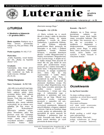 Kościół Ewangelicko–Augsburski w RP – www.luteranie.pl Luteranie 17 grudni a 2003 przegląd tygodniowy luteranie.pl - nr 9 LITURGIA 4. Niedziela w Adwencie – 21 grudnia 2003 r. Hasło tygodnia: Radujcie się w Panu zawsze; powtarzam, radujcie się, Pan jest blisko. (Flp 4,4.5) Psalm tygodnia: Ps 102,17-23 Pieśń dnia: „Córko Syjońska, wesel bardzo się” (9), „Raduj się Syjoński zborze” (23) Graduale: Upamiętnię imię twoje przez wszystkie pokolenia, dlatego ludy wysławiać cię będą po wieki wieczne. Alleluja! (Ps 45,18) Teksty liturgiczne: Stary Testament – Iz 52,7-10: „Jak miłe są na górach nogi tego, który zwiastuje radosną wieść, który ogłasza pokój, który zwiastuje dobro, który ogłasza zbawienie, który mówi do Syjonu: Twój Bóg jest królem. Słuchaj! Twoi strażnicy podnoszą głos, razem radośnie wykrzykują, bo na własne oczy oglądają, jak Pan wraca na Syjon. Wykrzykujcie! Śpiewajcie radośnie razem, gruzy Jeruzalemu, gdyż Pan pociesza swój lud, wykupuje Jeruzalem! Pan obnażył swoje święte ramię na oczach wszystkich narodów i oglądają wszystkie krańce ziemi zbawienie naszego Boga.” Kazanie – Flp 4,4-7: Ewangelia – Łk 1,39-56: „A Maria wybrała się w onych dniach w drogę i udała się śpiesznie do górskiej krainy, do miasta judzkiego, i weszła do domu Zachariasza, i pozdrowiła Elżbietę. A gdy Elżbieta usłyszała pozdrowienie Marii, poruszyło się dzieciątko w jej łonie, i Elżbieta napełniona została Duchem Świętym, i zawołała donośnym głosem i rzekła: Błogosławionaś ty między niewiastami i błogosławiony owoc żywota twego. A skądże mi to, że matka mojego Pana przyszła do mnie? Bo oto, gdy dotarł do uszu moich głos pozdrowienia twego, poruszyło się z radości dzieciątko w moim łonie. I błogosławiona, która uwierzyła, że nastąpi wypełnienie słów, które Pan do niej wypowiedział. I rzekła Maria: Wielbi dusza moja Pana, i rozradował się duch mój w Bogu, Zbawicielu moim, bo wejrzał na uniżoność służebnicy swojej. Oto bowiem odtąd błogosławioną zwać mnie będą wszystkie pokolenia. Bo wielkie rzeczy uczynił mi Wszechmocny, i święte jest imię jego. A miłosierdzie jego z pokolenia w pokolenie nad tymi, którzy się go boją. Okazał moc ramieniem swoim, rozproszył pysznych z zamysłów ich serc, strącił władców z tronów, a wywyższył poniżonych, łaknących nasycił dobrami, a bogaczy odprawił z niczym. Ujął się za Izraelem, sługą swoim, pomny na miłosierdzie, jak powiedział do ojców naszych, do Abrahama i potomstwa jego na wieki. Pozostała tedy Maria u niej około trzech miesięcy, po czym powróciła do domu swego.” Kościół Ewangelicko-Augsburski w RP www.luteranie.pl, 17.12.2003 -1- „Radujcie się w Panu zawsze; powtarzam, radujcie się. Skromność wasza niech będzie znana wszystkim ludziom: Pan jest blisko. Nie troszczcie się o nic, ale we wszystkim w modlitwie i błaganiach z dziękczynieniem powierzcie prośby wasze Bogu. A pokój Boży, który przewyższa wszelki rozum, strzec będzie serc waszych i myśli waszych w Chrystusie Jezusie.” Oczekiwanie ks. bp Paweł Anweiler Na skaju wielkiego miasta, znalazłem się wśród błyszczących różnymi barwami setek samochodów. Oczy mam rozbiegane, oczy mam wręcz oczarowane, prawie że nic innego nie widzę. Gdzie jestem!? Wielki parking a wokół niego same supermarkety. Światło reklam; Tłum ludzi... pchają wyładowane po brzegi wózki z towarami, kolorowo, obficie. Na ludzkich twarzach radość nabywania i chęć posiadania coraz więcej i lepszego. Sam ulegam oślepieniu. I nagle słyszę; ktoś woła; to głos w mej duszy, która przecież Twoja. Jezusie, Synu Dawida! Zmiłuj się nade mną! Aa mojej drodze są pędzące samochody i eksplodujące samoloty. Na mojej drodze przede wszystkim są ludzie, tacy sami jak ja. W Nowym Jorku, w Warszawie, w Afganistanie..., także i w Bielsku: Ludzie wolni i zniewoleni, bezrobotni n kresu psychicznej wytrzymałości, ludzie w bogactwie zamknięci dla innych i ludzie, dający swój datek głodnemu. Życie moje jest splotem dróg. Każdy człowiek, także i ja. patrząc na czas i miejsce swego życia, doświadcza różnej wartości swej drogi. Jest droga zła. Jest droga niewiary. Jest droga adwentowej ufności. Codziennie uczę się wybierać drogę; Droga jest mi potrzebna abym: nie zbłądził. sam nie zaginął, a innym mógł wskazać właściwy kierunek. Jest to 23. wiersz 73. psalmu, psalmu - świadectwa o wiernym trwaniu przy Bogu. Niech nas nie rozpraszają przed świętami, hałaśliwe zabiegi. Adwent ma służyć wyciszeniu i rozmodleniu, by prawdziwie przyjąć nowonarodzone Dzieciątko Jezus jako Króla Chwał. Cytowany psalm, werbalizuje pytania współczesnego człowieka. Dlatego, ci co szydzą sobie z Prawa Bożego, żyją w dostatku, natomiast nieszczęścia spadają na tych, którzy najmniej na nie zasługują. Pojawia się zawiść, zgorzknienie i nieobliczalne w skutkach słowa, które lepiej by było przemilczeć. Dopiero wtedy, gdy psalm zwraca się ku Bogu, zaczyna dostrzegać to, co kryje się za poczuciem fałszywego bezpieczeństwa. W rzeczywistości ludzie pobożni mają wszystko to, co się liczy, co naprawdę ma wartość w wieczności. Tak Panie i ja chce widzieć, spraw abym przejrzał. Abym mógł widzieć Ciebie jako jedyną drogę i cel mego życia. A wiem, że wszystko inne będzie mi dodane. Niech się więc święci najpierw imię Twoje, Królestwo Twoje niechaj mnie przenika, Twoja wola u Ciebie niechaj mną kieruje, Za chleb powszedni, który dzisiaj dajesz, pokornie głowę skłaniam, Win mi nie pamiętaj i spraw bym puścił także w niepamięć, Daj mi próbę i doświadczenia na miarę moich ludzkich możliwości przez Ciebie wspieranych, I wybaw od zła wszelkiego, Twoje jest Królestwo i moc i chwała na wieki. Amen. „Bom przecież jam zawsze z Tobą, tyś ujął prawą rękę