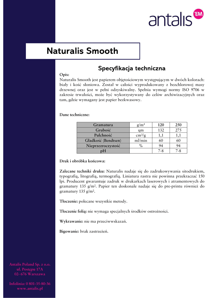 Naturalis Smooth Specyfikacja techniczna Opis: Naturalis Smooth jest papierem objętościowym występującym w dwóch kolorach: biały i kość słoniowa. Został w całości wyprodukowany z bezchlorowej masy drzewnej oraz jest w pełni odzyskiwalny. Spełnia wymogi normy ISO 9706 w zakresie trwałości, moŜe być wykorzystywany do celów archiwizacyjnych oraz tam, gdzie wymagany jest papier bezkwasowy. Dane techniczne: Gramatura Grubość Pulchność Gładkość (Bendtsen) Nieprzezroczystość pH g/m² ųm cm3/g ml/min % 120 132 1,1 60 94 7-8 250 275 1,1 60 94 7-8 Druk i obróbka końcowa: Zalecane techniki druku: Naturalis nadaje się do zadrukowywania sitodrukiem, typografią, litografią, termografią. Liniatura rastra nie powinna przekraczać 150 lpi. Producent gwarantuje zadruk w drukarkach laserowych i atramentowych do gramatury 135 g/m2. Papier ten doskonale nadaje się do pre-printu równieŜ do gramatury 135 g/m2. Tłoczenie: polecane wszystkie metody. Tłoczenie folią: nie wymaga specjalnych środków ostroŜności. Wykrawanie: nie ma przeciwwskazań. Bigowanie: brak zastrzeŜeń. Antalis Poland Sp. z o.o. ul. Postępu 17A 02- 676 Warszawa Infolinia: 0 801-35-80-36 www.antalis.pl