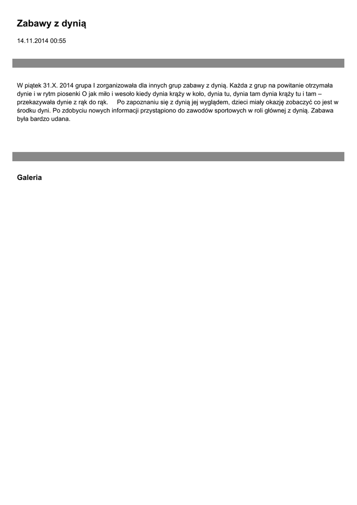 Zabawy z dynią 14.11.2014 00:55 W piątek 31.X. 2014 grupa I zorganizowała dla innych grup zabawy z dynią. Każda z grup na powitanie otrzymała dynie i w rytm piosenki O jak miło i wesoło kiedy dynia krąży w koło, dynia tu, dynia tam dynia krąży tu i tam – przekazywała dynie z rąk do rąk. Po zapoznaniu się z dynią jej wyglądem, dzieci miały okazję zobaczyć co jest w środku dyni. Po zdobyciu nowych informacji przystąpiono do zawodów sportowych w roli głównej z dynią. Zabawa była bardzo udana. Galeria