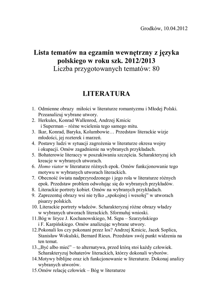 Grodków, 10.04.2012 Lista tematów na egzamin wewnętrzny z języka polskiego w roku szk. 2012/2013 Liczba przygotowanych tematów: 80 LITERATURA 1. Odmienne obrazy miłości w literaturze romantyzmu i Młodej Polski. Przeanalizuj wybrane utwory. 2. Herkules, Konrad Wallenrod, Andrzej Kmicic i Superman – różne wcielenia tego samego mitu. 3. Ikar, Konrad, Baryka, Kolumbowie… Przedstaw literackie wizje młodości, jej rozterek i marzeń. 4. Postawy ludzi w sytuacji zagrożenia w literaturze okresu wojny i okupacji. Omów zagadnienie na wybranych przykładach. 5. Bohaterowie literaccy w poszukiwaniu szczęścia. Scharakteryzuj ich kreacje w wybranych utworach. 6. Homo viator w literaturze różnych epok. Omów funkcjonowanie tego motywu w wybranych utworach literackich. 7. Obecność świata nadprzyrodzonego i jego rola w literaturze różnych epok. Przedstaw problem odwołując się do wybranych przykładów. 8. Literackie portrety kobiet. Omów na wybranych przykładach. 9. Zaprezentuj obrazy wsi nie tylko „spokojnej i wesołej” w utworach pisarzy polskich. 10. Literackie portrety władców. Scharakteryzuj różne obrazy władzy w wybranych utworach literackich. Sformułuj wnioski. 11. Bóg w liryce J. Kochanowskiego, M. Sępa – Szarzyńskiego i F. Karpińskiego. Omów analizując wybrane utwory. 12. Pokonali los czy pokonani przez los? Andrzej Kmicic, Jacek Soplica, Stanisław Wokulski, Bernard Rieux. Przedstaw swój punkt widzenia na ten temat. 13. „Być albo mieć” – to alternatywa, przed którą stoi każdy człowiek. Scharakteryzuj bohaterów literackich, którzy dokonali wyborów. 14. Motywy biblijne oraz ich funkcjonowanie w literaturze. Dokonaj analizy wybranych utworów. 15. Omów relację człowiek – Bóg w literaturze (od antyku do współczesności). Zanalizuj wybrane utwory. 16. Sarmackie portrety. Omów temat, analizując wybrane utwory, np. W. Potockiego, J. Ch. Paska, I. Krasickiego, J.U. Niemcewicza, A. Mickiewicza, H Sienkiewicza. 17. Omów zjawisko tragizmu bohaterów romantycznych na wybranych przykładach dzieł literackich. 18. Indywidualizm - wyraz dumy i wielkości człowieka, przejaw jego pychy, manifestacja inności... Zaprezentuj postawy wybranych bohaterów literackich, których nazwałbyś indywidualistami. 19. Poezja metafizyczna epoki baroku. Scharakteryzuj ją na wybranych przykładach. 20. Odwołując się do wybranych tekstów literackich, przedstaw funkcjonowanie motywu winy i kary. 21. Odwołując się do wybranych przykładów literackich, przedstaw różne postawy wobec cierpienia. 22. Tęsknota za ojczyzną jako motyw literatury polskiej. Przedstaw temat odwołując się do utworów z różnych epok literackich. 23. Różne koncepcje walki narodowowyzwoleńczej w literaturze polskiej. Omów zagadnienie odwołując się do wybranych przykładów. 24. Krytyka wad i postaw ludzkich w literaturze baroku i oświecenia. Przedstaw temat odwołując się do wybranych przykładów. 25. Biografia jako klucz do odczytania twórczości artysty (np. J. Kochanowski, A. Mickiewicz, J. Słowacki,S. Witkiewicz, K. K. Baczyński). 26. Symbol jako środek wyrazu w literaturze. Omów funkcjonowanie symboli w wybranych tekstach literackich. 27. Teatr mundi w literaturze różnych epok. Omów sposoby ujęcia tego motywu w wybranych utworach literackich. 28. Bunt jako sens istnienia i walka o zagrożone wartości. Przedstaw problem w oparciu o utwory literackie wybranych epok. 29. „Polska... ale jaka...?”. Przedstaw wizję wymarzonej ojczyzny w wybranych utworach literatury różnych epok. 30. Motywy mitologiczne – omów ich funkcjonowanie w literaturze wybranych epok. 31. Dekalog bohaterów okresu wojny i okupacji. Omów problem w oparciu o wybrane utwory. 32. Kodeks rycerski jako zasady etyczne bohaterów literackich. Omów problem w oparciu o przykłady wybranych bohaterów literackich różnych epok. 33. Różne oblicza miłości. Omów zagadnienie odwołując się do wybranych przykładów literackich. 34. Wizerunek człowieka w twórczości Wisławy Szymborskiej. Omów na przykładzie wybranych przez siebie utworów. 35. Bohater z książką w ręku. Rola literatury w życiu wybranych bohaterów literackich. Omów zagadnienie odwołując się do wybranych przykładów. ZWIĄZKI LITERATURY Z INNYMI DZIEDZINAMI SZTUKI 1. Problemy młodzieży obecne w literaturze, tekstach piosenek i w filmie. Dokonaj analizy i interpretacji wybranych tekstów kultury. 2. Przedstaw wizję piekła i raju w wybranych tekstach kultury (literatura, malarstwo…). 3. Przedstaw funkcjonowanie motywu śmierci w literaturze i malarstwie. 4. Siedem grzechów głównych w literaturze i filmie. Dokonaj analizy i interpretacji wybranych tekstów kultury. 5. Wydarzenia historyczne i wielkie postaci jako temat dzieł sztuki. Omów, analizując wybrane dzieła z literatury i innych dziedzin sztuki. 6. Impresjonizm w malarstwie i literaturze XIX wieku. Przedstaw zagadnienie na wybranych przykładach. 7. Tematy katastroficzne w literaturze, malarstwie i filmie. Omów zagadnienie odwołując się do wybranych przykładów. 8. Raj, Eden, Arkadia w literaturze i sztuce. Dokonaj analizy wybranych dzieł. 9. Uczniowie, nauczycie i szkoła w literaturze i filmie. Omów na wybranych przykładach. 10. Motyw męki Pańskiej w literaturze, malarstwie i muzyce. Omów na wybranych przykładach. 11. Motywy mitologiczne w literaturze i sztuce. Przedstaw na wybranych przykładach. 12. Portrety dzieci w literaturze, malarstwie i filmie. Omów na wybranych przykładach. 13. Na wybranych przykładach omów kreacje postaci rycerza w literaturze i innych dziedzinach sztuki. 14. Góry jako temat twórczości literackiej i malarskiej. Dokonaj analizy porównawczej wybranych dzieł. 15. Motywy apokalipsy w literaturze i sztuce. Omów zagadnienie odwołując się do wybranych utworów. 16. Motywy muzyczne w literaturze różnych epok. Omów ich znaczenie w przywołanych przez Ciebie tekstach. 17. Fil