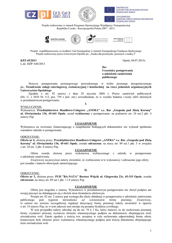 Projekt realizowany w ramach Programu Operacyjnego Współpracy Transgranicznej Republika Czeska - Rzeczpospolita Polska 2007 - 2013. Projekt współfinansowany ze środków Unii Europejskiej w ramach Europejskiego Funduszu Społecznego Projekt realizowany przez Uniwersytet Opolski pn. „Nauka dla przemysłu- przemysł z nauką 2” KPZ 45/2013 L.dz. DZP: 644/2013 Opole, 04.07.2013r. Do: Uczestnicy postępowania o udzielenie zamówienia publicznego Dotyczy postępowania przetargowego prowadzonego w trybie przetargu nieograniczonego pn.: Świadczenie usługi cateringowej, restauracyjnej i hotelarskiej na rzecz jednostek organizacyjnych Uniwersytetu Opolskiego Zgodnie z art. 92 ustawy z dnia 29 stycznia 2004 r. Prawo zamówień publicznych (Dz. U. z 2010 Nr 113, poz. 759 z póź. zm.) zawiadamiam, że w wyniku badania i oceny ofert złożonych w przedmiotowym postępowaniu: I. WYKLUCZENIE: Wykonawca: Przedsiębiorstwo Handlowo-Usługowe „ANFRA” s.c. Bar „Gospoda pod Złotą Koroną” ul. Oświęcimska 136, 45-641 Opole, został wykluczony z postępowania: na podstawie art. 24 ust.2 pkt. 4 ustawy Pzp. UZASADNIENIE Wykonawca na wezwanie Zamawiającego o uzupełnienie brakujących dokumentów nie wykazał spełnienia warunków udziału w postępowaniu ODRZUCENIE: Oferta nr 6, złożona przez: Przedsiębiorstwo Handlowo-Usługowe „ANFRA” s.c. Bar „Gospoda pod Złotą Koroną” ul. Oświęcimska 136, 45-641 Opole, została odrzucona: na mocy art. 89 ust.1 pkt. 5 w związku z art. 24 ust. 2 pkt. 4 ustawy Pzp. UZASADNIENIE Oferta została złożona przez wykonawcę wykluczonego z udziału w postępowaniu o udzielenie zamówienia. Zważywszy na powyższe należy stwierdzić, że wykluczenie w/w wykonawcy i odrzucenie jego oferty jest zasadne i stanowi obowiązek zamawiającego. II. ODRZUCENIE: Oferta nr 3, złożona przez: PUH ”BA-NATA” Bartosz Wójcik ul. Głogowska 23c, 45-315 Opole, została odrzucona: na mocy art. 89 ust.1 pkt. 1 i 8 ustawy Pzp. UZASADNIENIE Oferta jest niegodna z ustawą. Wykonawca w przedmiotowym postępowaniu nie złożył podpisu ani swojej pieczęci na składającym się z dwóch stron formularzu ofertowym. Przepis art. 82 ust. 2 ustawy pzp wymaga dla oferty składanej w postępowaniu o udzielenie zamówienia publicznego pod rygorem nieważności ad solemnitatem formy pisemnej. Zważywszy, iż ustawa nie zawiera szczegółowej regulacji dotyczącej formy pisemnej należy stwierdzić w oparciu o art. 14 ustawy Pzp, że w tym zakresie tym stosuje się przepisy Kodeksu cywilnego. W tym przypadku należy odwołać się do art. 78 § 1 Kc, który stanowi, że do zachowania pisemnej formy czynności prawnej wystarcza złożenie własnoręcznego podpisu na dokumencie obejmującym treść oświadczenia woli. Zatem zgodnie z treścią ww. przepisu w celu zachowania odpowiedniej formy oferty koniecznym było złożenie przez wykonawcę własnoręcznego podpisu pod treścią dokumentu obejmującego treść oświadczenia woli. 1 Projekt realizowany w ramach Programu Operacyjnego Współpracy Transgranicznej Republika Czeska - Rzeczpospolita Polska 2007 - 2013. Projekt współfinansowany ze środków Unii Europejskiej w ramach Europejskiego Funduszu Społecznego Projekt realizowany przez Uniwersytet Opolski pn. „Nauka dla przemysłu- przemysł z nauką 2” Poprzez złożenie podpisu na dokumencie obejmującym oświadczenie woli podpisujący wyraża wolę wywołania określonych skutków prawnych. Ponadto złożenie podpisu wskazuje, że dokument nie jest projektową, lecz ostateczną wersją określonego oświadczenia a także, że oświadczenie jest zupełne i pochodzi od osoby podpisanej (por. wyrok KIO z dnia 14 listopada 2011 r., KIO 2368/11). Brak prawidłowego własnoręcznego podpisania oferty nie może być konwalidowany w postępowaniu o udzielenie zamówienia publicznego, co skutkuje brakiem zachowania pisemnej formy oferty i powoduje konieczność odrzucenia oferty na podstawie art. 89 ust. 1 pkt. 1 i 8 ustawy Pzp. Zważywszy na powyższe należy stwierdzić, że wykluczenie w/w wykonawcy i odrzucenie jego oferty jest zasadne i stanowi obowiązek zamawiającego. KIEROWNIK Działu Zamówień Publicznych mgr Stanisław Piestrak 2
