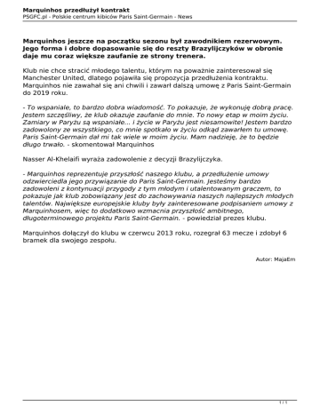 Marquinhos przedłużył kontrakt PSGFC.pl - Polskie centrum kibiców Paris Saint-Germain - News Marquinhos jeszcze na początku sezonu był zawodnikiem rezerwowym. Jego forma i dobre dopasowanie się do reszty Brazylijczyków w obronie daje mu coraz większe zaufanie ze strony trenera. Klub nie chce stracić młodego talentu, którym na poważnie zainteresował się Manchester United, dlatego pojawiła się propozycja przedłużenia kontraktu. Marquinhos nie zawahał się ani chwili i zawarł dalszą umowę z Paris Saint-Germain do 2019 roku. - To wspaniale, to bardzo dobra wiadomość. To pokazuje, że wykonuję dobrą pracę. Jestem szczęśliwy, że klub okazuje zaufanie do mnie. To nowy etap w moim życiu. Zamiary w Paryżu są wspaniałe... i życie w Paryżu jest niesamowite! Jestem bardzo zadowolony ze wszystkiego, co mnie spotkało w życiu odkąd zawarłem tu umowę. Paris Saint-Germain dał mi tak wiele w moim życiu. Mam nadzieję, że to będzie długo trwało. - skomentował Marquinhos Nasser Al-Khelaifi wyraża zadowolenie z decyzji Brazylijczyka. - Marquinhos reprezentuje przyszłość naszego klubu, a przedłużenie umowy odzwierciedla jego przywiązanie do Paris Saint-Germain. Jesteśmy bardzo zadowoleni z kontynuacji przygody z tym młodym i utalentowanym graczem, to pokazuje jak klub zobowiązany jest do zachowywania naszych najlepszych młodych talentów. Największe europejskie kluby były zainteresowane podpisaniem umowy z Marquinhosem, więc to dodatkowo wzmacnia przyszłość ambitnego, długoterminowego projektu Paris Saint-Germain. - powiedział prezes klubu. Marquinhos dołączył do klubu w czerwcu 2013 roku, rozegrał 63 mecze i zdobył 6 bramek dla swojego zespołu. Autor: MajaEm 1/1 Powered by TCPDF (www.tcpdf.org)