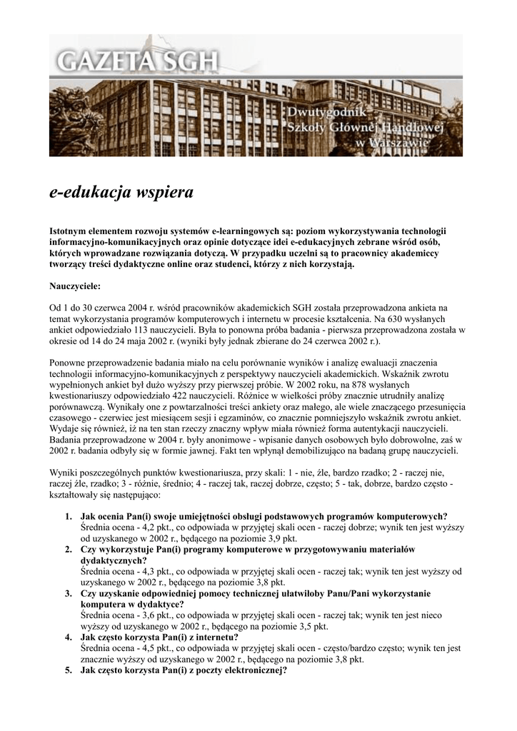 e-edukacja wspiera Istotnym elementem rozwoju systemów e-learningowych są: poziom wykorzystywania technologii informacyjno-komunikacyjnych oraz opinie dotyczące idei e-edukacyjnych zebrane wśród osób, których wprowadzane rozwiązania dotyczą. W przypadku uczelni są to pracownicy akademiccy tworzący treści dydaktyczne online oraz studenci, którzy z nich korzystają. Nauczyciele: Od 1 do 30 czerwca 2004 r. wśród pracowników akademickich SGH została przeprowadzona ankieta na temat wykorzystania programów komputerowych i internetu w procesie kształcenia. Na 630 wysłanych ankiet odpowiedziało 113 nauczycieli. Była to ponowna próba badania - pierwsza przeprowadzona została w okresie od 14 do 24 maja 2002 r. (wyniki były jednak zbierane do 24 czerwca 2002 r.). Ponowne przeprowadzenie badania miało na celu porównanie wyników i analizę ewaluacji znaczenia technologii informacyjno-komunikacyjnych z perspektywy nauczycieli akademickich. Wskaźnik zwrotu wypełnionych ankiet był dużo wyższy przy pierwszej próbie. W 2002 roku, na 878 wysłanych kwestionariuszy odpowiedziało 422 nauczycieli. Różnice w wielkości próby znacznie utrudniły analizę porównawczą. Wynikały one z powtarzalności treści ankiety oraz małego, ale wiele znaczącego przesunięcia czasowego - czerwiec jest miesiącem sesji i egzaminów, co znacznie pomniejszyło wskaźnik zwrotu ankiet. Wydaje się również, iż na ten stan rzeczy znaczny wpływ miała również forma autentykacji nauczycieli. Badania przeprowadzone w 2004 r. były anonimowe - wpisanie danych osobowych było dobrowolne, zaś w 2002 r. badania odbyły się w formie jawnej. Fakt ten wpłynął demobilizująco na badaną grupę nauczycieli. Wyniki poszczególnych punktów kwestionariusza, przy skali: 1 - nie, źle, bardzo rzadko; 2 - raczej nie, raczej źle, rzadko; 3 - różnie, średnio; 4 - raczej tak, raczej dobrze, często; 5 - tak, dobrze, bardzo często kształtowały się następująco: 1. Jak ocenia Pan(i) swoje umiejętności obsługi podstawowych programów komputerowych? Średnia ocena - 4,2 pkt., co odpowiada w przyjętej skali ocen - raczej dobrze; wynik ten jest wyższy od uzyskanego w 2002 r., będącego na poziomie 3,9 pkt. 2. Czy wykorzystuje Pan(i) programy komputerowe w przygotowywaniu materiałów dydaktycznych? Średnia ocena - 4,3 pkt., co odpowiada w przyjętej skali ocen - raczej tak; wynik ten jest wyższy od uzyskanego w 2002 r., będącego na poziomie 3,8 pkt. 3. Czy uzyskanie odpowiedniej pomocy technicznej ułatwiłoby Panu/Pani wykorzystanie komputera w dydaktyce? Średnia ocena - 3,6 pkt., co odpowiada w przyjętej skali ocen - raczej tak; wynik ten jest nieco wyższy od uzyskanego w 2002 r., będącego na poziomie 3,5 pkt. 4. Jak często korzysta Pan(i) z internetu? Średnia ocena - 4,5 pkt., co odpowiada w przyjętej skali ocen - często/bardzo często; wynik ten jest znacznie wyższy od uzyskanego w 2002 r., będącego na poziomie 3,8 pkt. 5. Jak często korzysta Pan(i) z poczty elektronicznej? 6. 7. 8. 9. 10. Średnia ocena - 4,4 pkt., co odpowiada w przyjętej skali ocen - często; wynik ten jest wyższy od uzyskanego w 2002 r., będącego na poziomie 3,8 pkt. Czy zamieszcza Pan(i) materiały dla studentów na stronach internetowych? Średnia ocena - 2,4 pkt., co odpowiada w przyjętej skali ocen - raczej nie; wynik ten jest wyższy od uzyskanego w 2002 r., będącego na poziomie 1,7 pkt. Czy kontaktuje się Pan(i) ze studentami za pomocą poczty elektronicznej? Średnia ocena - 3,7 pkt., co odpowiada w przyjętej skali ocen - raczej tak; wynik ten jest znacznie wyższy od uzyskanego w 2002 r., będącego na poziomie 2,7 pkt. Czy uważa Pan(i), iż należy szerzej wykorzystywać internet w procesie kształcenia? Średnia ocena - 4,0 pkt., co odpowiada w przyjętej skali ocen - raczej tak; prawie 73% nauczycieli biorących udział w ankiecie odpowiedziało na to pytanie tak lub raczej tak; wynik ten jest nieznacznie niższy od uzyskanego w 2002 r., będącego na poziomie 4,1 pkt. Czy chciałby Pan/chciałaby Pani, przy odpowiednim wsparciu technicznym i merytorycznym, opracować materiał i prowadzić przez internet zajęcia uzupełniające do tradycyjnych wykładów i ćwiczeń? Średnia ocena - 3,2 pkt., co odpowiada w przyjętej skali ocen - średnio; ponad 49% nauczycieli biorących udział w ankiecie odpowiedziało na to pytanie tak lub raczej tak; pytanie w takiej formie nie padło w ankiecie przeprowadzanej w 2002 r. Czy chciałby Pan/chciałaby Pani, przy odpowiednim wsparciu technicznym i merytorycznym, opracować materiał i prowadzić pełny wykład/ćwiczenia przez internet? Średnia ocena - 2,6 pkt. co odpowiada w przyjętej skali ocen - średnio; ponad 31% nauczycieli biorących udział w ankiecie odpowiedziało na to pytanie tak lub raczej tak; pytanie w takiej formie nie padło w ankiecie przeprowadzanej w 2002 r. Na pytanie dotyczące użyteczności internetu na poszczególnych formach studiów odpowiedzi, w skali od 1 do 5, były następujące: 1. uzupełnianie zajęć na studiach dziennych - średnia 3,6 pkt.; w 2002 r. wynik ukształtował się na poziomie 3,9 pkt. 2. uzupełnianie zajęć na studiach zaocznych - średnia 4,1 pkt.; ponad 60% respondentów odpowiedziało na to pytanie tak, a 18% raczej tak; w 2002 r. wynik ukształtował się na porównywalnym poziomie 4,3 pkt. 3. pełny wykład (ćwiczenia) na studiach dziennych - średnia 1,9 pkt.; w 2002 r. wynik ukształtował się na poziomie 2,2 pkt. 4. pełny wykład (ćwiczenia) na studiach zaocznych - średnia 2,4 pkt.; w 2002 r. wynik ukształtował się na poziomie 2,7 pkt. 5. pełny wykład (ćwiczenia) na studiach podyplomowych - średnia 2,4 pkt.; w 2002 r. wynik ukształtował się na poziomie 2,8 pkt. 6. pełne studia dzienne - średnia 1,6 pkt.; w 2002 r. wynik ukształtował się na tym samym poziomie 7. pełne studia zaoczne - średnia 1,9 pkt.; w 2002 r. wynik ukształtował się na poziomie 1,8 pkt. 