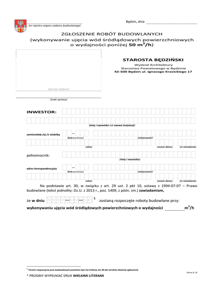 ZGŁOSZENIE ROBÓT BUDOWLANYCH (wykonywanie ujęcia wód