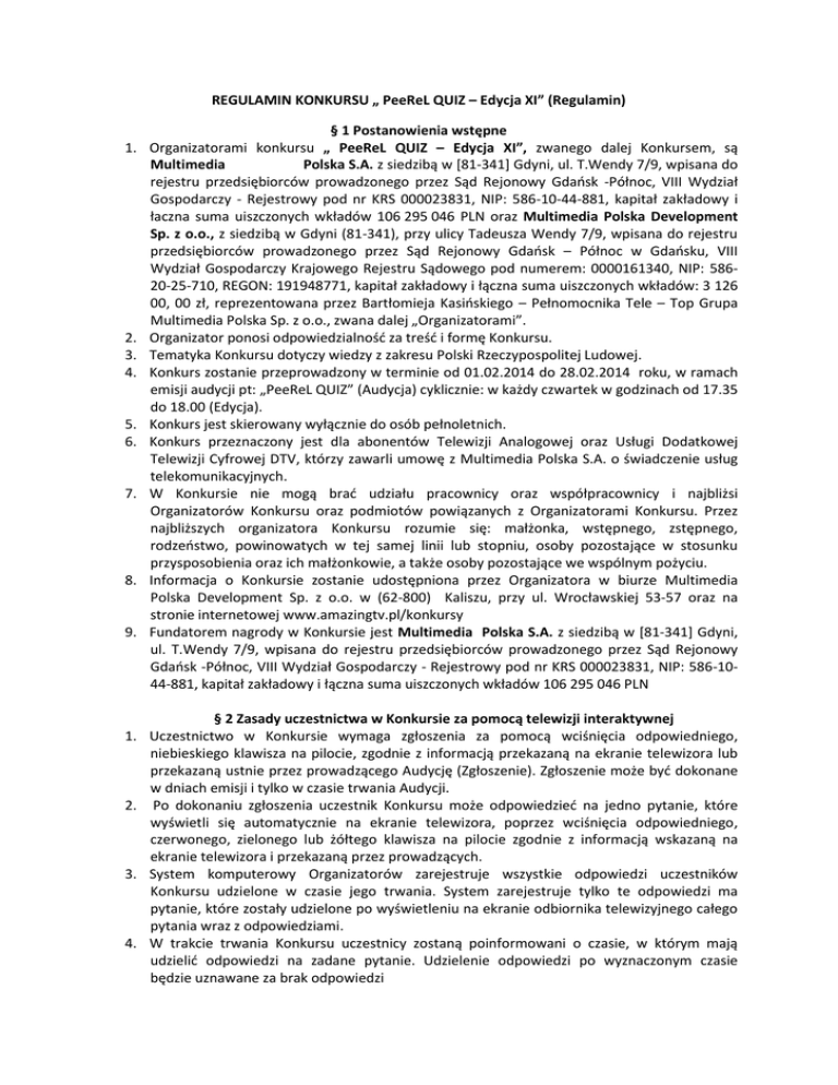 REGULAMIN KONKURSU „ PeeReL QUIZ – Edycja XI” (Regulamin) § 1 Postanowienia wstępne 1. Organizatorami konkursu „ PeeReL QUIZ – Edycja XI”, zwanego dalej Konkursem, są Multimedia Polska S.A. z siedzibą w [81-341] Gdyni, ul. T.Wendy 7/9, wpisana do rejestru przedsiębiorców prowadzonego przez Sąd Rejonowy Gdańsk -Północ, VIII Wydział Gospodarczy - Rejestrowy pod nr KRS 000023831, NIP: 586-10-44-881, kapitał zakładowy i łaczna suma uiszczonych wkładów 106 295 046 PLN oraz Multimedia Polska Development Sp. z o.o., z siedzibą w Gdyni (81-341), przy ulicy Tadeusza Wendy 7/9, wpisana do rejestru przedsiębiorców prowadzonego przez Sąd Rejonowy Gdańsk – Północ w Gdańsku, VIII Wydział Gospodarczy Krajowego Rejestru Sądowego pod numerem: 0000161340, NIP: 58620-25-710, REGON: 191948771, kapitał zakładowy i łączna suma uiszczonych wkładów: 3 126 00, 00 zł, reprezentowana przez Bartłomieja Kasińskiego – Pełnomocnika Tele – Top Grupa Multimedia Polska Sp. z o.o., zwana dalej „Organizatorami”. 2. Organizator ponosi odpowiedzialność za treść i formę Konkursu. 3. Tematyka Konkursu dotyczy wiedzy z zakresu Polski Rzeczypospolitej Ludowej. 4. Konkurs zostanie przeprowadzony w terminie od 01.02.2014 do 28.02.2014 roku, w ramach emisji audycji pt: „PeeReL QUIZ” (Audycja) cyklicznie: w każdy czwartek w godzinach od 17.35 do 18.00 (Edycja). 5. Konkurs jest skierowany wyłącznie do osób pełnoletnich. 6. Konkurs przeznaczony jest dla abonentów Telewizji Analogowej oraz Usługi Dodatkowej Telewizji Cyfrowej DTV, którzy zawarli umowę z Multimedia Polska S.A. o świadczenie usług telekomunikacyjnych. 7. W Konkursie nie mogą brać udziału pracownicy oraz współpracownicy i najbliżsi Organizatorów Konkursu oraz podmiotów powiązanych z Organizatorami Konkursu. Przez najbliższych organizatora Konkursu rozumie się: małżonka, wstępnego, zstępnego, rodzeństwo, powinowatych w tej samej linii lub stopniu, osoby pozostające w stosunku przysposobienia oraz ich małżonkowie, a także osoby pozostające we wspólnym pożyciu. 8. Informacja o Konkursie zostanie udostępniona przez Organizatora w biurze Multimedia Polska Development Sp. z o.o. w (62-800) Kaliszu, przy ul. Wrocławskiej 53-57 oraz na stronie internetowej www.amazingtv.pl/konkursy 9. Fundatorem nagrody w Konkursie jest Multimedia Polska S.A. z siedzibą w [81-341] Gdyni, ul. T.Wendy 7/9, wpisana do rejestru przedsiębiorców prowadzonego przez Sąd Rejonowy Gdańsk -Północ, VIII Wydział Gospodarczy - Rejestrowy pod nr KRS 000023831, NIP: 586-1044-881, kapitał zakładowy i łączna suma uiszczonych wkładów 106 295 046 PLN § 2 Zasady uczestnictwa w Konkursie za pomocą telewizji interaktywnej 1. Uczestnictwo w Konkursie wymaga zgłoszenia za pomocą wciśnięcia odpowiedniego, niebieskiego klawisza na pilocie, zgodnie z informacją przekazaną na ekranie telewizora lub przekazaną ustnie przez prowadzącego Audycję (Zgłoszenie). Zgłoszenie może być dokonane w dniach emisji i tylko w czasie trwania Audycji. 2. Po dokonaniu zgłoszenia uczestnik Konkursu może odpowiedzieć na jedno pytanie, które wyświetli się automatycznie na ekranie telewizora, poprzez wciśnięcia odpowiedniego, czerwonego, zielonego lub żółtego klawisza na pilocie zgodnie z informacją wskazaną na ekranie telewizora i przekazaną przez prowadzących. 3. System komputerowy Organizatorów zarejestruje wszystkie odpowiedzi uczestników Konkursu udzielone w czasie jego trwania. System zarejestruje tylko te odpowiedzi ma pytanie, które zostały udzielone po wyświetleniu na ekranie odbiornika telewizyjnego całego pytania wraz z odpowiedziami. 4. W trakcie trwania Konkursu uczestnicy zostaną poinformowani o czasie, w którym mają udzielić odpowiedzi na zadane pytanie. Udzielenie odpowiedzi po wyznaczonym czasie będzie uznawane za brak odpowiedzi § 3 Zasady uczestnictwa w Konkursie za pomocą aparatu telefonicznego 1. Uczestnictwo w Konkursie wymaga zgłoszenia za pomocą aparatu telefonicznego, poprzez uzyskanie połączenia z numerem (61 599-96-96), zgodnie z informacją przekazaną na ekranie telewizora lub przekazaną ustnie przez prowadzącego Audycję (Zgłoszenie). Zgłoszenie może być dokonane w dniach emisji i tylko w czasie trwania Audycji. 2. Po dokonaniu zgłoszenia uczestnik Konkursu może odpowiedzieć na cztery pytania typu otwartego, które zostaną mu zadane przez osobę prowadzącą Konkurs. Za każdą prawidłową odpowiedź na zadane pytanie uczestnik otrzymuje jeden punkt. 3. W trakcie trwania Konkursu uczestnicy zostaną poinformowani o czasie, w którym mają udzielić odpowiedzi na zadane pytanie. Udzielenie odpowiedzi po wyznaczonym czasie będzie uznawane za brak odpowiedzi. § 4 Dopuszczalna liczna Zgłoszeń Uczestnik może, w ramach Edycji, wziąć udział w konkursie, zarówno w ramach procedury opisanej w § 2 jak i w ramach procedury opisanej w § 3 maksymalnie 1 raz w ramach Edycji. 1. 2. 3. 4. 1. 2. 3. 4. § 5 Zasady wyłonienia laureatów i ogłoszenia zwycięstwa w Konkursie za pomocą telewizji interaktywnej Laureatem Konkursu zostanie jeden z uczestników, który jako pierwszy udzieli poprawnej odpowiedzi na wyświetlone na ekranie na jedno pytanie konkursowe (Laureat). Czas udzielenia odpowiedzi na zadane pytanie będzie liczony od momentu potwierdzenia uczestnictwa w konkursie do momentu zarejestrowania przez system odpowiedzi na zadane pytanie, udzielonej przez uczestnika, poprzez wciśnięcie odpowiedniego klawisza na pilocie. Ogłoszenie wyników nastąpi w dniu konkursu, bezpośrednio po jego zakończeniu. Uczestnik Konkursu otrzyma informację, o tym że został jego Laureatem za pomocą komunikatu, który wyświetli się na ekranie telewizora. Laureat zostanie przy tym poinformowany, że w celu odebrania nagrody jest zobowiązany skontaktować się z Organizatorami w terminie 48 godzin po zakończeniu konkursu w godzinach 09:00 – 16:00 pod nr