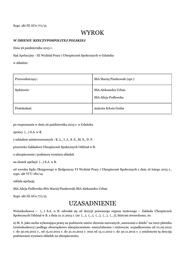 Sygn. akt III AUa 771/15 WYROK W IMIENIU RZECZYPOSPOLITEJ POLSKIEJ Dnia 26 października 2015 r. Sąd Apelacyjny - III Wydział Pracy i Ubezpieczeń Społecznych w Gdańsku w składzie: Przewodniczący: SSA Maciej Piankowski (spr.) Sędziowie: SSA Aleksandra Urban SSA Alicja Podlewska Protokolant: stażysta Sylwia Gruba po rozpoznaniu w dniu 26 października 2015 r. w Gdańsku sprawy (...) S.A. w B. z udziałem zainteresowanych : K. L., I. J., S. S., M. S., D. P. przeciwko Zakładowi Ubezpieczeń Społecznych Oddział w B. o ubezpieczenie i podstawę wymiaru składek na skutek apelacji (...) S.A. w B. od wyroku Sądu Okręgowego w Bydgoszczy VI Wydział Pracy i Ubezpieczeń Społecznych z dnia 16 lutego 2015 r., sygn. akt VI U 182/14 oddala apelację. SSA Alicja Podlewska SSA Maciej Piankowski SSA Aleksandra Urban Sygn. akt III AUa 771/15 UZASADNIENIE Wnioskodawca – (...) S.A. w B. odwołał się od decyzji pozwanego organu rentowego – Zakładu Ubezpieczeń Społecznych Oddział w B. z dnia 21.11.2013 r. (nr (...), (...), (...), (...), (...)), którymi stwierdzono, że: a) M. S. jako osoba wykonująca pracę na podstawie umów zlecenia nazwanych „umowami o dzieło” na rzecz płatnika (wnioskodawcy) podlega obowiązkowo ubezpieczeniom: emerytalnemu i rentowym, wypadkowemu od 01.09.2012 r. do 30.09.2012 r., od 15.10.2012 r. do 31.10.2012 r. oraz od 15.11.2012 r. do 30.11.2012 r. z ustalonymi tą decyzją podstawami wymiaru składek na ubezpieczenia; b) S. S. jako osoba wykonująca pracę na podstawie umów zlecenia nazwanych „umowami o dzieło” na rzecz płatnika (wnioskodawcy) podlega obowiązkowo ubezpieczeniom: emerytalnemu i rentowym, wypadkowemu od 22.06.2012 r. do 30.06.2012 r., od 07.07.2012 r. do 31.07.2012 r., od 06.08.2012 r. do 26.08.2012 r., od 07.09.2012 r. do 30.09.2012 r., od 10.12.2012 r. do 31.12.2012 r. oraz od 28.01.2013 r. do 31.01.2013 r. z ustalonymi tą decyzją podstawami wymiaru składek na ubezpieczenia; c) I. J. jako osoba wykonująca pracę na podstawie umów zlecenia nazwanych „umowami o dzieło” na rzecz płatnika (wnioskodawcy) podlega obowiązkowo ubezpieczeniom: emerytalnemu i rentowym oraz wypadkowemu od 29.02.2012 r. do 29.02.2012 r., od 30.03.2012 r. do 30.03.2012 r. oraz od 07.09.2012 r. do 20.09.2012 r. z ustalonymi tą decyzją podstawami wymiaru składek na ubezpieczenia; d) K. L. jako osoba wykonująca pracę na podstawie umowy zlecenie nazwanej „umową o dzieło” na rzecz płatnika (wnioskodawcy) podlega obowiązkowo ubezpieczeniom: emerytalnemu i rentowym oraz wypadkowemu od 01.08.2012 r. do 31.08.2012 r. z ustaloną tą decyzją podstawą wymiaru składek na ubezpieczenia; e) D. P. jako osoba wykonująca pracę na podstawie umów zlecenia nazwanych „umowami o dzieło” na rzecz płatnika (wnioskodawcy) podlega obowiązkowo ubezpieczeniom: emerytalnemu i rentowym oraz wypadkowemu od 01.07.2012 r. do 31.07.2012 r., od 01.08.2012 r. do 31.08.2012 r., od 01.09.2012 r. do 30.09.2012 r. oraz od 02.10.2012 r. do 27.10.2012 r. z ustalonymi tą decyzją podstawami wymiaru składek na ubezpieczenia. W uzasadnieniach powyższych decyzji organ rentowy podał, że: ad a) przedmiotem umów zawartych z M. S. było „przygotowanie stołu bankietowego”, a umowy były zawierane na okresy od kilkunastu dni do miesiąca, a po ich zakończeniu były z tą samą osobą zawierane kolejne umowy. Wypłata wynagrodzenie odbywała się comiesięcznie (cyklicznie), jak dla pozostałych pracowników. W ramach przygotowania stołu bankietowego zajmowano się obróbką wstępną jarzyn, warzyw i ogólnie pracą związaną z przygotowaniem posiłków, a czynności te były ustalane odgórnie przez kierownika żywienia, który nadzorował pracę. Posiłki były przygotowywane na podstawie wcześniej spisanego jadłospisu. Ponadto obowiązywały ściśle określone godziny pracy oraz miejsce pracy. M. S. nie posiadała w tych okresach innego tytułu do ubezpieczeń społecznych. W zawartych umowach nie określono konkretnego, indywidualnego rezultatu i umowy nie odpowiadały treści art. 627 k.c. Zdaniem pozwanego zawarte umowy należało zakwalifikować jako umowy zlecenia (art. 750 k.c.); ad. b) przedmiotem umów zawartych z S. S. było „wykonanie dekoracji”, „wykonanie rękodzieła oraz „wykonanie dekoracji świątecznej”, a umowy były zawierane na okresy od kilku do kilkunastu dni, a po ich zakończeniu były z tą samą osobą zawierane kolejne umowy. Wypłata wynagrodzenie odbywała się comiesięcznie (cyklicznie), jak dla pozostałych pracowników. W zawartych umowach nie określono konkretnego, indywidualnego rezultatu i umowy nie odpowiadały treści art. 627 k.c. Zdaniem pozwanego zawarte umowy należało zakwalifikować jako umowy zlecenia (art. 750 k.c.). S. S. nie posiadała w tych okresach innego tytułu do ubezpieczeń społecznych; ad. c) przedmiotem umów zawartych z I. J. było „przygotowanie stołu bankietowego”, a umowy były zawierane na okresy od kilku do kilkunastu dni, a po ich zakończeniu były z tą samą osobą zawierane kolejne umowy. Wypłata wynagrodzenie odbywała się comiesięcznie (cyklicznie), jak dla pozostałych pracowników. W ramach przygotowania stołu bankietowego zajmowano się obróbką wstępną jarzyn, warzyw i ogólnie pracą związaną z przygotowaniem posiłków, a czynności te były ustalane odgórnie przez kierownika żywienia, który nadzorował pracę. Posiłki były przygotowywane na podstawie wcześniej spisanego jadłospisu. Ponadto obowiązywały ściśle określone godziny pracy oraz miejsce pracy. I. J. nie posiadała w tych okresach innego tytułu do ubezpieczeń społecznych. W zawartych umowach nie określono konkretnego, indywidualnego rezultatu i umowy nie odpowiadały treści art. 627 k.c. Zdaniem pozwanego zawarte umowy należało zakwalifikować jako umowy zlecenia (art. 750 k.c.); ad. d) przedmiotem umowy zawartej z K. L. było wykonanie zabiegów rehabilitacyjnych. Wyp
