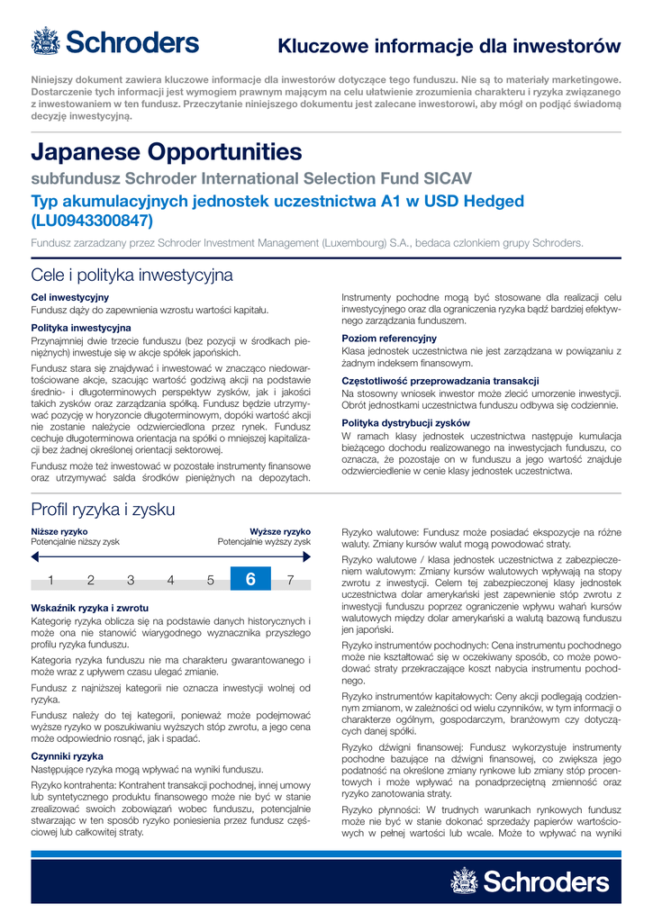 Kluczowe informacje dla inwestorów Niniejszy dokument zawiera kluczowe informacje dla inwestorów dotyczące tego funduszu. Nie są to materiały marketingowe. Dostarczenie tych informacji jest wymogiem prawnym mającym na celu ułatwienie zrozumienia charakteru i ryzyka związanego z inwestowaniem w ten fundusz. Przeczytanie niniejszego dokumentu jest zalecane inwestorowi, aby mógł on podjąć świadomą decyzję inwestycyjną. Japanese Opportunities subfundusz Schroder International Selection Fund SICAV Typ akumulacyjnych jednostek uczestnictwa A1 w USD Hedged (LU0943300847) Fundusz zarzadzany przez Schroder Investment Management (Luxembourg) S.A., bedaca czlonkiem grupy Schroders. Cele i polityka inwestycyjna Cel inwestycyjny Fundusz dąży do zapewnienia wzrostu wartości kapitału. Polityka inwestycyjna Przynajmniej dwie trzecie funduszu (bez pozycji w środkach pieniężnych) inwestuje się w akcje spółek japońskich. Fundusz stara się znajdywać i inwestować w znacząco niedowartościowane akcje, szacując wartość godziwą akcji na podstawie średnio- i długoterminowych perspektyw zysków, jak i jakości takich zysków oraz zarządzania spółką. Fundusz będzie utrzymywać pozycję w horyzoncie długoterminowym, dopóki wartość akcji nie zostanie należycie odzwierciedlona przez rynek. Fundusz cechuje długoterminowa orientacja na spółki o mniejszej kapitalizacji bez żadnej określonej orientacji sektorowej. Fundusz może też inwestować w pozostałe instrumenty finansowe oraz utrzymywać salda środków pieniężnych na depozytach. Instrumenty pochodne mogą być stosowane dla realizacji celu inwestycyjnego oraz dla ograniczenia ryzyka bądź bardziej efektywnego zarządzania funduszem. Poziom referencyjny Klasa jednostek uczestnictwa nie jest zarządzana w powiązaniu z żadnym indeksem finansowym. Częstotliwość przeprowadzania transakcji Na stosowny wniosek inwestor może zlecić umorzenie inwestycji. Obrót jednostkami uczestnictwa funduszu odbywa się codziennie. Polityka dystrybucji zysków W ramach klasy jednostek uczestnictwa następuje kumulacja bieżącego dochodu realizowanego na inwestycjach funduszu, co oznacza, że pozostaje on w funduszu a jego wartość znajduje odzwierciedlenie w cenie klasy jednostek uczestnictwa. Profil ryzyka i zysku Niższe ryzyko Potencjalnie niższy zysk 1 2 Wyższe ryzyko Potencjalnie wyższy zysk 3 4 5 6 7 Wskaźnik ryzyka i zwrotu Kategorię ryzyka oblicza się na podstawie danych historycznych i może ona nie stanowić wiarygodnego wyznacznika przyszłego profilu ryzyka funduszu. Kategoria ryzyka funduszu nie ma charakteru gwarantowanego i może wraz z upływem czasu ulegać zmianie. Fundusz z najniższej kategorii nie oznacza inwestycji wolnej od ryzyka. Fundusz należy do tej kategorii, ponieważ może podejmować wyższe ryzyko w poszukiwaniu wyższych stóp zwrotu, a jego cena może odpowiednio rosnąć, jak i spadać. Czynniki ryzyka Następujące ryzyka mogą wpływać na wyniki funduszu. Ryzyko kontrahenta: Kontrahent transakcji pochodnej, innej umowy lub syntetycznego produktu finansowego może nie być w stanie zrealizować swoich zobowiązań wobec funduszu, potencjalnie stwarzając w ten sposób ryzyko poniesienia przez fundusz częściowej lub całkowitej straty. Ryzyko walutowe: Fundusz może posiadać ekspozycje na różne waluty. Zmiany kursów walut mogą powodować straty. Ryzyko walutowe / klasa jednostek uczestnictwa z zabezpieczeniem walutowym: Zmiany kursów walutowych wpływają na stopy zwrotu z inwestycji. Celem tej zabezpieczonej klasy jednostek uczestnictwa dolar amerykański jest zapewnienie stóp zwrotu z inwestycji funduszu poprzez ograniczenie wpływu wahań kursów walutowych między dolar amerykański a walutą bazową funduszu jen japoński. Ryzyko instrumentów pochodnych: Cena instrumentu pochodnego może nie kształtować się w oczekiwany sposób, co może powodować straty przekraczające koszt nabycia instrumentu pochodnego. Ryzyko instrumentów kapitałowych: Ceny akcji podlegają codziennym zmianom, w zależności od wielu czynników, w tym informacji o charakterze ogólnym, gospodarczym, branżowym czy dotyczących danej spółki. Ryzyko dźwigni finansowej: Fundusz wykorzystuje instrumenty pochodne bazujące na dźwigni finansowej, co zwiększa jego podatność na określone zmiany rynkowe lub zmiany stóp procentowych i może wpływać na ponadprzeciętną zmienność oraz ryzyko zanotowania straty. Ryzyko płynności: W trudnych warunkach rynkowych fundusz może nie być w stanie dokonać sprzedaży papierów wartościowych w pełnej wartości lub wcale. Może to wpływać na wyniki Schroder International Selection Fund SICAV Japanese Opportunities funduszu i wymuszać na funduszu konieczność odroczenia lub zawieszenia operacji umarzania tytułów uczestnictwa. Ryzyko operacyjne: Awarie u dostawców usług mogą prowadzić do strat lub zakłóceń w działalności funduszu. Opłaty Opłaty jednorazowe pobierane przed lub po dokonaniu inwestycji Opłata za subskrypcję 4,00% Opłata za umorzenie brak Jest to maksymalna kwota, jaka może zostać pobrana z Państwa środków przed ich zainwestowaniem. Opłaty pobierane z funduszu w ciągu roku Opłaty bieżące 2,42% Wyszczególnione opłaty za nabycie i umorzenie są wartościami maksymalnymi, w pewnych przypadkach inwestor może zostać obciążony niższymi kwotami. Inwestor może zapoznać się z aktualnie obowiązującymi opłatami za nabycie i umorzenie u swego doradcy finansowego. Wysokość opłat bieżących określa się na podstawie kosztów poniesionych za rok zakończony w grudnia 2015 r i mogą one z roku na rok ulegać zmianie. Opłaty pobierane z funduszu w określonych warunkach szczególnych Opłata za wyniki Opłaty ponoszone przez inwestora służą pokryciu kosztów działalności funduszu, w tym kosztów jego marketingu i dystrybucji. Opłaty obniżają stopę potencjalnego wzrostu wartości inwestycji