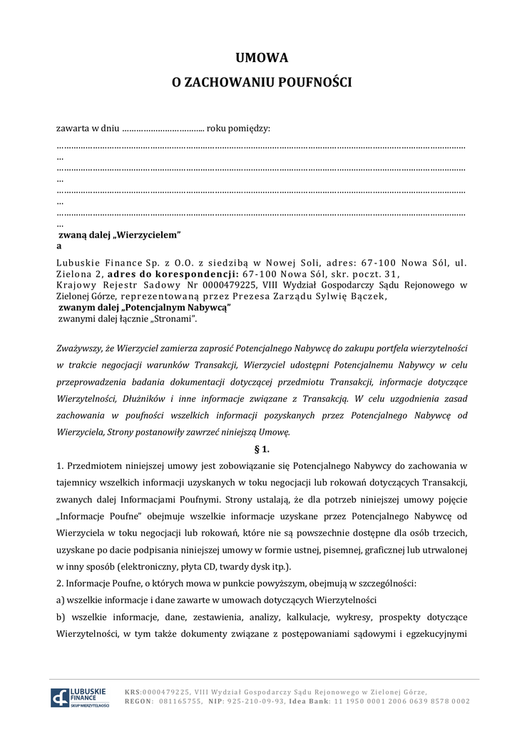 UMOWA O ZACHOWANIU POUFNOŚCI zawarta w dniu …………………………….. roku pomiędzy: ……………………………………………………………………………………………………………………………………………………… … ……………………………………………………………………………………………………………………………………………………… … ……………………………………………………………………………………………………………………………………………………… … ……………………………………………………………………………………………………………………………………………………… … zwaną dalej „Wierzycielem” a Lubuskie Finance Sp. z O.O. z siedzibą w Nowej Soli, adres: 67 -100 Nowa Sól, ul. Zielona 2, adres do korespondencji: 67-100 Nowa Sól, skr. poc zt. 31 , Krajowy Rejestr Sadowy Nr 0000479225, VIII Wydział Gospodarczy Sądu Rejonowego w Zielonej Górze, reprezentowaną przez Prezesa Zarządu Sylwię Bączek , zwanym dalej „Potencjalnym Nabywcą” zwanymi dalej łącznie „Stronami”. Zważywszy, że Wierzyciel zamierza zaprosić Potencjalnego Nabywcę do zakupu portfela wierzytelności w trakcie negocjacji warunków Transakcji, Wierzyciel udostępni Potencjalnemu Nabywcy w celu przeprowadzenia badania dokumentacji dotyczącej przedmiotu Transakcji, informacje dotyczące Wierzytelności, Dłużników i inne informacje związane z Transakcją. W celu uzgodnienia zasad zachowania w poufności wszelkich informacji pozyskanych przez Potencjalnego Nabywcę od Wierzyciela, Strony postanowiły zawrzeć niniejszą Umowę. § 1. 1. Przedmiotem niniejszej umowy jest zobowiązanie się Potencjalnego Nabywcy do zachowania w tajemnicy wszelkich informacji uzyskanych w toku negocjacji lub rokowań dotyczących Transakcji, zwanych dalej Informacjami Poufnymi. Strony ustalają, że dla potrzeb niniejszej umowy pojęcie „Informacje Poufne” obejmuje wszelkie informacje uzyskane przez Potencjalnego Nabywcę od Wierzyciela w toku negocjacji lub rokowań, które nie są powszechnie dostępne dla osób trzecich, uzyskane po dacie podpisania niniejszej umowy w formie ustnej, pisemnej, graficznej lub utrwalonej w inny sposób (elektroniczny, płyta CD, twardy dysk itp.). 2. Informacje Poufne, o których mowa w punkcie powyższym, obejmują w szczególności: a) wszelkie informacje i dane zawarte w umowach dotyczących Wierzytelności b) wszelkie informacje, dane, zestawienia, analizy, kalkulacje, wykresy, prospekty dotyczące Wierzytelności, w tym także dokumenty związane z postępowaniami sądowymi i egzekucyjnymi KRS:0000479225, VIII Wydział Gospodarczy Sądu Rejonowego w Zielonej Górze, REGON: 081165755, NIP: 925-210-09-93, Idea Bank: 11 1950 0001 2006 0639 8578 0002 dotyczącymi Wierzytelności, o ile postępowania takie były prowadzone, dostarczone Potencjalnemu Nabywcy przez Wierzyciela; c) wszelkie dane i informacje dotyczące Dłużników, w tym dane osobowe Dłużników oraz korespondencję z Dłużnikami. d) dane wolumenu zbywanych przez Wierzyciela wierzytelności; § 2. Potencjalny Nabywca zobowiązuje się nieodwołalnie i bezwarunkowo do: 1. zachowania w poufności, nieujawniania i niezezwalania na ujawnienie Informacji Poufnych jakiejkolwiek osobie trzeciej, bez uprzedniej zgody Wierzyciela wyrażonej na piśmie pod rygorem nieważności. 2. niewykorzystywania Informacji Poufnych w jakimkolwiek innym celu niż cel, dla którego zostały ujawnione, tj. uczestnictwa w negocjacji warunków Transakcji (w tym przeprowadzenia badania prawnego dokumentacji Wierzytelności) oraz realizacji Transakcji. 3. zapewnienia bezpieczeństwa Informacji Poufnych, a także chronienia ich przed kradzieżą i nieuprawnionym dostępem. § 3. 1. Potencjalny Nabywca zobowiązuje się do podjęcia stosownych działań zmierzających do zobowiązania jego pracowników, doradców lub innych osób, które będą miały dostęp do Informacji Poufnych, do stosowania postanowień niniejszej umowy. 2. Wszelkie działania lub zaniechania osób, o których mowa w pkt. 1 niniejszego paragrafu, traktowane będą jak działania lub zaniechania Potencjalnego Nabywcy, za które ponosi on pełną odpowiedzialność. 3. Wierzyciel udziela zgody na udostępnienie Informacji Poufnych radcom prawnym, adwokatom, doradcom prawnym lub finansowym Potencjalnego Nabywcy. § 4. Zawartych w niniejszej umowie ograniczeń odnośnie Informacji Poufnych nie stosuje się do Informacji Poufnych, które: a) były znane Potencjalnemu Nabywcy jeszcze przed zawarciem niniejszej umowy, która to okoliczność winna zostać przez niego uprawdopodobniona; b) w trakcie wykonywania niniejszej umowy bądź Transakcji uzyskały status informacji powszechnie znanych § 5. Zobowiązanie do nieujawniania Informacji Poufnych nie wiąże Potencjalnego Nabywcy w przypadku, gdy ujawnienie informacji jest wymagane w związku z obowiązującymi uregulowaniami prawnymi lub w wykonaniu obowiązku nałożonego przez przepisy prawa lub orzeczenie organu władzy sądowej lub administracyjnej. KRS:0000479225, VIII Wydział Gospodarczy Sądu Rejonowego w Zielonej Górze, REGON: 081165755, NIP: 925-210-09-93, Idea Bank: 11 1950 0001 2006 0639 8578 0002 § 6. 1. Informacje Poufne pozostają wyłączną własnością Wierzyciela. Ujawnienie Informacji Poufnej nie oznacza przyznania Potencjalnemu Nabywcy jakiegokolwiek prawa do Informacji Poufnych, poza prawem do wykorzystania zgodnie z niniejszą umową. 2. W przypadku, gdy z jakichkolwiek przyczyn jedna ze Stron przestanie uczestniczyć w procesie negocjacji lub rokowań lub z jakichkolwiek innych powodów Transakcja nie dojdzie do skutku, Potencjalny Nabywca zobowiązuje się po uzgodnieniu z Wierzycielem do zniszczenia wszelkich notatek, analiz, protokołów oraz kopii otrzymanych dokumentów. §