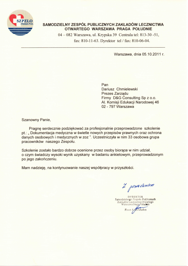 SZPZLO SAMODZIELNY ZESPOL PUBLICZNYCH ZAKLADOW LECZNICTWA OTWARTEGO WARSZAWA PRAGA POLUDNIE 04 - 082 Warszawa, ul. Krypska 39 Centrala tel: 813-30 -51, fax: 810-11-63. Dyrektor tel / fax: 810-06-04. Warszawa, dnia 05.10.2011 r. Pan Dariusz Chmielewski Prezes Zarzadu Firmy D&G Consulting Sp z o.o. Al. Komisji Edukacji Narodowej 46 02 - 797 Warszawa Szanowny Panie, Pragn§ serdecznie podzi^kowac za profesjonalnie przeprowadzone szkolenie pt.: „ Dokumentacja medyczna w swietle nowych przepisow prawnych oraz ochrona danych osobowych i medycznych w zoz". Uczestniczyta w nim 33 osobowa grupa pracownikow naszego Zespolu. Szkolenie zostalo bardzo dobrze ocenione przez osoby biorace w nim udzial, o czym swiadczy wysoki wynik uzyskany w badaniu ankietowym, przeprowadzonym po jego zakohczeniu. Mam nadziej§, na kontynuowanie naszej wspofpracy w przysztosci. DYREKTOR Sarnodzielnejo Zespofu Pu.b'iczt>ych Zdctad6w [xcraictv/a Otwartego Warszawa PrataPo'udaie