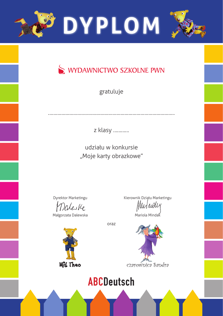 DYPLOM gratuluje …………………………………………………………………………………… z klasy ………… udziału w konkursie „Moje karty obrazkowe” Dyrektor Marketingu Kierownik Działu Marketingu Małgorzata Dalewska Mariola Mindak oraz Mis′ Theo czarownica Sandra ABCDeutsch