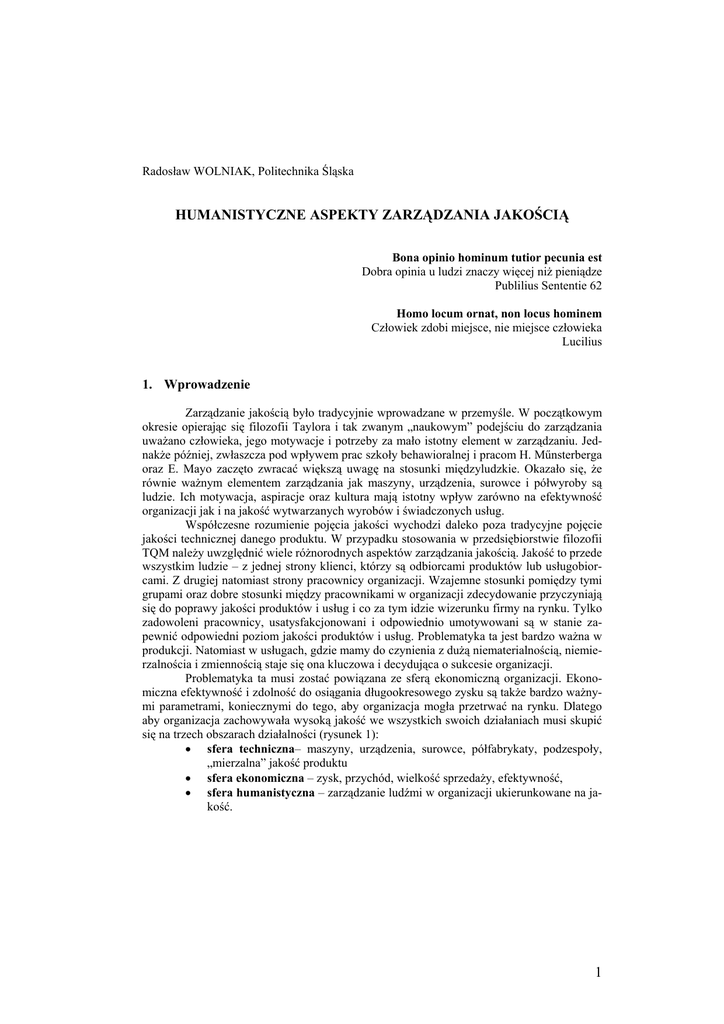 Radosław WOLNIAK, Politechnika Śląska HUMANISTYCZNE ASPEKTY ZARZĄDZANIA JAKOŚCIĄ Bona opinio hominum tutior pecunia est Dobra opinia u ludzi znaczy więcej niż pieniądze Publilius Sententie 62 Homo locum ornat, non locus hominem Człowiek zdobi miejsce, nie miejsce człowieka Lucilius 1. Wprowadzenie Zarządzanie jakością było tradycyjnie wprowadzane w przemyśle. W początkowym okresie opierając się filozofii Taylora i tak zwanym „naukowym” podejściu do zarządzania uważano człowieka, jego motywacje i potrzeby za mało istotny element w zarządzaniu. Jednakże później, zwłaszcza pod wpływem prac szkoły behawioralnej i pracom H. Műnsterberga oraz E. Mayo zaczęto zwracać większą uwagę na stosunki międzyludzkie. Okazało się, że równie ważnym elementem zarządzania jak maszyny, urządzenia, surowce i półwyroby są ludzie. Ich motywacja, aspiracje oraz kultura mają istotny wpływ zarówno na efektywność organizacji jak i na jakość wytwarzanych wyrobów i świadczonych usług. Współczesne rozumienie pojęcia jakości wychodzi daleko poza tradycyjne pojęcie jakości technicznej danego produktu. W przypadku stosowania w przedsiębiorstwie filozofii TQM należy uwzględnić wiele różnorodnych aspektów zarządzania jakością. Jakość to przede wszystkim ludzie – z jednej strony klienci, którzy są odbiorcami produktów lub usługobiorcami. Z drugiej natomiast strony pracownicy organizacji. Wzajemne stosunki pomiędzy tymi grupami oraz dobre stosunki między pracownikami w organizacji zdecydowanie przyczyniają się do poprawy jakości produktów i usług i co za tym idzie wizerunku firmy na rynku. Tylko zadowoleni pracownicy, usatysfakcjonowani i odpowiednio umotywowani są w stanie zapewnić odpowiedni poziom jakości produktów i usług. Problematyka ta jest bardzo ważna w produkcji. Natomiast w usługach, gdzie mamy do czynienia z dużą niematerialnością, niemierzalnościa i zmiennością staje się ona kluczowa i decydująca o sukcesie organizacji. Problematyka ta musi zostać powiązana ze sferą ekonomiczną organizacji. Ekonomiczna efektywność i zdolność do osiągania długookresowego zysku są także bardzo ważnymi parametrami, koniecznymi do tego, aby organizacja mogła przetrwać na rynku. Dlatego aby organizacja zachowywała wysoką jakość we wszystkich swoich działaniach musi skupić się na trzech obszarach działalności (rysunek 1): • sfera techniczna– maszyny, urządzenia, surowce, półfabrykaty, podzespoły, „mierzalna” jakość produktu • sfera ekonomiczna – zysk, przychód, wielkość sprzedaży, efektywność, • sfera humanistyczna – zarządzanie ludźmi w organizacji ukierunkowane na jakość. 1 Niniejsza publikacja koncentruje się na humanistycznej sferze zarządzania organizacją. Przedstawia się w niej najważniejsze elementy humanistycznego podejścia do zarządzania jakością, oraz związki, jakie istnieją między techniczną, humanistyczna oraz ekonomiczna problematyką TQM. Sfera humanistyczna Sfera ekonomiczna Sfera techniczna TQM Rysunek 1. Elementy TQM Źródło: Opracowanie własne. 2. Przyczyny wzrostu znaczenia problematyki humanistycznej w zarządzaniu jakością Koncepcja TQM jest koncepcją skomplikowaną i wielowymiarową. Jest to koncepcja, której wdrażania trwa zwykle długo i nie przynosi od razu bezpośrednich, widocznych efektów. Wdrażanie jej wymaga początkowo ponoszenia licznych i długotrwałych nakładów na doskonalenie wszystkich aspektów funkcjonowania organizacji, a ich efekty stają się widoczne dopiero po bardzo długim okresie czasu. Jednakże TQM, to z pewnością koncepcja bardzo efektywna pozwalająca, przy prawidłowym wdrażaniu, na osiągnięcie niebagatelnych korzyści. Można na przykład podąć kilka przedsiębiorstw, które osiągnęły duże sukcesy podczas wdrażania filozofii TQM [7]: • firma Xeroxc zdołała w latach 80-tych obniżyć swoje koszty produkcji o 50% i zapewniła sobie tym samym przetrwanie w warunkach silnej konkurencji, • grupa Ritz-Carlton osiągnęła przeszło 99% zadowolenia klientów, • General Electric w roku 1999-tych wykazał 2mid dolarów oszczędności, co stanowiło 20% zysku firmy, • grupa tekstylna Milliken osiąga wysoką sprzedaż pomimo stosowania cen rynkowych o 15% wyższych od konkurencji dzięki wysokiemu poziomowi jakości produktów i usług. Wdrażając filozofię TQM bardzo łatwo popełnić błąd nie doceniając humanistycznych, ludzkich aspektów zarządzania. Jeśli skupimy się tylko i wyłącznie na problemach techniczno-produkcjnych nie będziemy w stanie odnieść trwałego sukcesu. Możliwe, że uda 2 nam się osiągnąć przejściowe sukcesy, że dokonamy znacznych usprawnień, ale tylko i wyłącznie nacisk na zarządzanie ludźmi zapewni trwałość odniesionego sukcesu. We współczesnym zarządzaniu problematyka zasobów ludzkich ma coraz większe znaczenie. Jest to spowodowane faktem rosnącego znaczenia zasobów ludzkich w zarządzaniu. W dzisiejszym świecie, w warunkach gospodarki opartej na wiedzy tylko zasoby intelektualne stają się niepodrabialne, nieimitowalne i mogą generować sukces organizacji. Inne zasoby, takie jak kapitał, czy urządzenia i maszyny produkcyjne stał się obecnie stosunkowo łatwy do nabycia. Dlatego firmy, które opierają się tylko i wyłącznie na zasobach materialnych nie osiągają obecnie trwałej przewagi konkurencyjnej. Jeśli uda im się osiągnąć przewagę rynkową, to konkurencja szybko imituje ich metody produkcji i nie pozwala na zdobycie dominującej pozycji na rynku. Stąd duża waga tych zasobów, które są nielimitowane i niemożliwe do podrobienia a przykładem takiego zasobu jest wiedza, którą posiadają nasi pracownicy, oraz ich umiejętność pracy w swym zespole. Bardzo ważną przyczyną, powodującą wzrost znaczenia zasobów ludzkich jest także rosnąca rola usług w procesie zarządzania. O ile proces produkcy