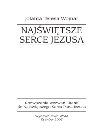 JAN PAWE£ II O LITANII DO NAJŒWIÊTSZEGO SERCA PANA JEZUSA „Miesi¹c czerwiec jest szczególnie poœwiêcony Boskiemu Sercu Jezusa. Wyra¿amy Mu nasz¹ mi³oœæ i czeœæ poprzez Litaniê, która przemawia szczególn¹ g³êbi¹ swych teologicznych treœci w poszczególnych wezwaniach”1. „Jest to wspania³a modlitwa w ca³oœci skupiona na tajemnicy wewnêtrznej Chrystusa: Boga-Cz³owieka. Litania do Serca Pana Jezusa czerpie obficie ze Ÿróde³ biblijnych, a równoczeœnie odzwierciedla najg³êbsze doœwiadczenia ludzkich serc. Jest to równie¿ modlitwa uwielbienia i autentycznego dialogu. (...) Modlitwa ta – odmawiana i rozwa¿ana – staje siê prawdziw¹ szko³¹ cz³owieka wewnêtrznego: szko³¹ chrzeœcijanina. (...) Równoczeœnie stajemy siê wra¿liwi na potrzebê zadoœæuczynienia. Chrystus otwiera ku nam swe 7 Serce, abyœmy w Jego zadoœæuczynieniu zjednoczyli siê z Nim dla zbawienia œwiata”2 . „Tylko Mi³oœæ, któr¹ objawia Serce Chrystusa, jest zdolna przemieniæ serce cz³owieka i otworzyæ je na ca³y œwiat, by uczyniæ je bardziej ludzkim i Bo¿ym. (...) Tylko ludzie «w mi³oœci wkorzenieni i ugruntowani» (Ef 3, 17) potrafi¹ przeciwstawiæ siê cywilizacji œmierci i tworzyæ na gruzach nienawiœci, pogardy i przemocy cywilizacjê, która ma swoje Ÿród³o w Sercu Zbawiciela”3. „Ono jest odwiecznym Ÿród³em, z którego ka¿dy wierz¹cy i ca³y Koœció³ wci¹¿ na nowo czerpi¹ moc wiary, nadziei i mi³oœci”4. „Cieszê siê, ¿e ta pobo¿na praktyka, aby codziennie w miesi¹cu czerwcu odmawiaæ albo œpiewaæ Litaniê do Najœwiêtszego Serca Pana Jezusa, jest w Polsce taka ¿ywa i ci¹gle podtrzymywana!”5. „Przybli¿ajcie do «tego Ÿród³a ¿ycia i œwiêtoœci» osoby, rodziny, wspólnoty parafialne, œrodowiska, aby mog³y z niego czerpaæ «niezg³êbione bogactwo Chrystusa» (Ef 3, 8)”6. „Czciciele Serca Jezusowego staj¹ siê ludŸmi wra¿liwego sumienia. A kiedy dane im jest trwale 8 obcowaæ z Sercem naszego Pana i Mistrza, rozbudza siê w nich tak¿e potrzeba wynagrodzenia za grzechy œwiata, za obojêtnoœæ tylu serc, za w³asne zaniedbania. O jak¿e bardzo potrzebny jest w Koœciele ten zastêp serc czuwaj¹cych, dziêki którym mi³oœæ Serca Bo¿ego nie pozostanie osamotniona i nieodwzajemniona!”7.