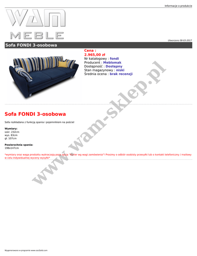 Informacje o produkcie Utworzono 08-03-2017 Sofa FONDI 3-osobowa Sofa FONDI 3-osobowa am Sofa rozkładana z funkcją spania i pojemnikiem na pościel -s k le p. Nr katalogowy : fondi Producent : Meblomak Dostępność : Dostępny Stan magazynowy : niski Średnia ocena : brak recenzji pl Cena : 2.965,00 zł Wymiary: szer. 232cm wys. 83cm gł. 107cm .w Powierzchnia spania: 198x147cm w w w *wymiary oraz waga produktu wykraczają poza opcję "Kurier wg wagi zamówienia"! Prosimy o odbiór osobisty przesyłki lub o kontakt telefoniczny / mailowy w celu indywidualnej wyceny wysyłki* Wygenerowano w programie www.oscGold.com