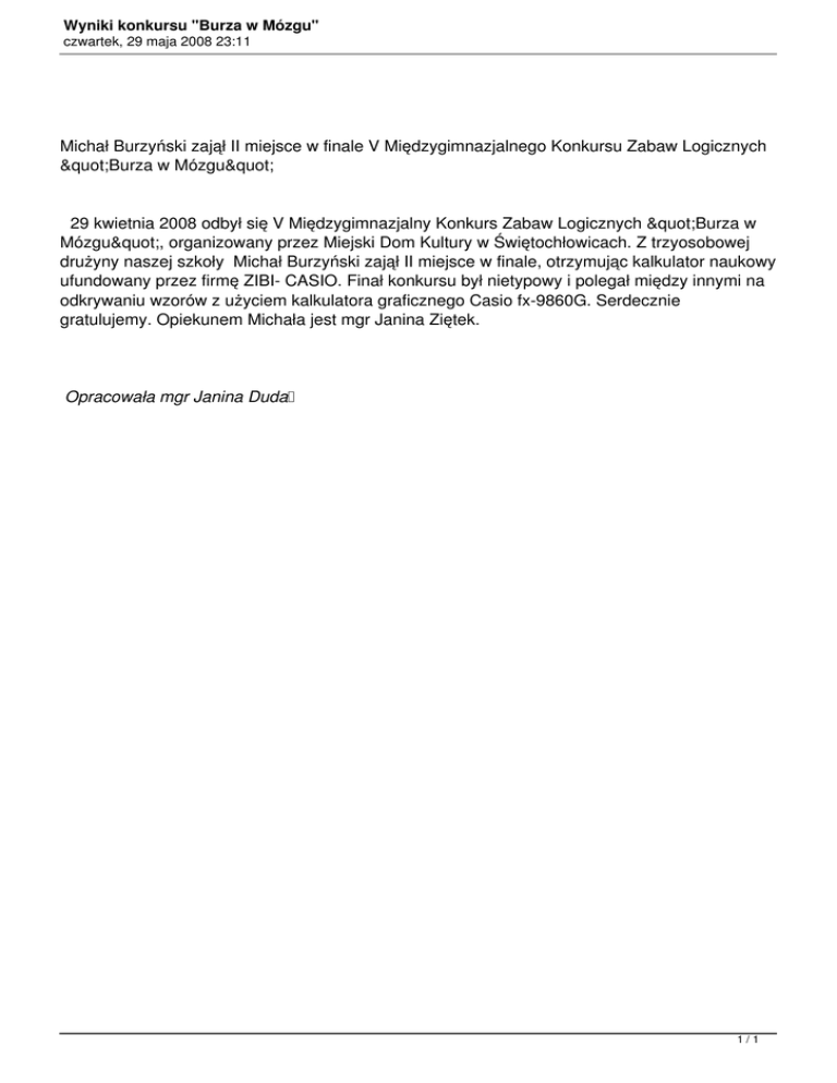 Wyniki konkursu "Burza w Mózgu" czwartek, 29 maja 2008 23:11 Michał Burzyński zajął II miejsce w finale V Międzygimnazjalnego Konkursu Zabaw Logicznych "Burza w Mózgu" 29 kwietnia 2008 odbył się V Międzygimnazjalny Konkurs Zabaw Logicznych "Burza w Mózgu", organizowany przez Miejski Dom Kultury w Świętochłowicach. Z trzyosobowej drużyny naszej szkoły Michał Burzyński zajął II miejsce w finale, otrzymując kalkulator naukowy ufundowany przez firmę ZIBI- CASIO. Finał konkursu był nietypowy i polegał między innymi na odkrywaniu wzorów z użyciem kalkulatora graficznego Casio fx-9860G. Serdecznie gratulujemy. Opiekunem Michała jest mgr Janina Ziętek. Opracowała mgr Janina Duda 1/1