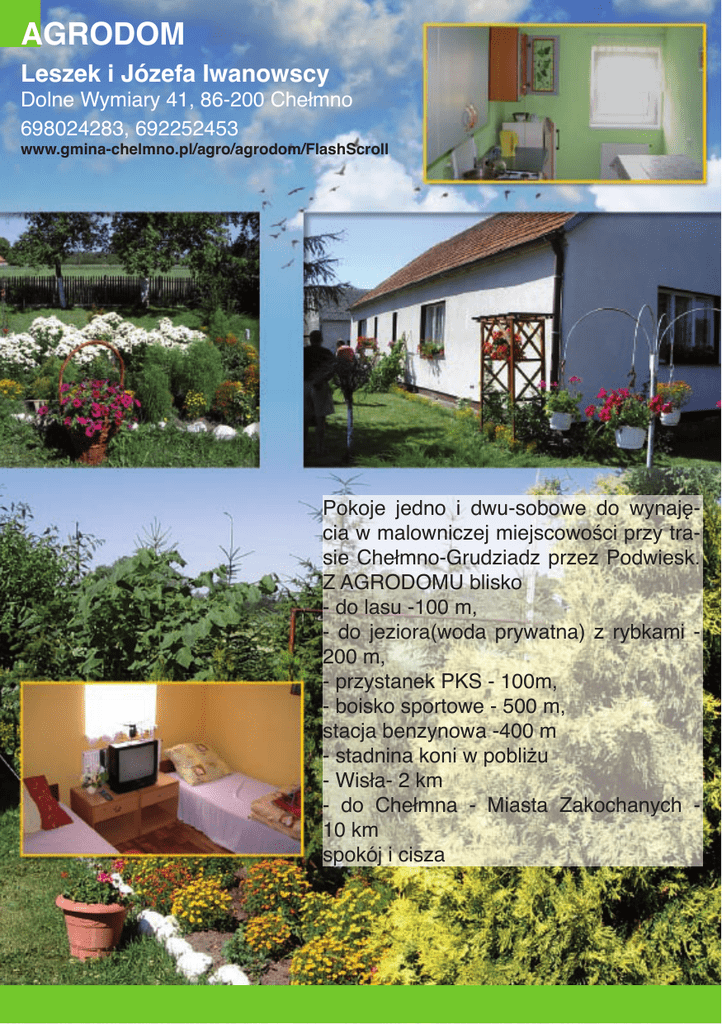 AGRODOM Leszek i Józefa Iwanowscy Dolne Wymiary 41, 86-200 Chełmno 698024283, 692252453 www.gmina-chelmno.pl/agro/agrodom/FlashScroll Pokoje jedno i dwu-sobowe do wynajęcia w malowniczej miejscowości przy trasie Chełmno-Grudziadz przez Podwiesk. Z AGRODOMU blisko - do lasu -100 m, - do jeziora(woda prywatna) z rybkami 200 m, - przystanek PKS - 100m, - boisko sportowe - 500 m, stacja benzynowa -400 m - stadnina koni w pobliżu - Wisła- 2 km - do Chełmna - Miasta Zakochanych 10 km spokój i cisza